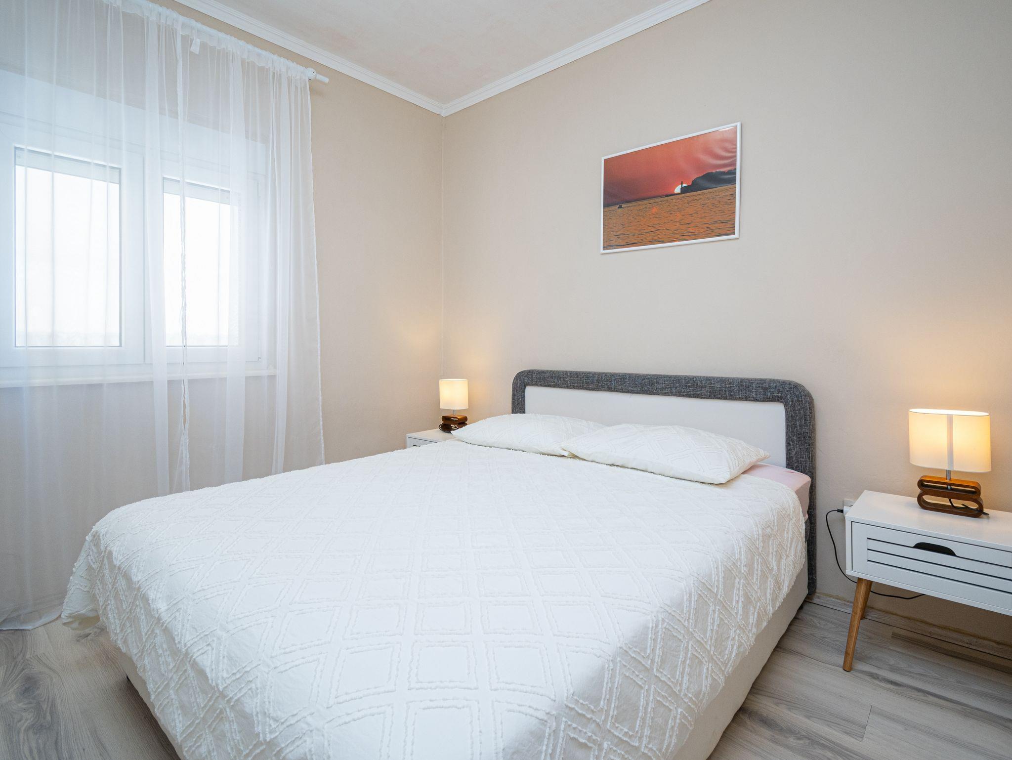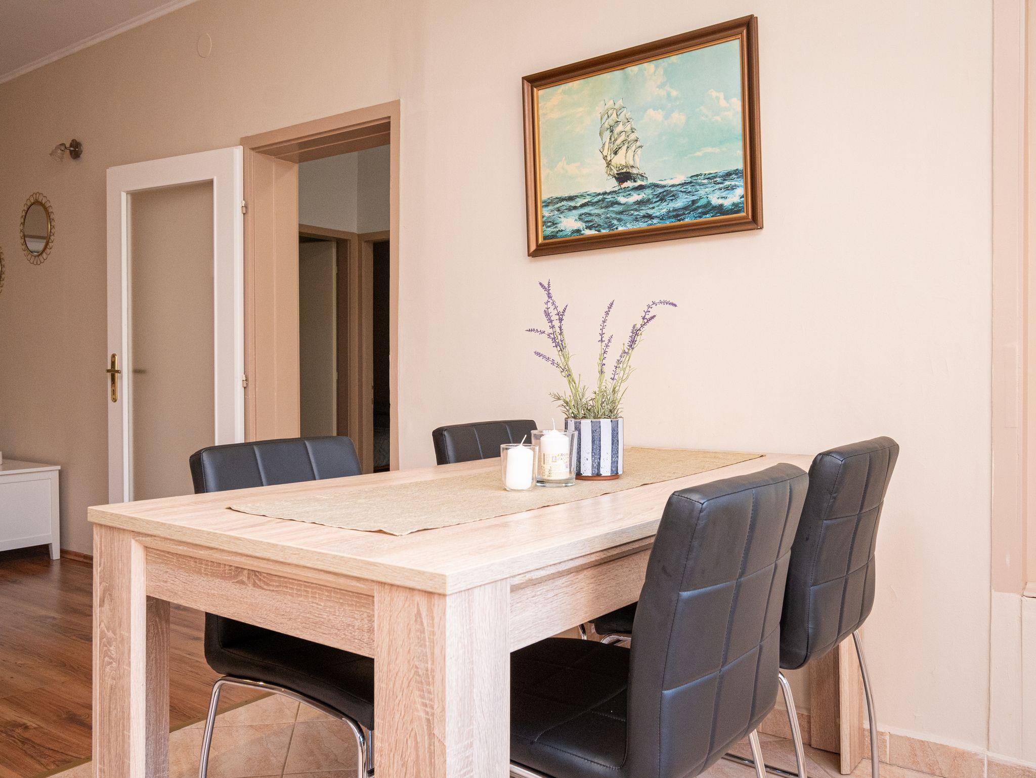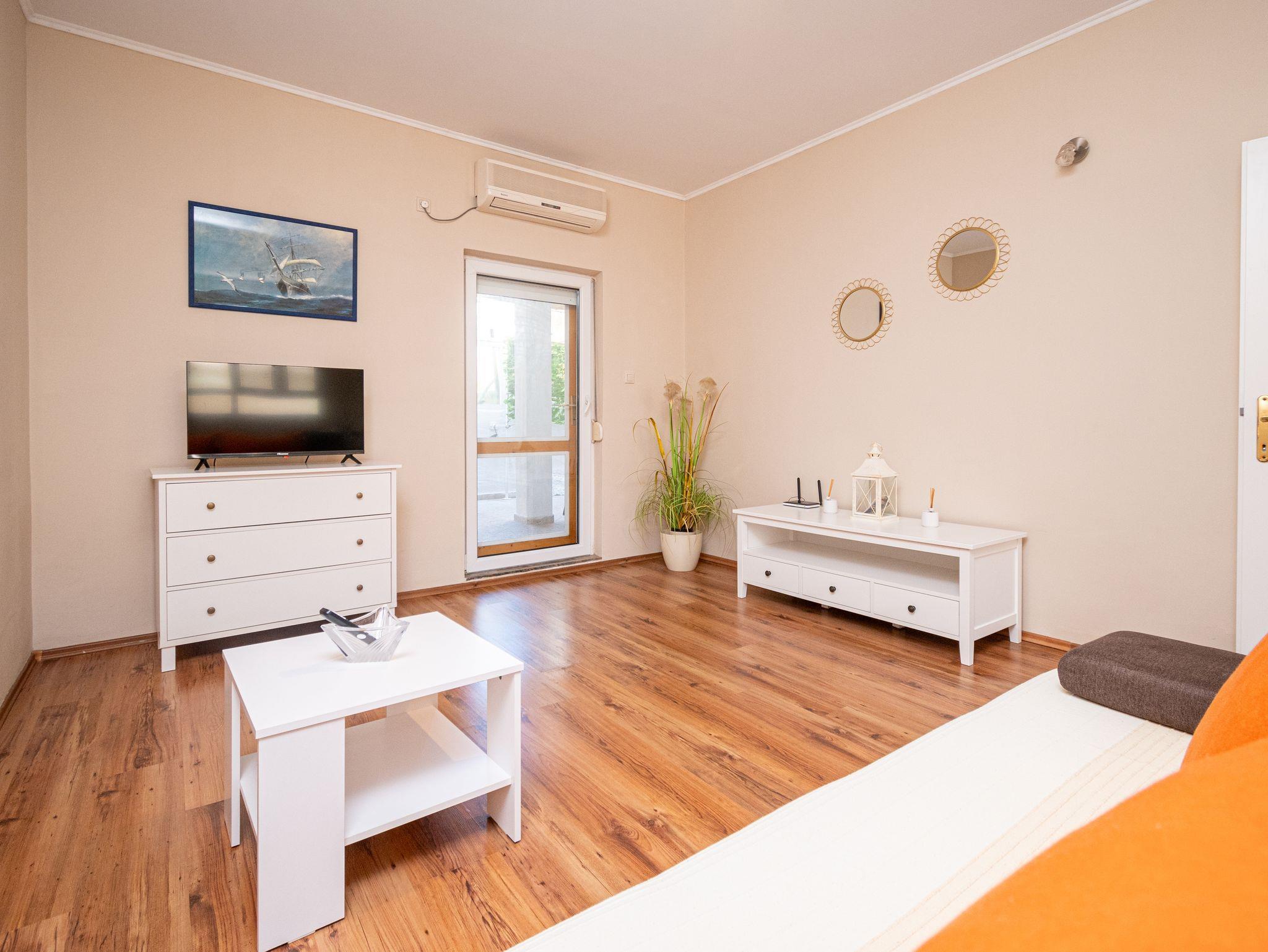 Ferienwohnung bietet Platz für 4 Gäste. Die Betten sind in Schlafzimmern, die es 2 gibt, innerhalb einer Gesamtfläche von 63m2, angeordnet. Die Gäste haben eine eigene Terrasse zur Verfügung, auf der sie in warmen Sommernächten genießen können. Es ist erlaubt, Speisen auf dem Gemeinschafts-Grill vorzubereiten. IM PREIS INBEGRIFFEN: Kurtaxe, Endreinigung, Klimatisierung, Parkplatz, Internet, Wäschewaschen, Kinderbett, Bügeleisen, Bügelbrett, Föhn, tragbarer Grill. VERBINDLICHE ZUSÄTZLICHE KOSTEN: Aufzahlung für Kurzaufenthalte (prozentualer Zuschlag pro Nächtigungsanzahl: 30% - 1, 20% - 2, 10% - 3). Die Verfügbarkeit zusätzlicher Dienstleistungen in Ihrem reservierten Termin und die Preise derselben (falls nicht aufgeführt) müssen im Voraus überprüft werden. Zusätzliche Dienstleistungen die in der Zahlungsaufforderung nicht aufgeführt sind werden direkt beim Vermieter bezahlt, angenommen der Gast nutzt auch diese. Ermäßigung auf den Grundpreis: Gratistag 14=13 (bei einem Aufenthalt von 14 Tagen oder mehr erhalten Sie einen Gratistag für den Aufenthalt bis 31.12.26).