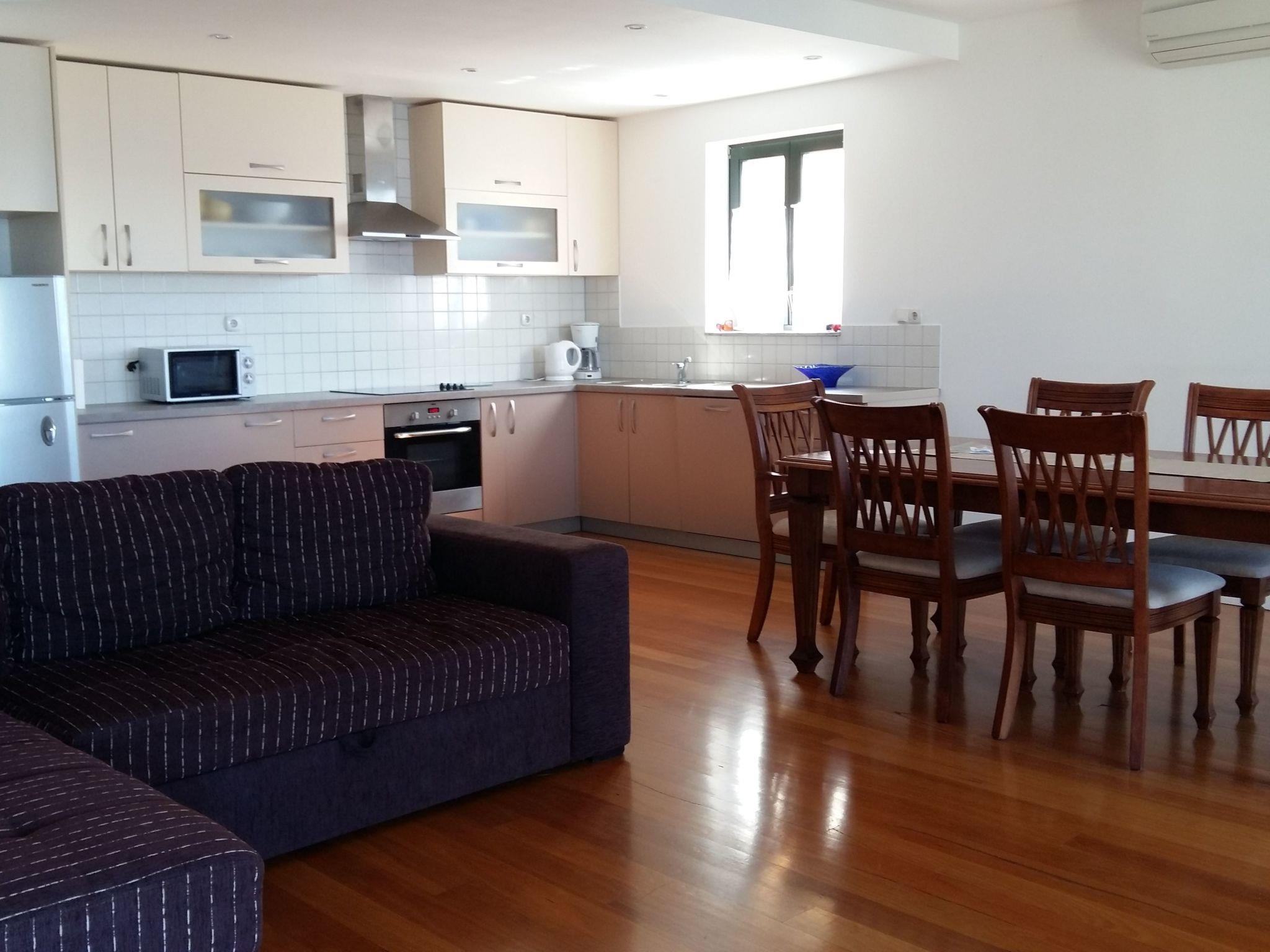 The living room has an open layout and comprises a fully-equipped kitchen with a hob, oven, microwave, refrigerator and dishwasher. The living and dining room has a dining table with chairs for six persons, a comfortable sofa bed for two people and a flatscreen TV with satellite channels. Heating, air conditioning and wireless Internet access are available. The bathroom has a shower and there is also another separate guest toilet. An additional bed for a baby or a child can be provided free of charge.