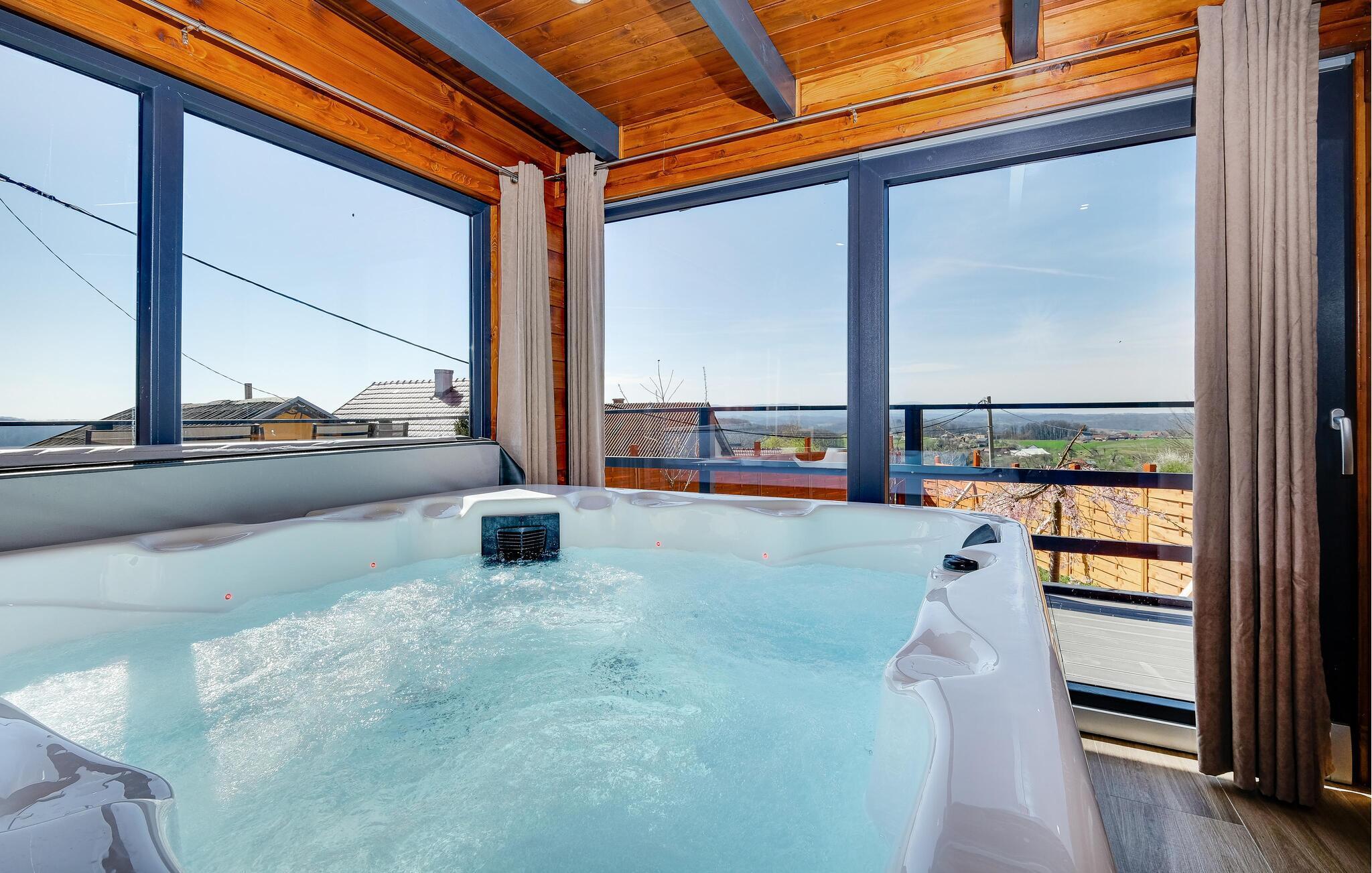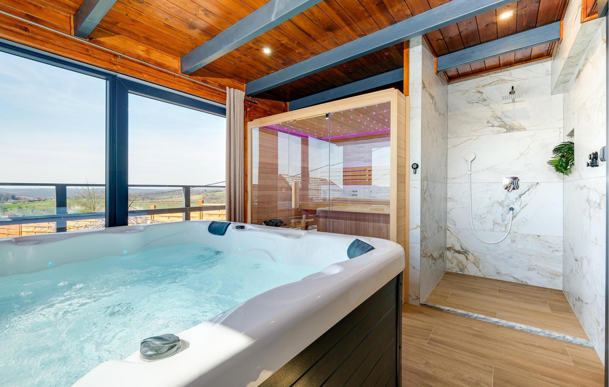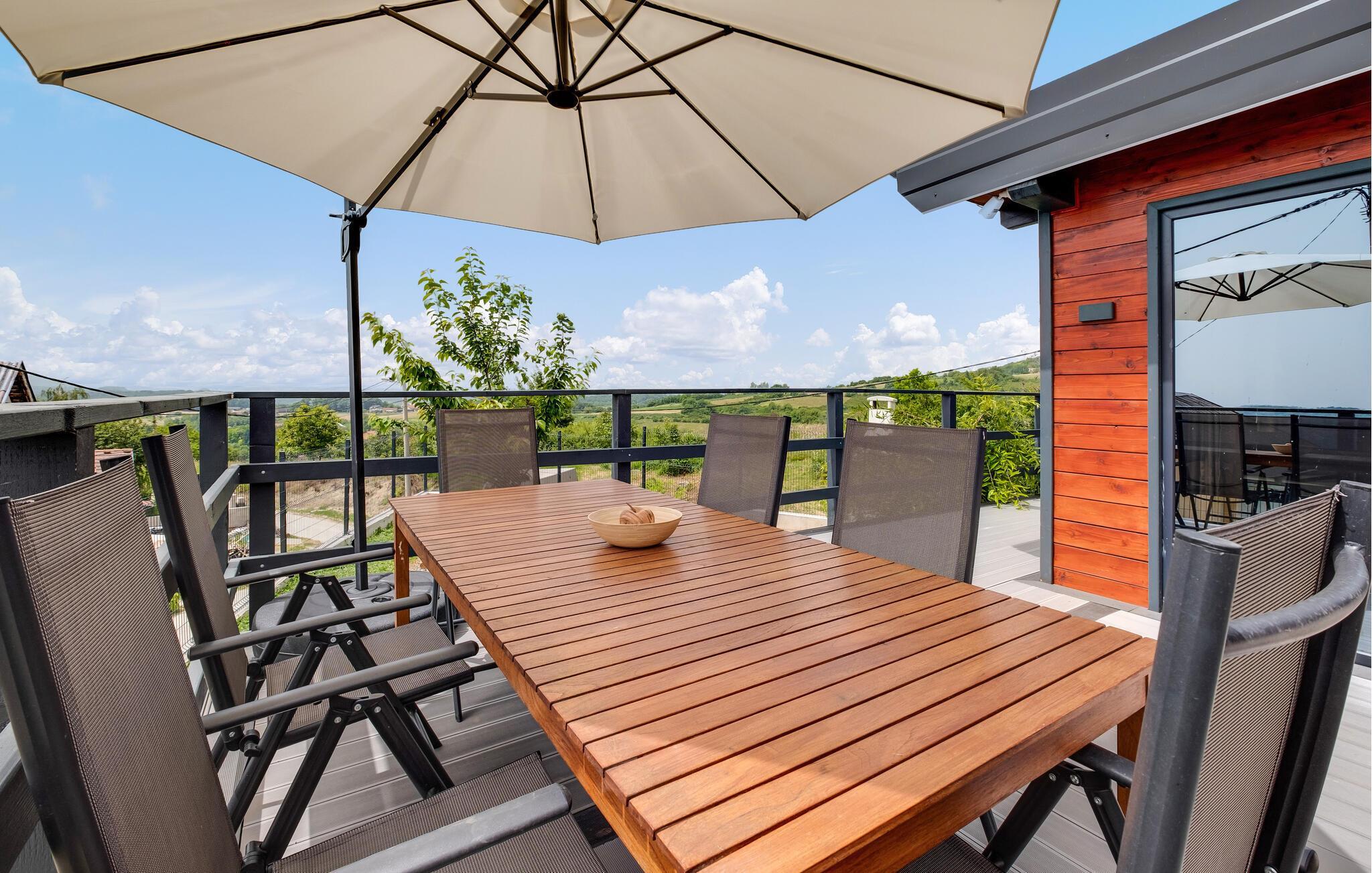 Dette sjarmerende trehuset i Visoko inviterer deg til å flykte fra hverdagens kjas og mas og slappe av i fred og ro. Det stilfullt innredede interiøret byr på moderne komfort, mens det luksuriøse boblebadet og badstuen med utsikt sørger for beroligende avslapning. Den romslige stuen og de koselige soverommene gjør huset ideelt for familier og par.