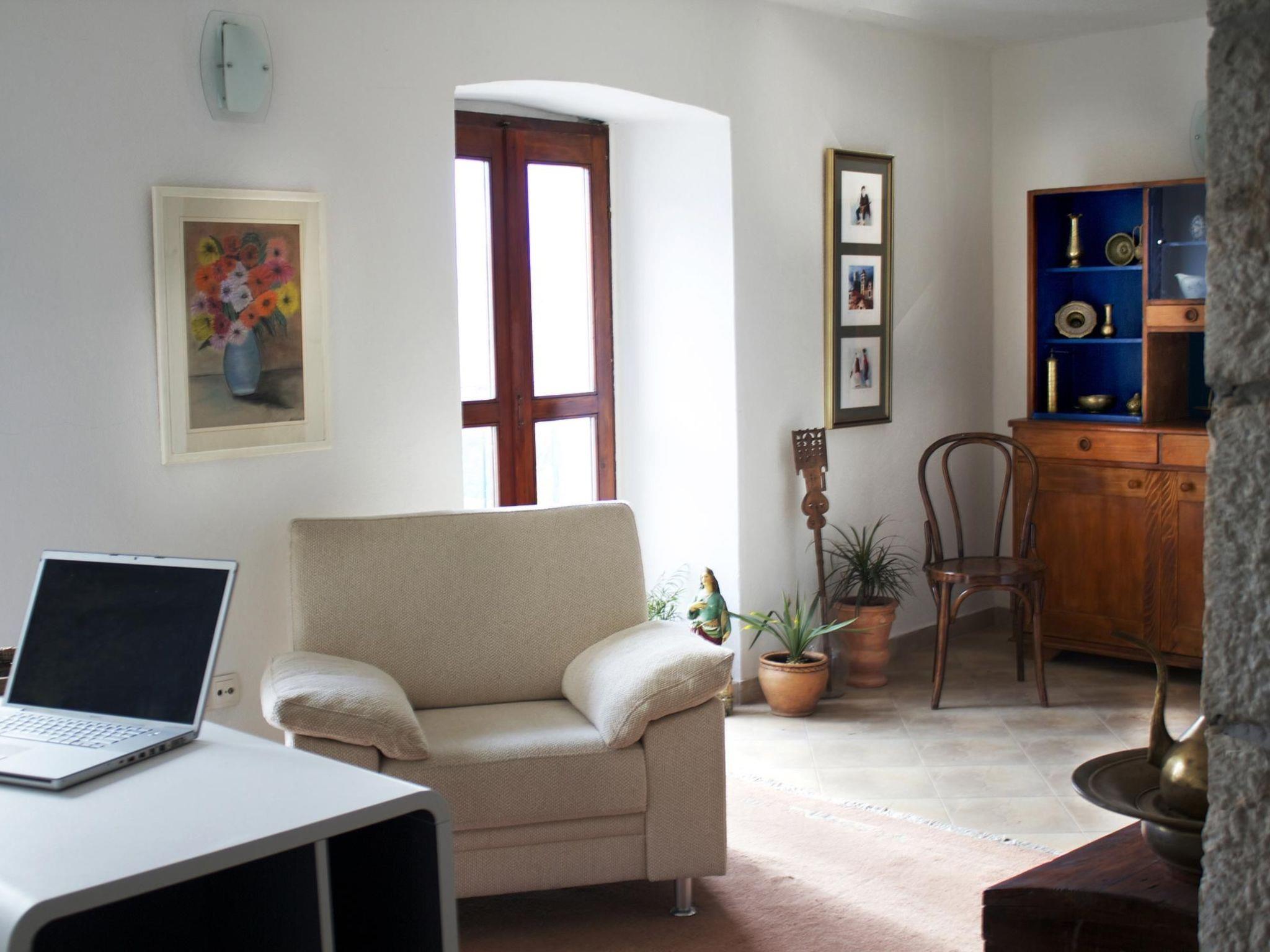 The traditional stone villa was built in 1902 and has only recently been completely renovated in 2014 when it was tastefully furnished and equipped with all the modern comforts you might need for a memorable holiday. A small flower lined path starts at the small village church of Saint Barbara and leads to a set of cobble stone stairs which give access to the villa. Spread over three floors it offers a generous living-/dining area, a fully fitted open plan kitchen, two bedrooms, two bathrooms and a guest toilet. All the rooms have crisp white walls and dark wood floors which create an atmosphere of modern elegance. The ground floor hosts a small study, the dining area and a guest toilet. The dining area, with a large table and six upholstered chairs, and the open plan kitchen are separated by a generous breakfast bar. The kitchen is complete with a dishwasher, four hob gas cooker, oven, microwave, fridge with freezer compartment, coffee machine, electric kettle and a toaster. A wide wooden staircase leads to the first floor which features a living area furnished with two stylish white sofas and matching armchairs, a large digital flat screen cable television with USB port, a DVD player, a CD player, a radio and a land line phone. Behind the seating area is a 180 cm x 200 cm double bed and a large built-in wardrobe providing plenty of space for your clothes and luggage. The bright and airy first floor bathroom offers a bathtub with shower device, large wash basin with wall mirror and a toilet. Another staircase leads to the attic with a living-/sleeping area and the second bathroom which is identically equipped as the one on the floor below. The living area is furnished with a sofa and armchairs, another digital flat screen cable television and a 160 cm x 200 cm double bed. The sofa can be extended into an additional 160 cm x 200 cm double bed offering sleeping space for two children. Reliable WLAN internet access is offered in all rooms free of charge.