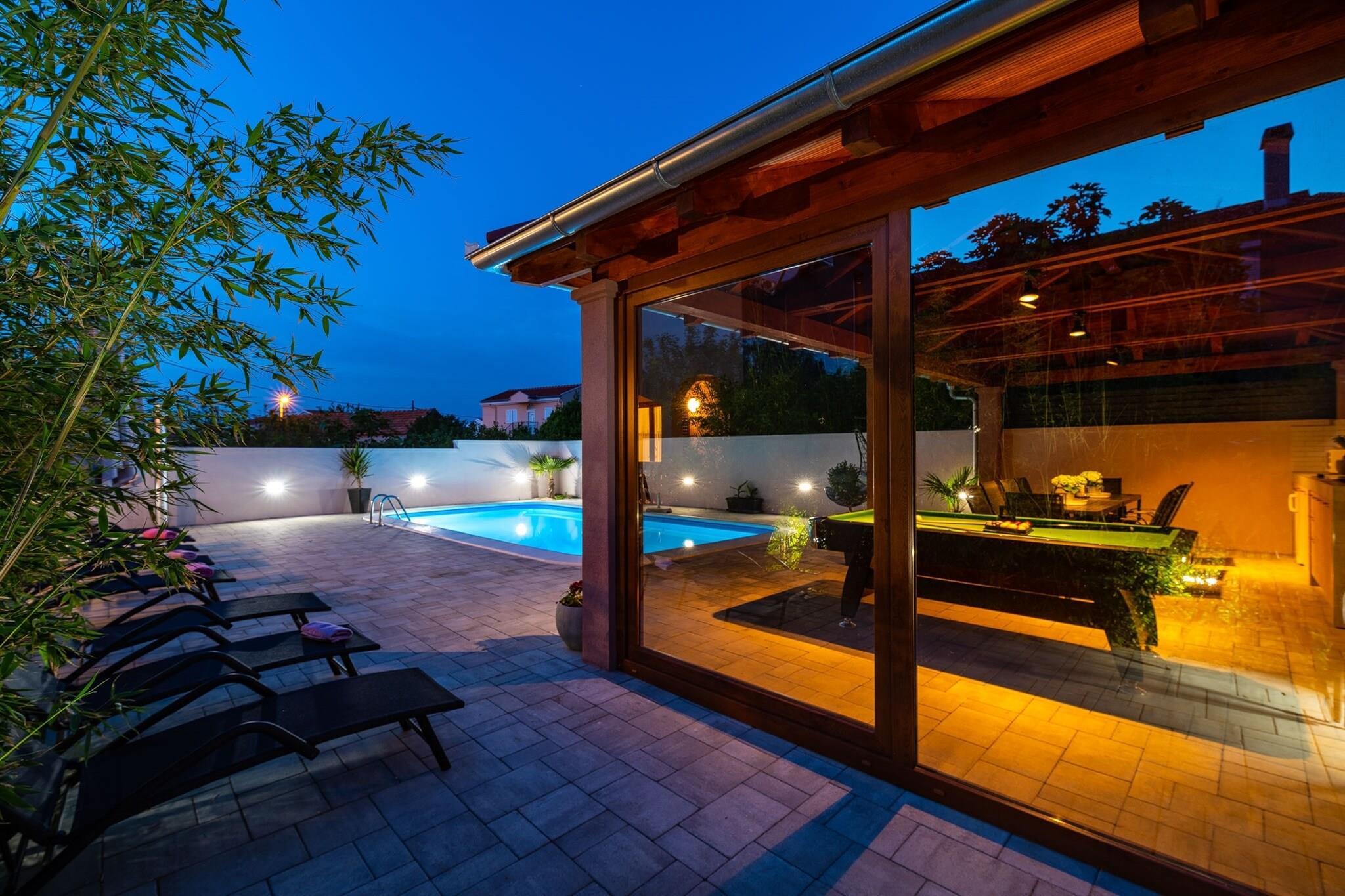 Villa Zaton ligger 15 km fra Zadars gamleby, i et område kjent for sine sandstrender som passer for familier og barn. Dens 6 soverom og 4 bad gir en perfekt innkvartering for opptil 12 personer. Det er 2 fullt utstyrte moderne leiligheter til din disposisjon, samt et eget studio tilgjengelig fra utsiden. Hver av leilighetene har en fin balkong og det er en sjarmerende overbygd terrasse på baksiden av dette nyrenoverte huset. Der finner du et stort oppvarmet svømmebasseng med solsenger, soldusj og grill. Sykler er tilgjengelig for gjestene, og du kan også ha det gøy ved å spille biljard eller bordtennis. Villaen har aircondition, har en rask WiFi-tilkobling og nok parkeringsplasser tilbys. Den nærmeste matbutikken og en restaurant ligger bare nedover gaten, mens stranden ligger bare 500 meter unna. Den pittoreske byen Nin kan nås på noen få minutters kjøring. Der kan du gå til windsurfing skolen eller besøke en sandstrand allment kjent for sin Peloid medisinske gjørme. Den gamle byen Zadar med rik kulturminner ligger 20 minutter unna. Det viktigste klatresenteret i Kroatia, Paklenica nasjonalpark, kan nås innen 1 times kjøring, mens nasjonalparkene Krka, Plitvice innsjøer og Kornati øyene alle kan sees på en dags utflukt.