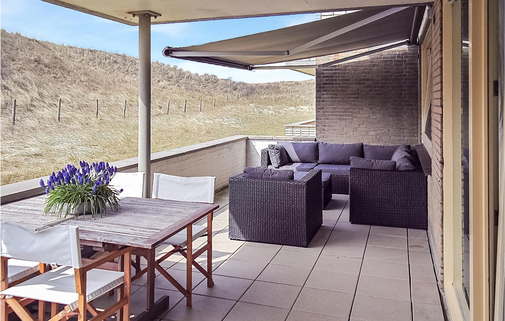 Den store balkongen (eller rettere sagt terrassen) har sol fra midt på dagen og er tilgjengelig fra stuen, men også fra ett av de to soverommene. Et ideelt sted å nyte solen med utsikt over sanddynene, overgrodd med strandgress.