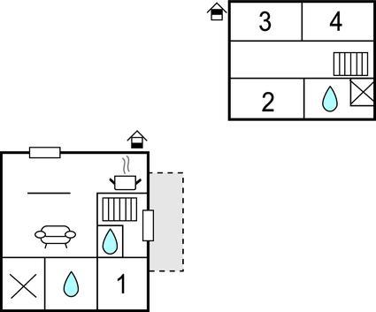 Den store fordelen med dette feriehuset er at det er et soverom i første etasje med egen dusj og toalett, slik at selv folk som har vanskeligheter med å gå kan ha en fin ferie her. Dette rommet har en enkeltseng med en uttrekkbar seng. I første etasje er det også et oppbevaringsrom, en gang, et gjestetoalett og et rom med vaskemaskin og tørketrommel.