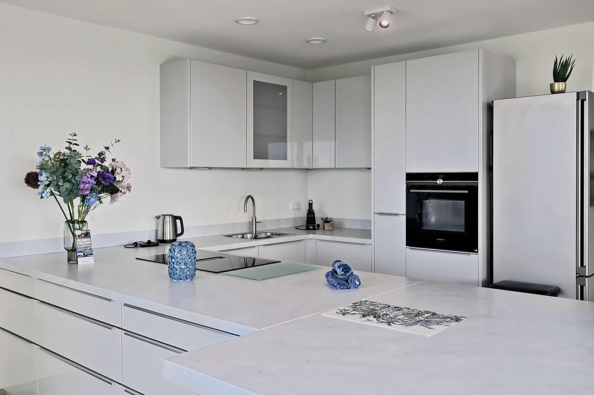 Sea Wave Panorama-leiligheten er den ideelle basen for et avslappende opphold ved sjøen. På grunn av hjørnebeliggenheten har du panoramautsikt over sanddynene, Vestschelde og Nordsjøen. Denne leiligheten passer for opptil 4 personer og har 2 soverom og 2 bad. Den ligger i åttende etasje i bygården, som har totalt 11 etasjer. Leiligheten er tilgjengelig via trapper og heis og har et bruksareal på ca 135 m2. Den moderne stuen til Sea Wave Panorama-leiligheten har en komfortabel sittegruppe hvor du kan slappe av med selskapet ditt. Det er en smart-TV med mulighet for streaming. Det er også en spiseplass og et åpent kjøkken som er fullt utstyrt, inkludert et barbord, Bora-komfyr, kjøleskap med fryser, kombiovn, Nespresso-maskin og oppvaskmaskin. Den romslige balkongen er utstyrt med utemøbler og strekker seg til siden av leiligheten. Du har utgang til balkong fra stue og begge soverom. Du kan våkne opp her med en kopp kaffe og beundre panoramautsikten over havet eller spise en hyggelig middag med selskapet om kvelden mens du nyter den vakre solnedgangen. En ultimat feriefølelse! Den koselige leiligheten har 2 soverom, hver med en dobbeltseng. Ett soverom har eget bad med dusjkabinett, servant og toalett. Det andre badet nås via gangen og har dusjkabinett og dobbel vask. Det er også et separat toalett i leiligheten. Du har også tilgang til bod med vaskemaskin-tørketrommel og parkeringsplass i underjordisk parkeringshus (maks høyde: 2,00 meter). Du har også tilgang til en generell, låsbar sykkelbod for din (el-)sykkel i det underjordiske parkeringshuset. Du kan også bruke Wi-Fi gratis. Utformingen av boligen kan variere. Plantegningene og bildene gir et godt inntrykk, men er kun ment som illustrasjon.