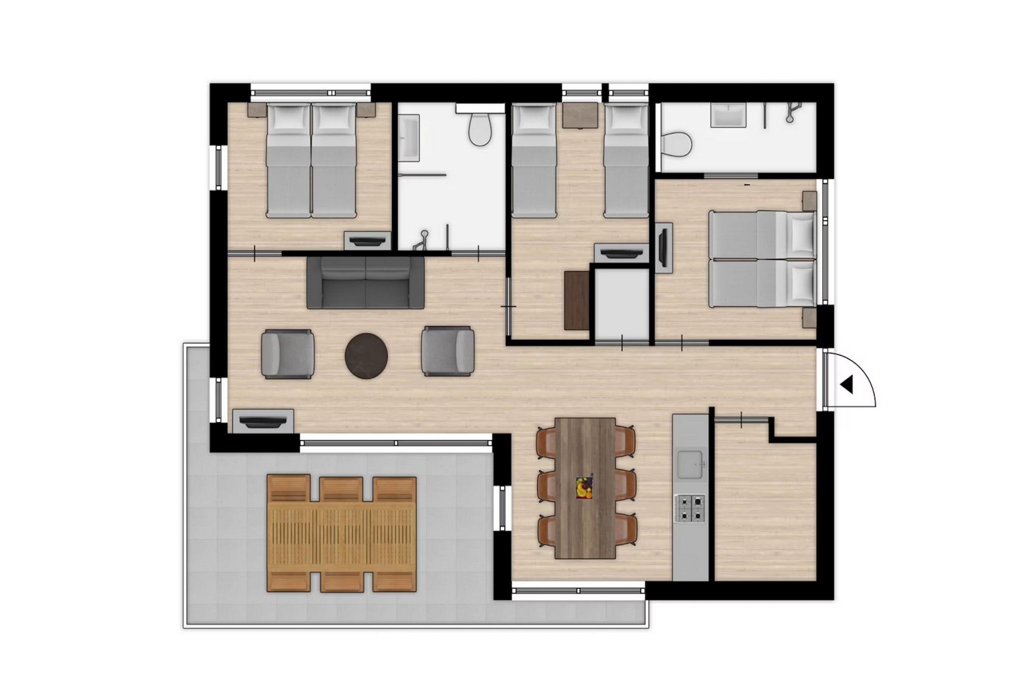 Første etasje: (entré, Stue(TV, oppvarming(gulvvarme)), åpent kjøkken(vannkoker, kaffetrakter(kaffepute), Kombi stekovn/mikrobølgeovn, oppvaskmaskin, kjøleskap(+ fryser)), soveværelse(Dobbeltseng eller 2 enkeltsenger, TV), soveværelse(Dobbeltseng eller 2 enkeltsenger, TV), soveværelse(Dobbeltseng eller 2 enkeltsenger, TV), bad(dusj, håndvask, toalett, oppvarming(gulvvarme)), bad(dusj, håndvask, toalett, oppvarming(gulvvarme)), oppbevaringsrom(tørketrommel, vaskemaskin)) oppvarming(sentral), terrasse, hage, hagemøbler, svømmebasseng(deles med andre gjester, overdekket)