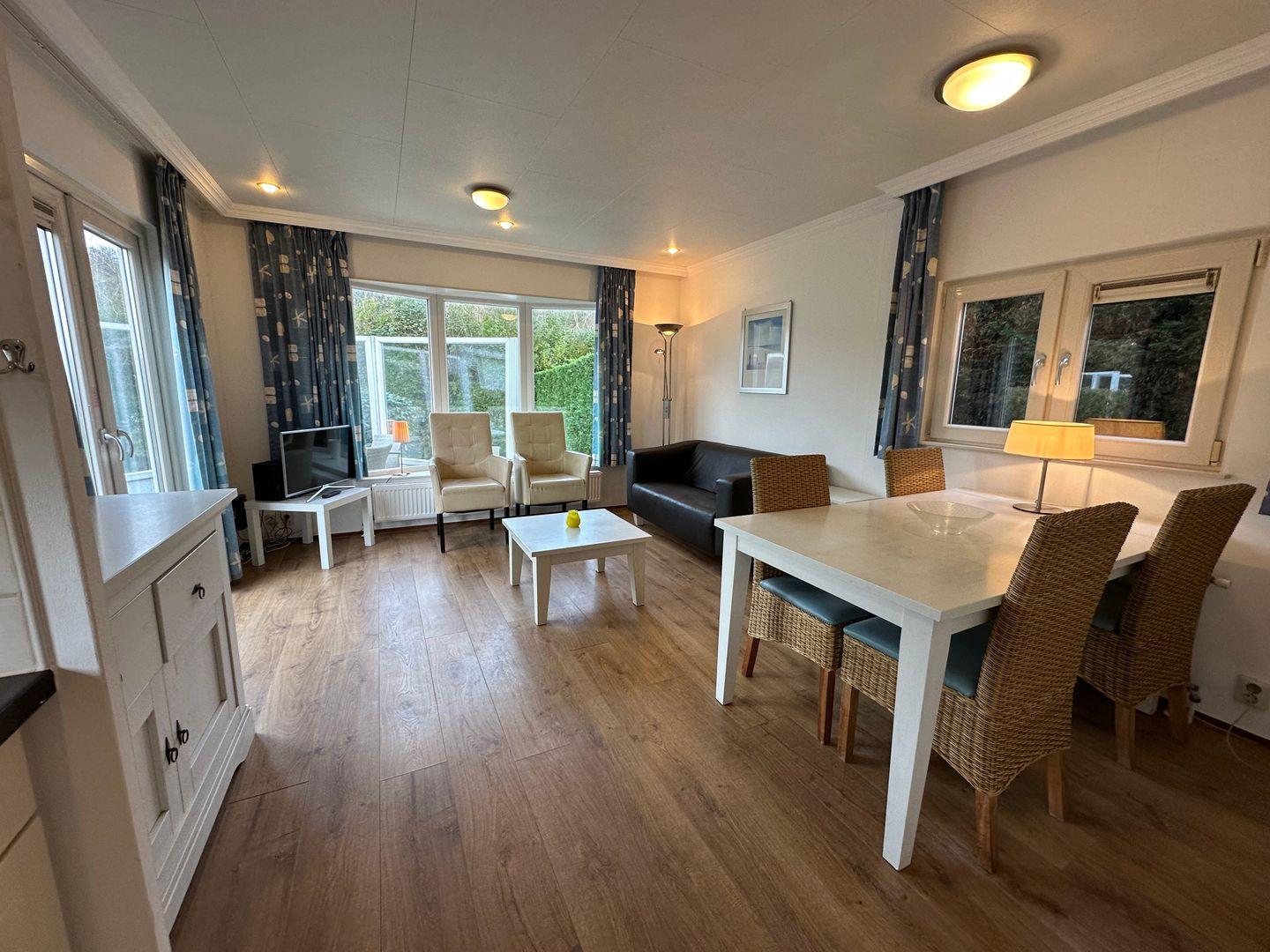 Das Chalet befindet sich in der beliebten Ferienanlage Schoneveld und verfügt über ein großzügiges, 310 m² großes Grundstück. Die helle, freundliche Atmosphäre im Inneren des Hauses wird durch große Fenster und den offenen Grundriss betont. Der offene Wohn- und Essbereich mit Sofa lädt zu entspannten Abenden ein. Für Unterhaltung sorgt ein großer Smart-TV (44–55 Zoll, mit internationalen Kanälen) sowie ein schnelles WLAN mit Internetgeschwindigkeit ab 100 Mbit/s. Ein Essplatz mit passendem Tisch und gemütlichen Sesseln bietet Raum für gemeinsame Mahlzeiten.