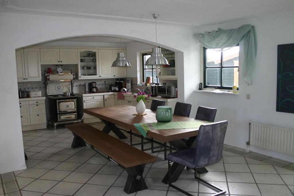 Ligger i den velholdte Buitenplaats feriepark (150 hus) som et stråtak hus i nederlandsk stil med en sør-vestvendt solterrasse og utsikt over innsjøen med en lekeplass øy. Fliser i fritidsboligen under og på badet over, i vinterhagen (15m2) og Clickvinyl over, gulvvarme og en ekstra gasspeis i stuen. Teppe kun under stuebordet. Det store spisebordet (2,8 m) med benk og stoler samt vinterhagen med 6 kurvstoler inviterer deg til å spise og leke i store grupper. Det store soverommet og et barnesoverom har store innebygde garderober for gjestenes bruk.
