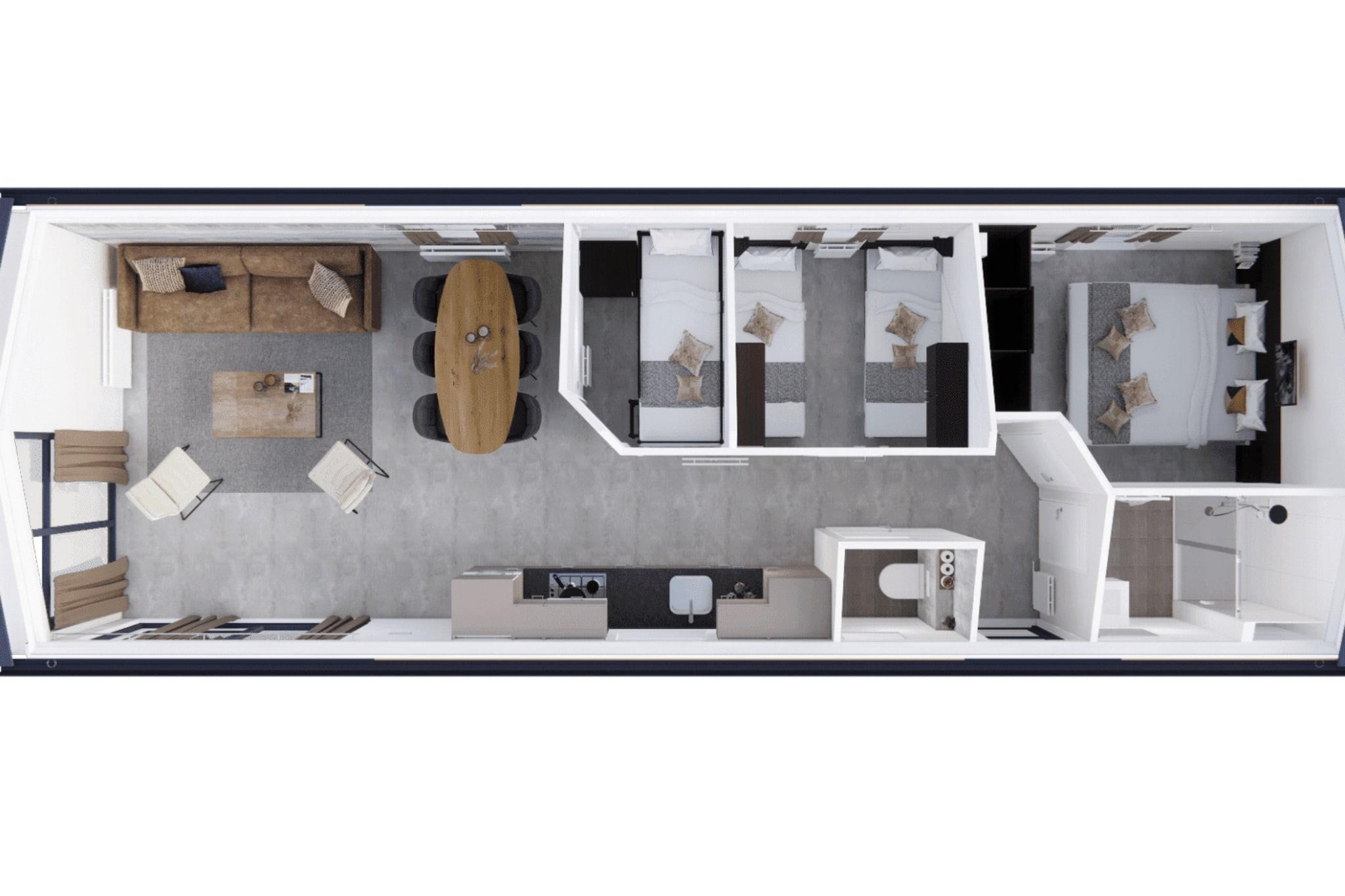 Stue(TV, spisebord(6 personer), sittehjørne), åpent kjøkken(vedovn(gass), vannkoker, kaffetrakter, stekovn, Kombi stekovn/mikrobølgeovn, kjøleskap med fryser, ), soveværelse(dobbeltseng), soveværelse(enkeltseng(dyn, 80 x 200 cm), enkeltseng(dyn, 80 x 200 cm)), soveværelse(køyeseng), bad(dusj, håndvask), WC(toalett), terrasse, hagemøbler, parkering