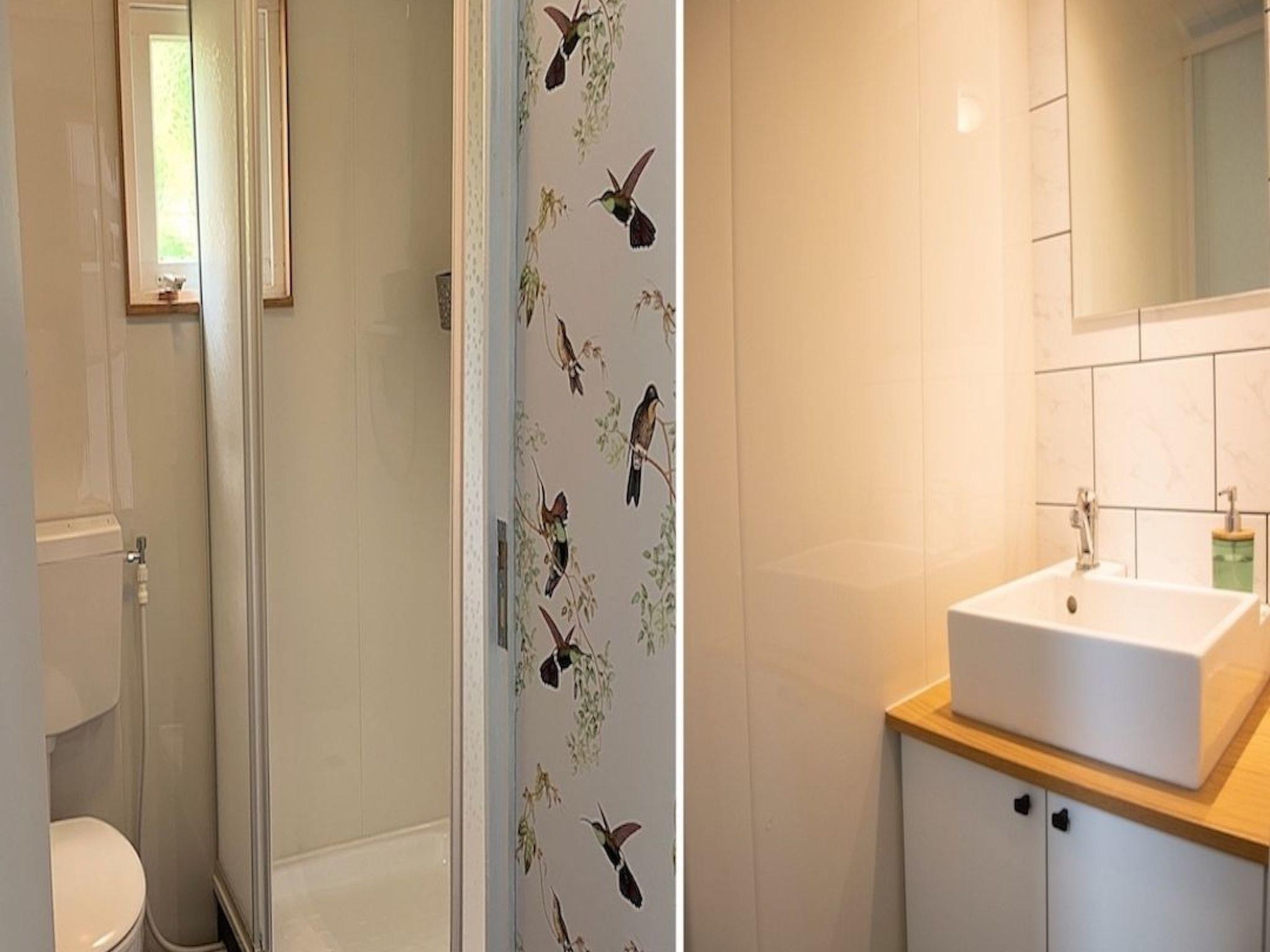 The neat bathroom has a spacious shower with thermostatic tap, washbasin and toilet with soft-close seat.