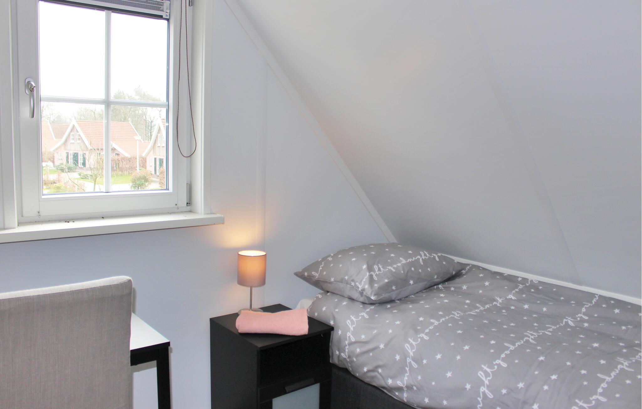 Dette attraktivt innredede feriehuset for 6 personer i Overijssel ligger i ferieparken Buitengoed Het Lageveld. I et vakkert skogsområde, i nærheten av Almelo og Enschede. Soverommet i første etasje fører til det tilstøtende badet. Soverommet har utsikt over den store hagen. I første etasje er det et fullt utstyrt kjøkken, en romslig stue og en bod med vaskemaskin og tørketrommel. I andre etasje er det to soverom, et bad med dusj og et separat toalett. Det er en gasspeis i stuen.