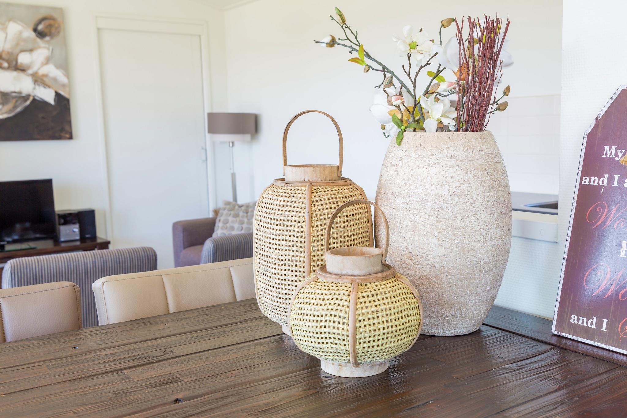 Første etasje: (åpent kjøkken(vannkoker, komfyr(gass), kaffetrakter(kaffetrakter), Kombi stekovn/mikrobølgeovn, oppvaskmaskin, kjøleskap(+ fryser)), Stue/spisestue(TV(flatskjerm), spisebord(4 personer), DVD-spiller), Sovrum med badrum(2x enkeltseng(dyn), TV, sammenleggbar barneseng, dusj(enhet), håndvask, toalett), Sovrum med badrum(2x enkeltseng(dyn), TV, dusj(enhet), håndvask, toalett)) tørketrommel, vaskemaskin, oppvarming(sentral), terrasse, hagemøbler, parkering, svømmebasseng(deles med andre gjester, overdekket), høy barnestol