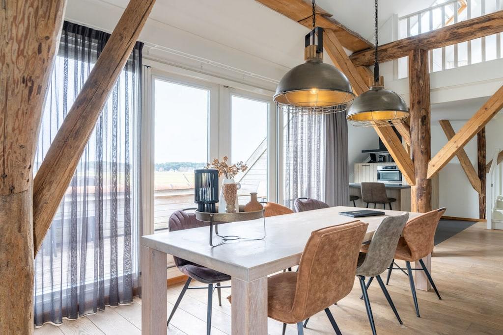 Denne leiligheten har to soverom i første etasje, hvorav det ene har eget bad. I første etasje er det også et separat toalett og et andre bad med boblebad, dobbel servant og dusj. Ovenpå finner du en romslig stue med vakre, autentiske detaljer. Det er et herlig sted å slappe av ved peisen, en følelse som forsterkes av den vakre utsikten utenfor. Det romslige kjøkkenet er fullt utstyrt. Det er også et separat toalett i denne etasjen. En fast trapp fører til mesaninen, som har plass til to enkeltsenger (90 x 200 cm).