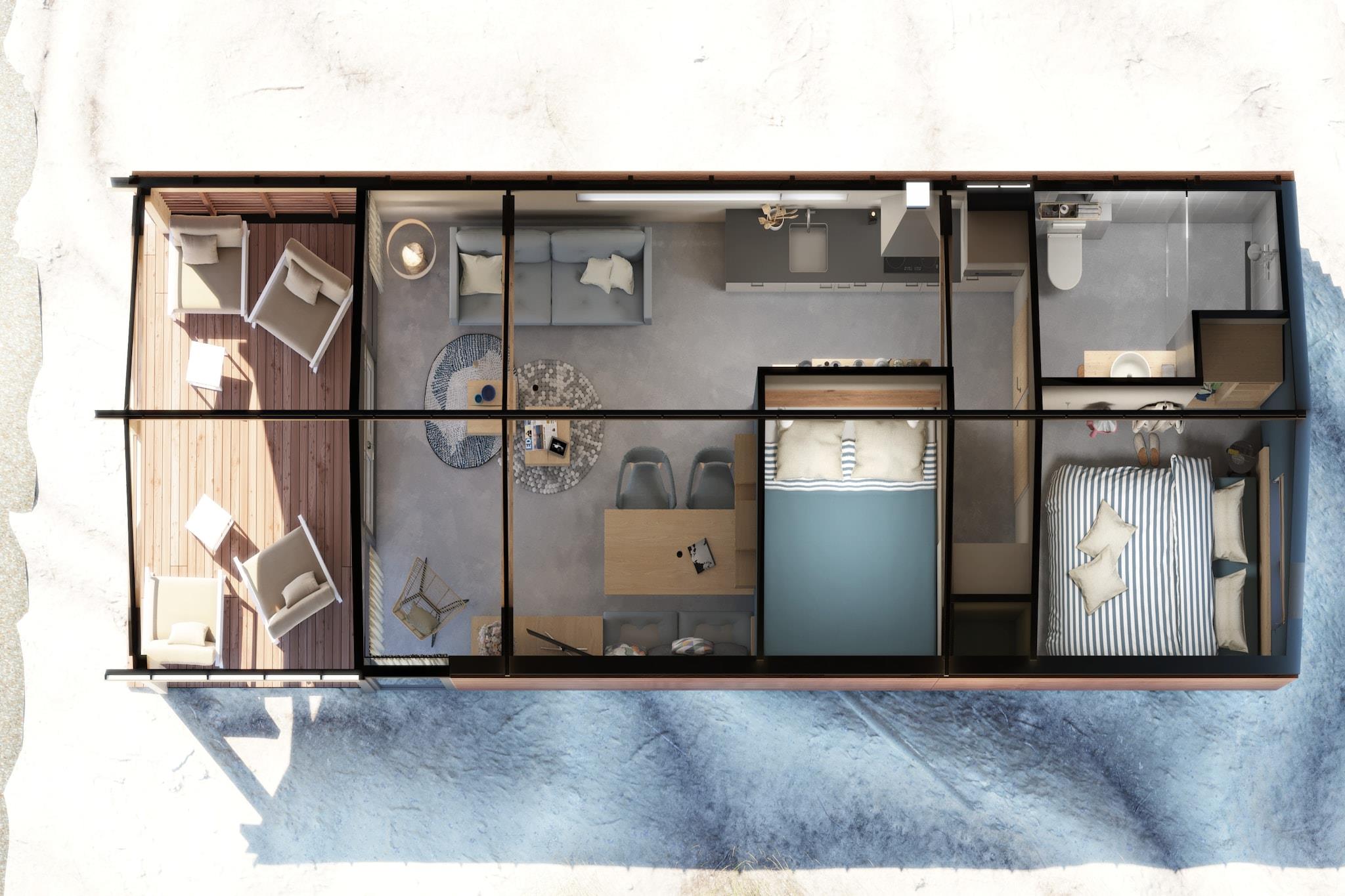 Første etasje: (Stue(TV, spisebord, sittehjørne), åpent kjøkken(vannkoker, kaffetrakter(kopper), Kombi stekovn/mikrobølgeovn, oppvaskmaskin, kjøleskap med fryser), soveværelse(Dobbeltseng eller 2 enkeltsenger, TV), bad(dusj(Frittstående dusj), håndvask, toalett), dobbeltseng med boksmadrasser, oppvarming(gulvvarme)) veranda, hage, hengekøye, terrassemøbler