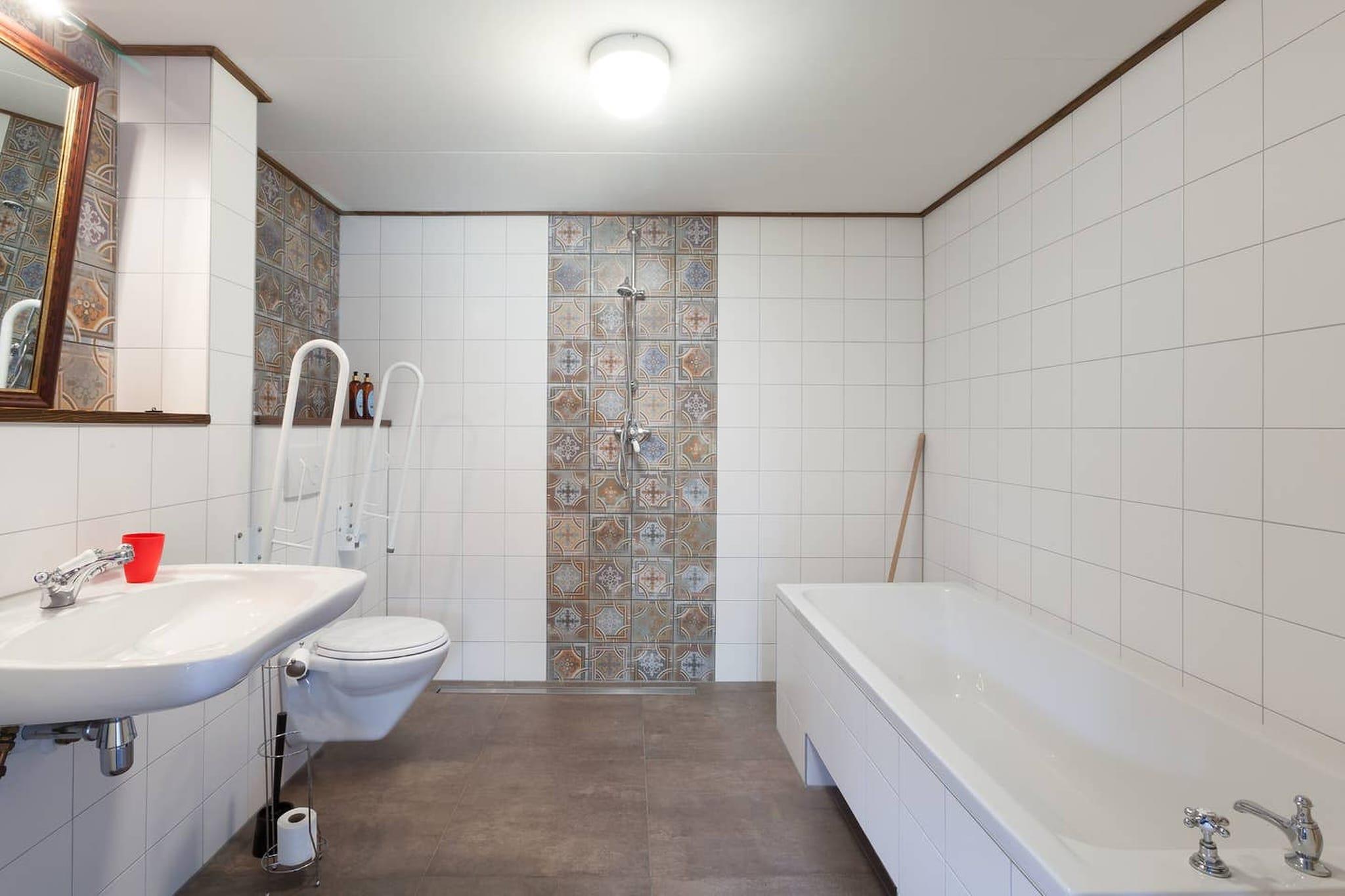 Første etasje: (åpent kjøkken(komfyr med kokeplater, vannkoker, kjøkkenvifte, espressomaskin, Kombi stekovn/mikrobølgeovn, oppvaskmaskin, kjøleskap), Stue/spisestue(TV, spisebord, sittehjørne), soveværelse(enkeltseng, enkeltseng tilpasset uføre), bad(badekar, dusj, håndvask, toalett(tilpasset uføre))) i 2. etasje: (soveværelse(Dobbeltseng eller 2 enkeltsenger(boksmadrass)), soveværelse(køyeseng), bad(dusj, håndvask), WC) kaffetrakter, mikrobølgeovn, tørketrommel(deles med andre gjester), badekar eller dusj, vaskemaskin(deles med andre gjester), terrasse, hage, sykkelparkering, hagemøbler, grill, trampoline, lekeområde, strykebrett