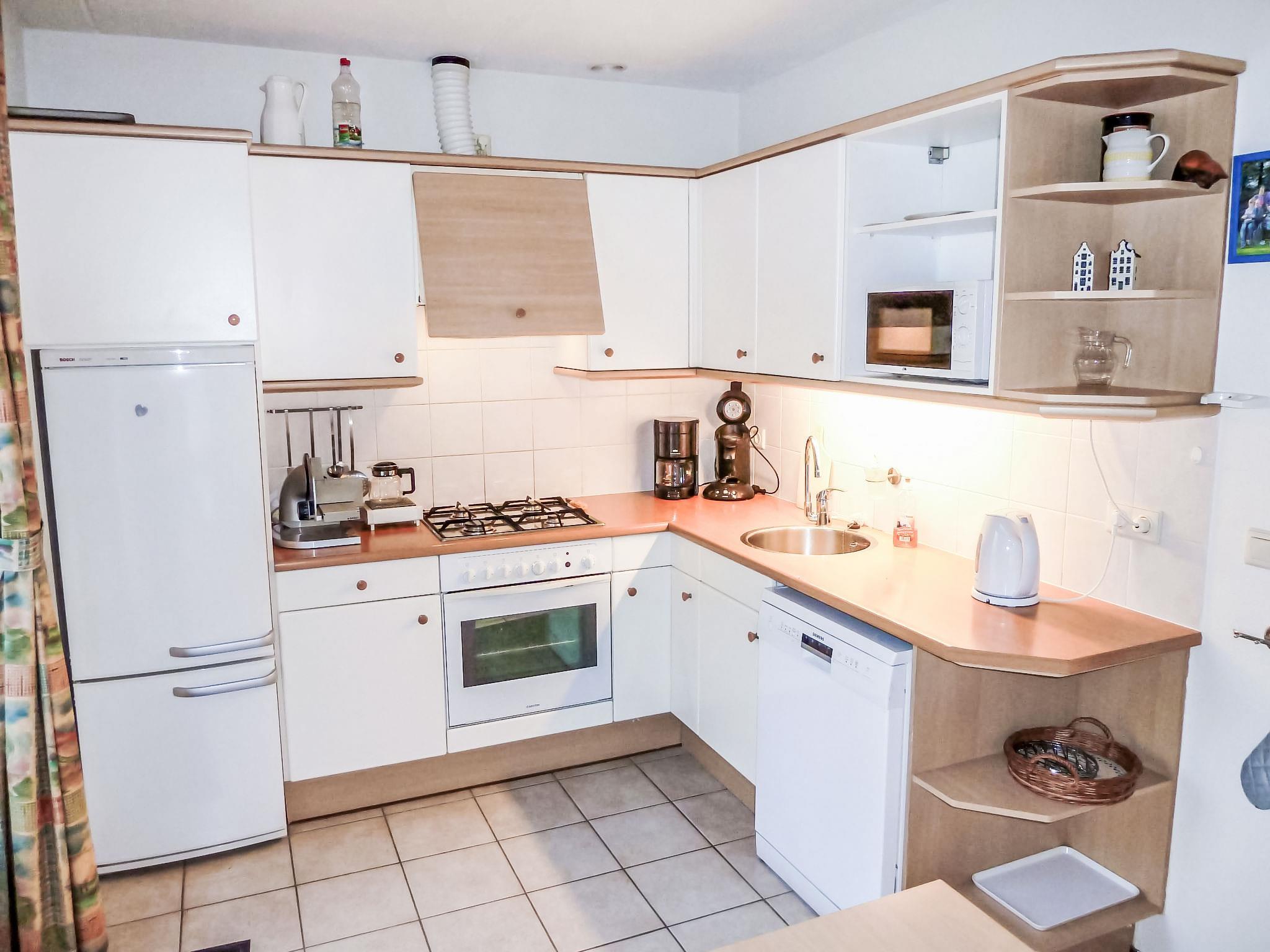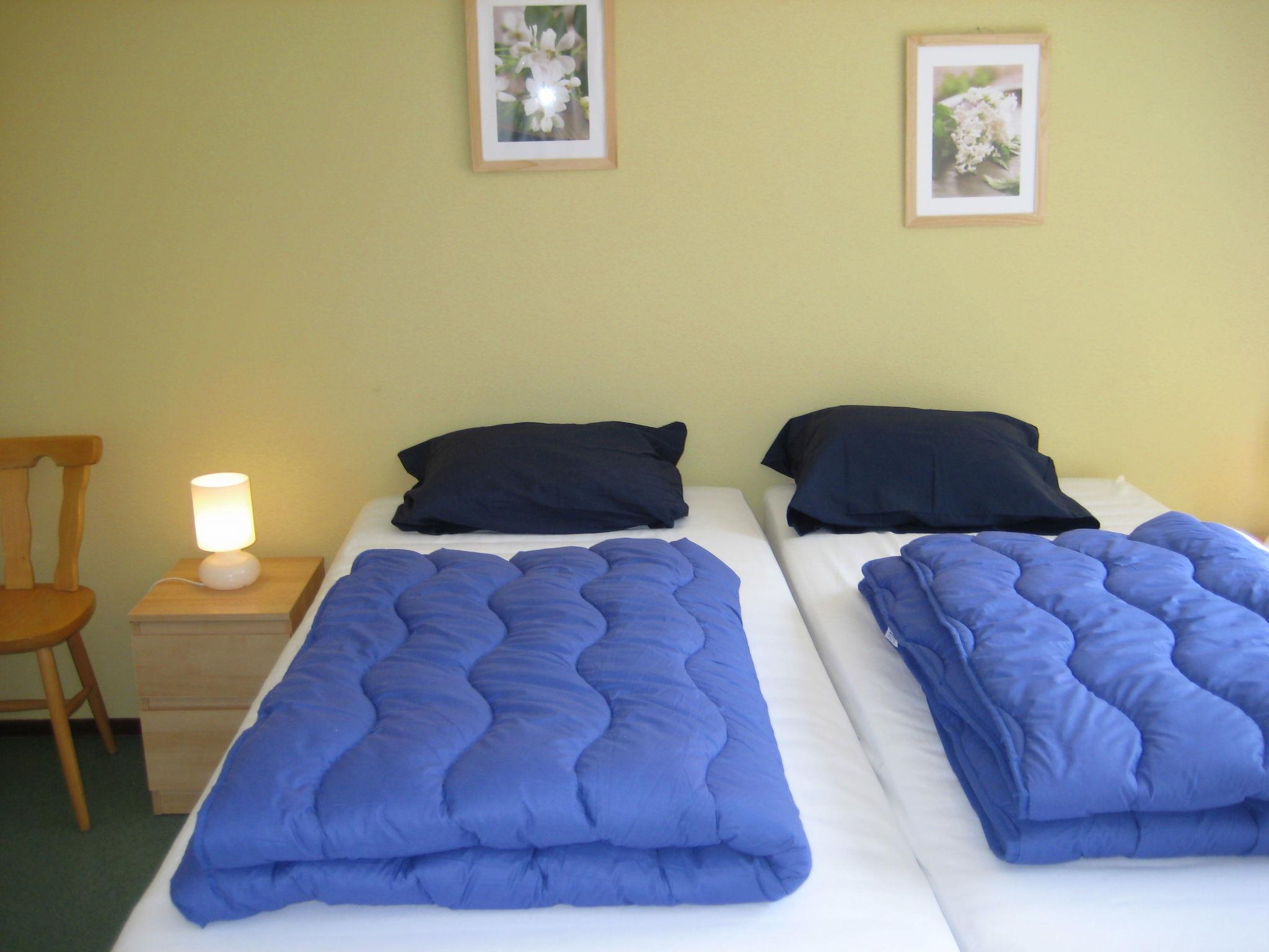"4L", 3-room bungalow 50 m2, on the ground floor. Practical and cosy furnishings: entrance hall. Living/dining room with dining table and TV. Exit to the garden, to the terrace. 1 room with 2 beds, hand-basin and shower/WC. 1 room with 2 beds and bath/WC. Open kitchen (4 hot plates, dishwasher, kettle, electric coffee machine). Heating. Terrace, garden. Terrace furniture. Facilities: Internet (WiFi, free). Parking at the house. Please note: maximum 2 pets/ dogs allowed. Smoke alarm. Pets on request. One bedroom may have a double bed instead of two single beds.