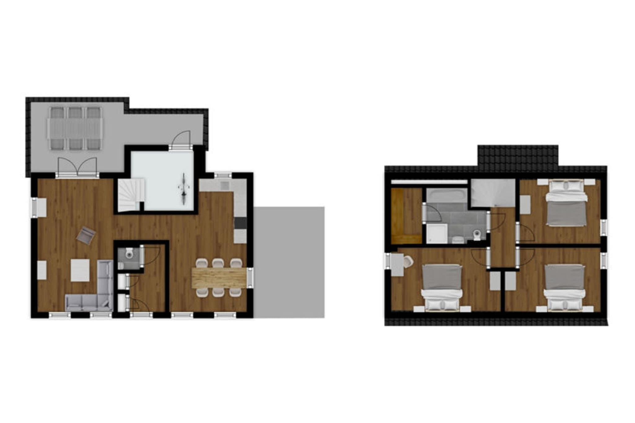 Første etasje: (entré(toalett), Stue(TV(flatskjerm, digital), spisebord, vedovn(tre), sittehjørne), åpent kjøkken(komfyr med kokeplater(induksjon), vannkoker, brødrister, kaffetrakter(kopper), Kombi stekovn/mikrobølgeovn, oppvaskmaskin, kjøleskap med fryser)) i 2. etasje: (soveværelse(Dobbeltseng eller 2 enkeltsenger, TV), soveværelse(Dobbeltseng eller 2 enkeltsenger), soveværelse(enkeltseng, enkeltseng), bad(Bubble bath, dusj, badstue, håndvask, toalett), Repos) oppbevaringsrom, terrasse(overdekket), hage, hagemøbler, grill, parkering, terrassemøbler