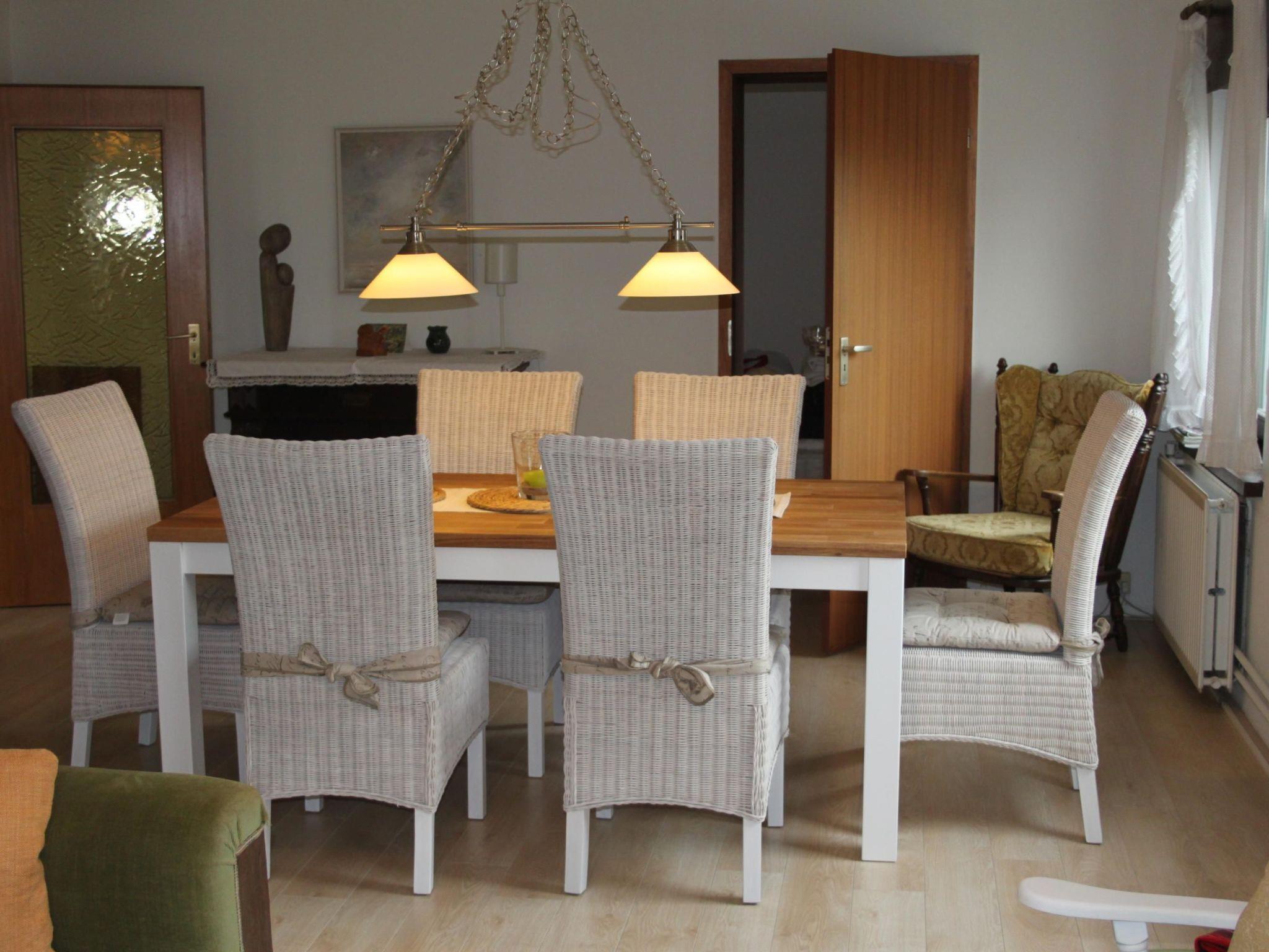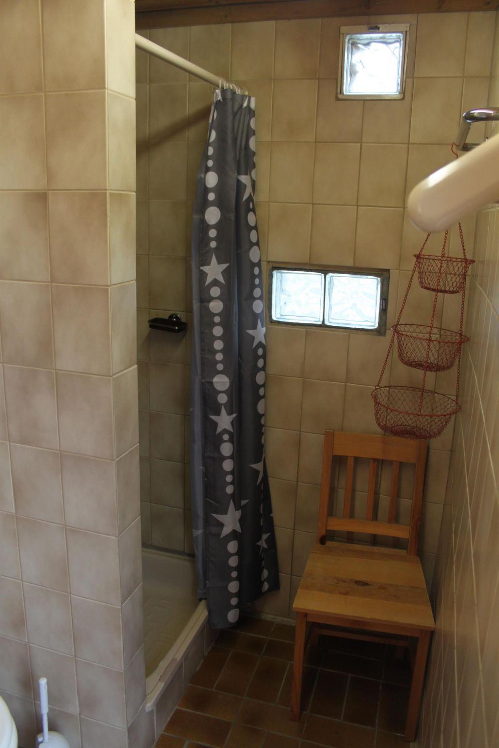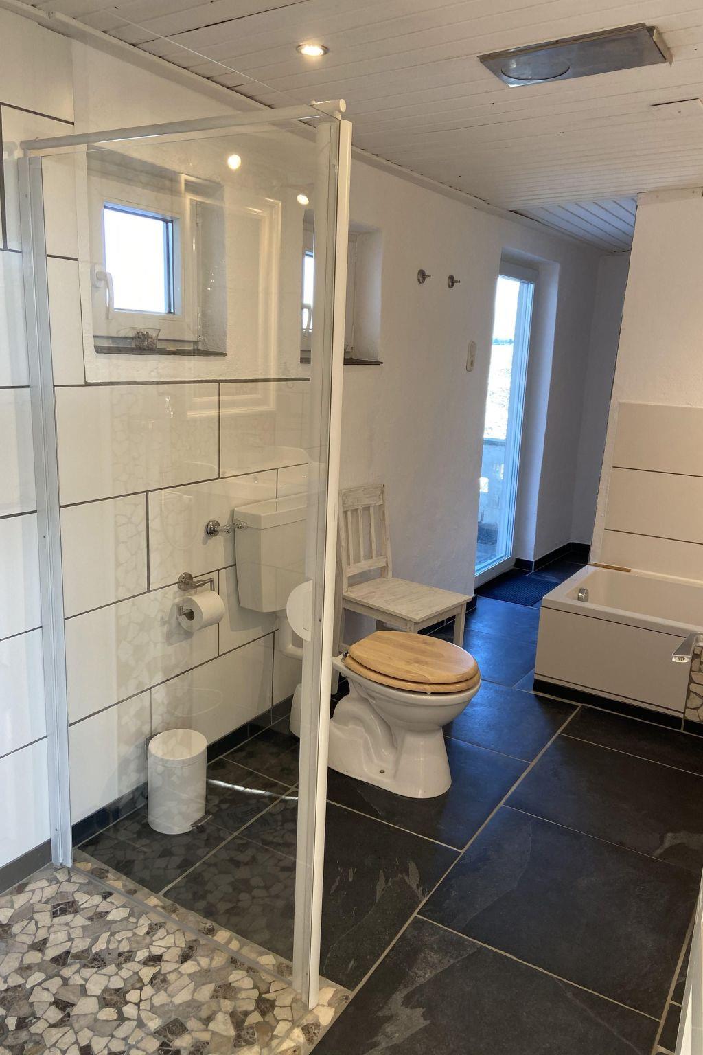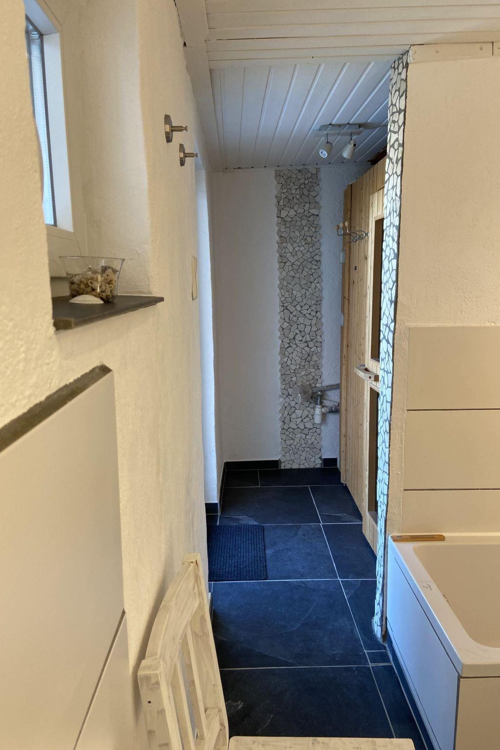 The four guest rooms offer seven beds. Downstairs on the ground floor there is a single bedroom with a 90 cm wide bed, a desk and a wardrobe. There is also a double bedroom with a 1.80 cm wide double bed and wardrobe. Both rooms lead off the living room. Two further bedrooms are located in the attic with sloping ceilings. In one bedroom there is a double bed measuring 2x2 metres and in the other bedroom there are two single beds, each 90 cm wide, and a desk. Both bedrooms have shelves integrated into the sloping ceilings. There is also a guest WC in the attic. THE ROOF FLOOR CAN ONLY BE ACCESSED BY A NARROW STAIRCASE (not a wide staircase - not suitable for older people). On the ground floor there are the two bedrooms, the living room, a bathroom and the eat-in kitchen. There is a dining table in the living room as well as in the eat-in kitchen. In the living room there is a cosy seating area with a cable TV and a DVD player. In addition to the seating area, the kitchen contains a modern kitchenette with oven, hob, fridge, dishwasher. Coffee machine, toaster. There is also a radio with CD player. In addition to the guest WC, the house has two bathrooms. One bathroom with shower, bath, washbasin, sauna and WC is on the ground floor. There is also an outdoor bathroom with shower, washbasin and WC (also on the ground floor, but accessible from the terrace), the indoor bathroom has just been completely renovated (January 2021) and now has direct through/access to the sauna. Modern tiles and bathroom furniture now round off our little wellness oasis. Don't forget your bathrobes! The outdoor bathroom has also been given a new look. Photos to follow.