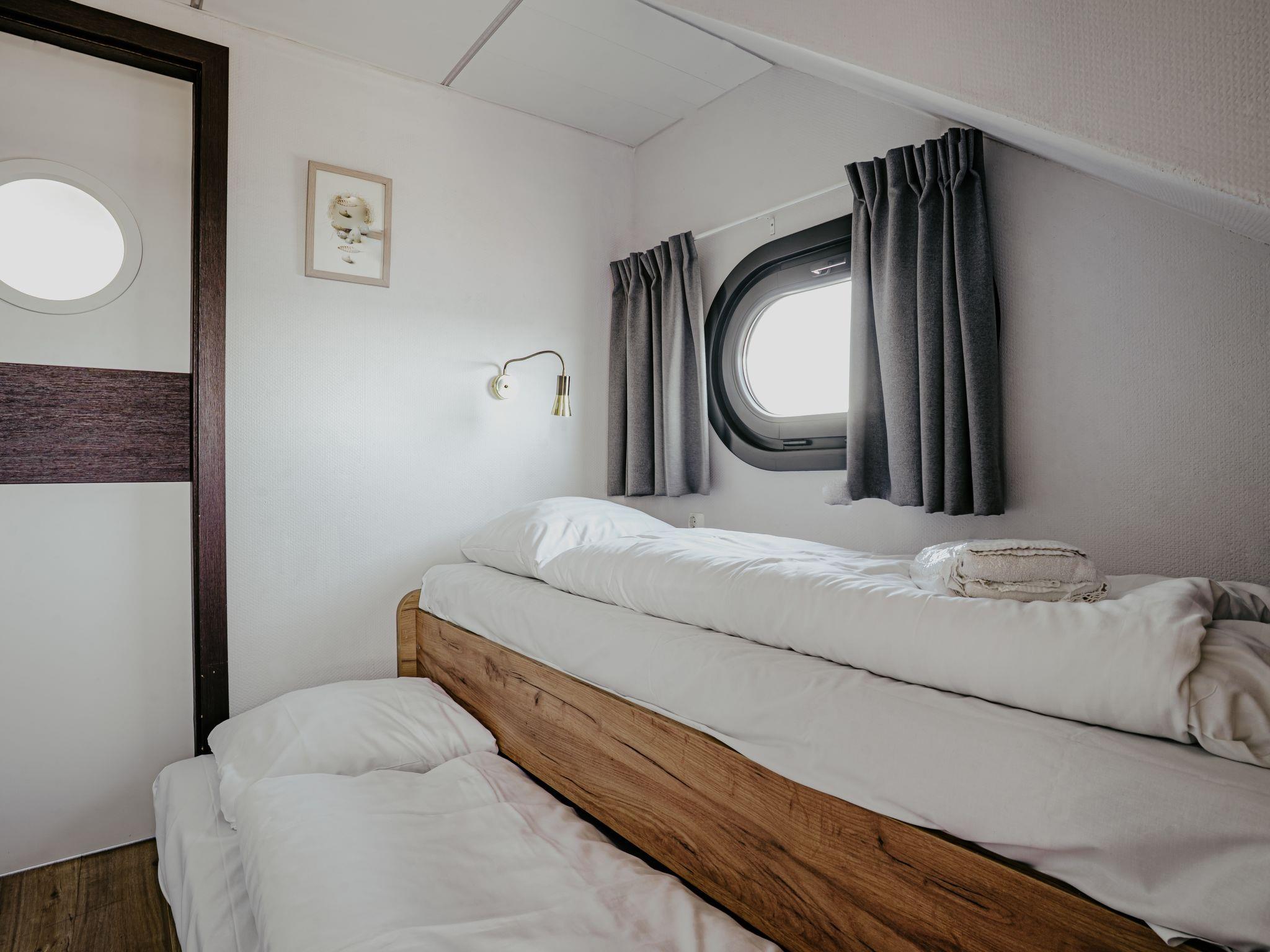 "Campi 400", 3-room house 34 m2. Comfortable furnishings: entrance hall. Living/dining room with dining table, flat screen and electric heater. Exit to the terrace. 1 double bedroom with 1 double bed. 1 double bedroom with 1 bed and 1 pull-out bed. Open kitchen (4 hot plates, kettle, electric coffee machine, combination microwave). Shower/WC. Heating. 2 terraces. Terrace furniture. Facilities: Internet (WiFi, free). Please note: non-smoking house. Maximum 2 pets/ dogs allowed. Smoke alarm. A cot cannot be placed in the bedrooms. This is a houseboat.