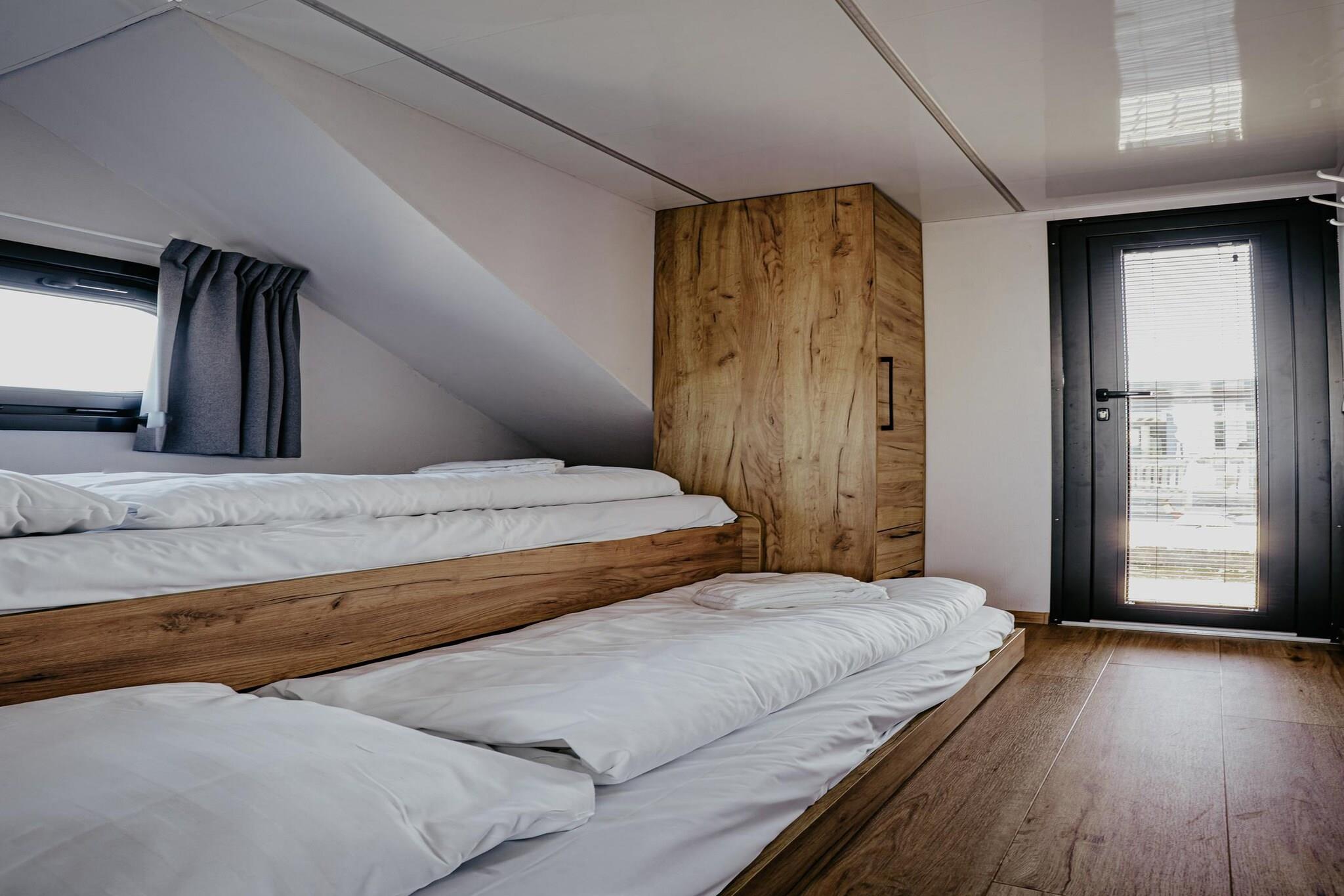 Sjarmerende husbåt med to terrasser og utsikt over innsjøen Våkn opp til glitrende vann og uovertruffen ro om bord på denne vakkert designede husbåten, fortøyd på et av marinaens mest pittoreske steder. Den er innredet med et nautisk preg og moderne komfort, og har en koselig stue med TV, et åpent kjøkken utstyrt med kaffemaskin og kjøleskap, et dobbelt soverom og et andre soverom med en enkeltseng og en uttrekksseng. Med gulvvarme i hele huset og elegante møbler er dette flytende tilfluktsstedet både stilig og rolig. Dobbel utendørsplass: Akterdekk + Takterrasse Nyt ikke ett, men to private uteområder. Nipp til morgenkaffen på akterdekket med den fredelige marinaen ved føttene dine, og gå deretter opp til takterrassen for solnedgangsdrinker og panoramautsikt over Uitgeestermeer. Enten du spiser utendørs, soler deg eller kikker på stjernene, gjør denne husbåten hvert øyeblikk til et minneverdig øyeblikk. Førsteklasses beliggenhet i nærheten av restauranter og aktiviteter Bare noen skritt fra kaien finner du kafeer ved vannkanten, koselige spisesteder og sjarmerende lokale butikker. Utforsk tur- og sykkelstier, eller bare slapp av og se båtene passere forbi. Merk: For å opprettholde det fredelige og allergivennlige miljøet er kjæledyr ikke tillatt om bord. Dette er din sjanse til å unnslippe støyen og nyte luksus ved innsjøen – bare ta med favorittboken din og la vannet gjøre resten. Merk: Huseieren er stolt av å kunne kunngjøre at denne eiendommen har hatt Green Key-sertifikatet siden juni 2025.