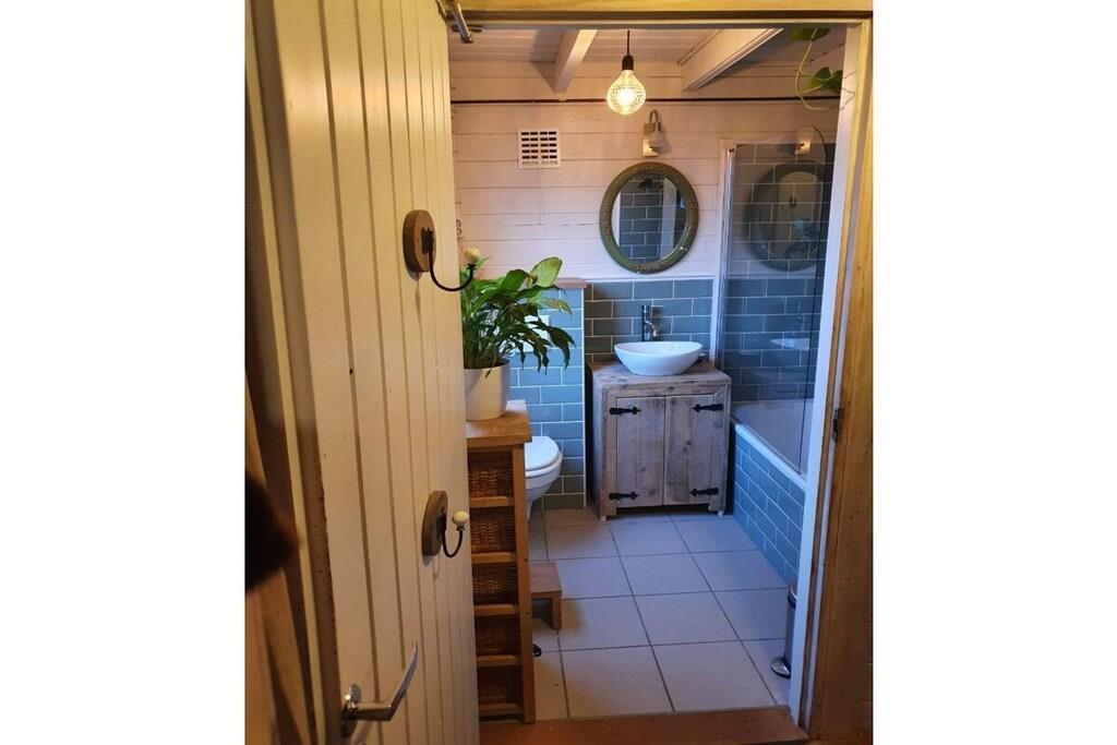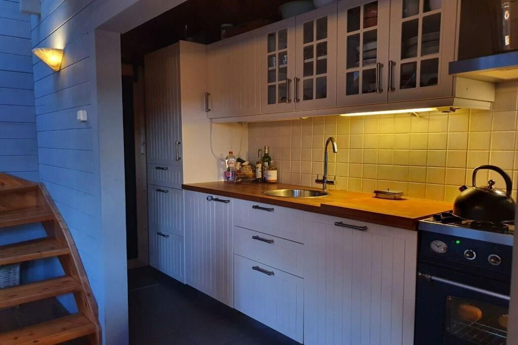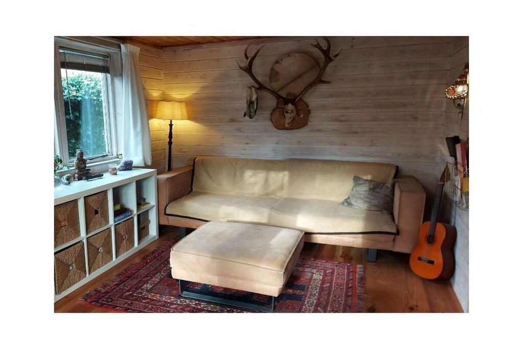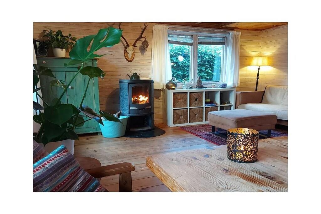 Trehytte med 3 soverom (1 hovedsoverom med familieseng (3x80), 1 rom med dobbeltseng (1,20 m), 1 rom med dobbeltseng (1,40 m). Naturlig innredet med flere sjamanistiske, esoteriske og naturinspirerte detaljer, vil andre hekser umiddelbart føle seg hjemme. Hytta varmes opp av en vedovn eller en parafinovn. Den har absolutt moderne bekvemmeligheter som oppvaskmaskin, Wi-Fi og Bluetooth-høyttalere, men det er ingen TV. Vi tror det er en del av magien: Vi håper at hjemmet vårt vil være et sted for ekte forbindelse for gjestene våre – forbindelse til seg selv, til hverandre, til naturen. Hagen er inngjerdet, men ikke godt nok for små hunder, som har en tendens til å gå på villspor. Det er et fellesfelt med flere trampoliner, en piknikbenk og et bål, som du er velkommen til å bruke.