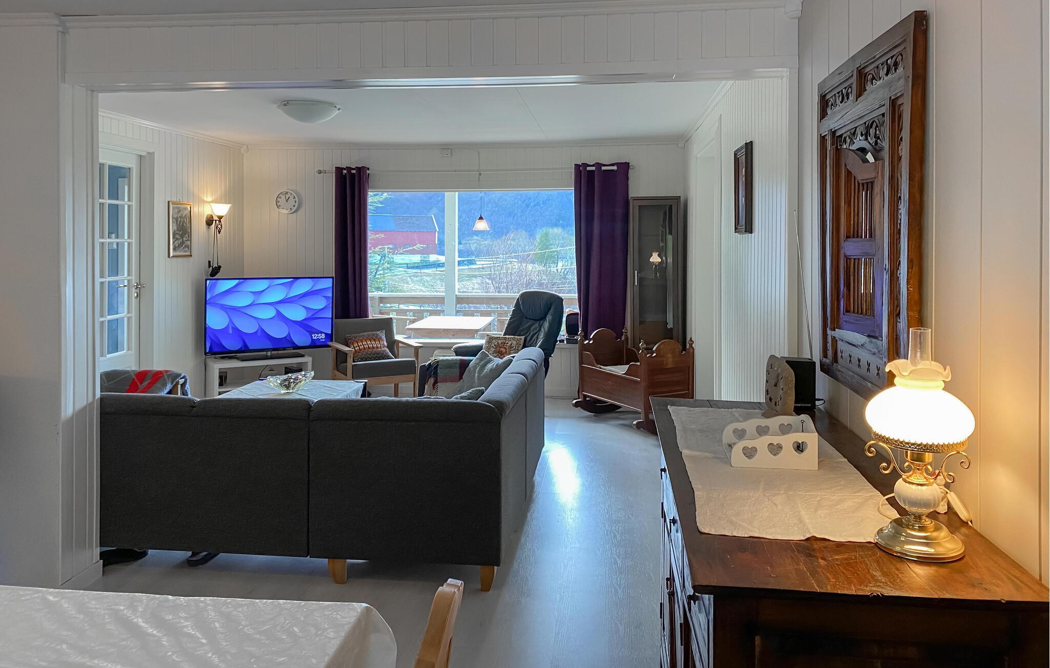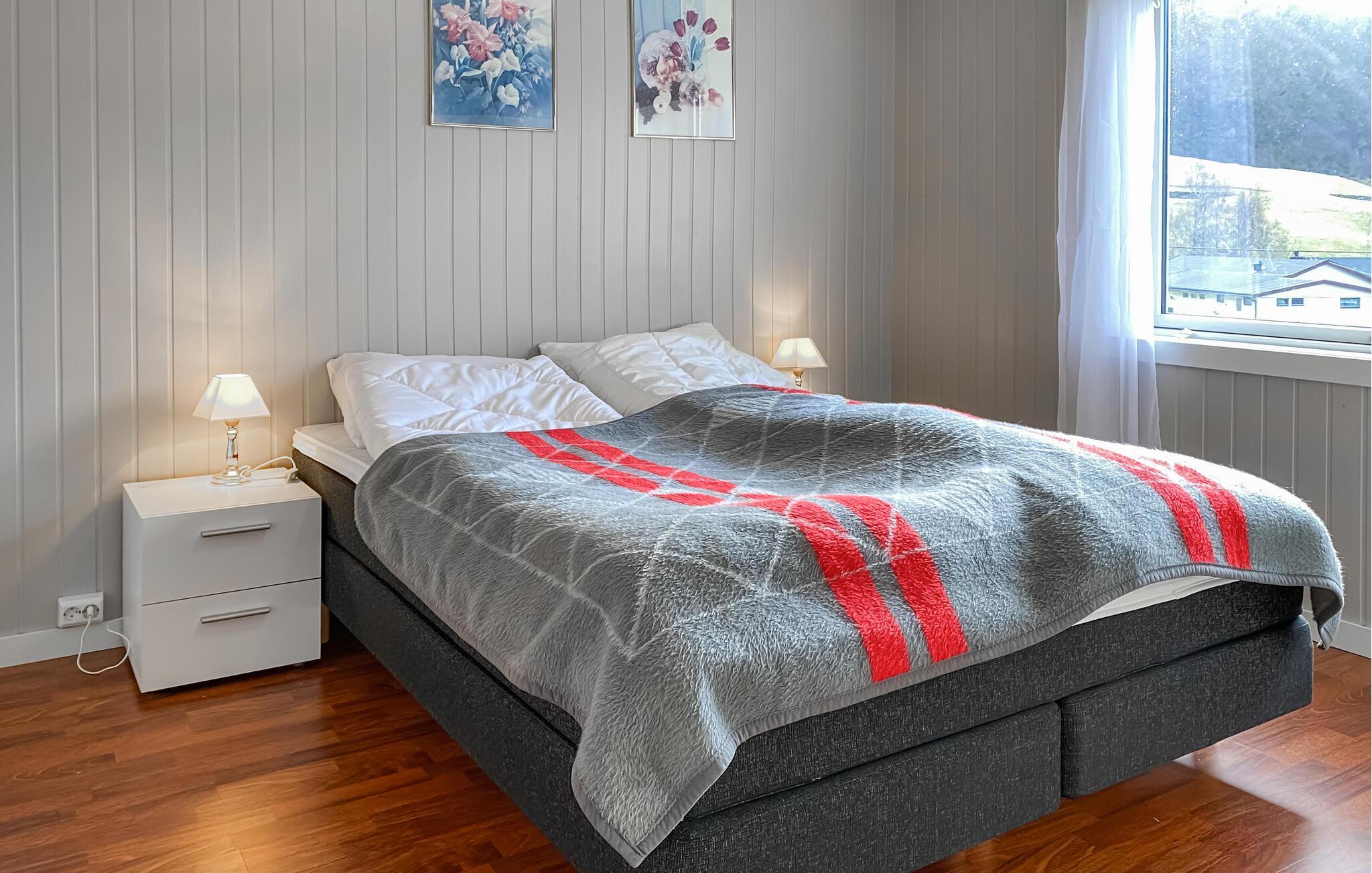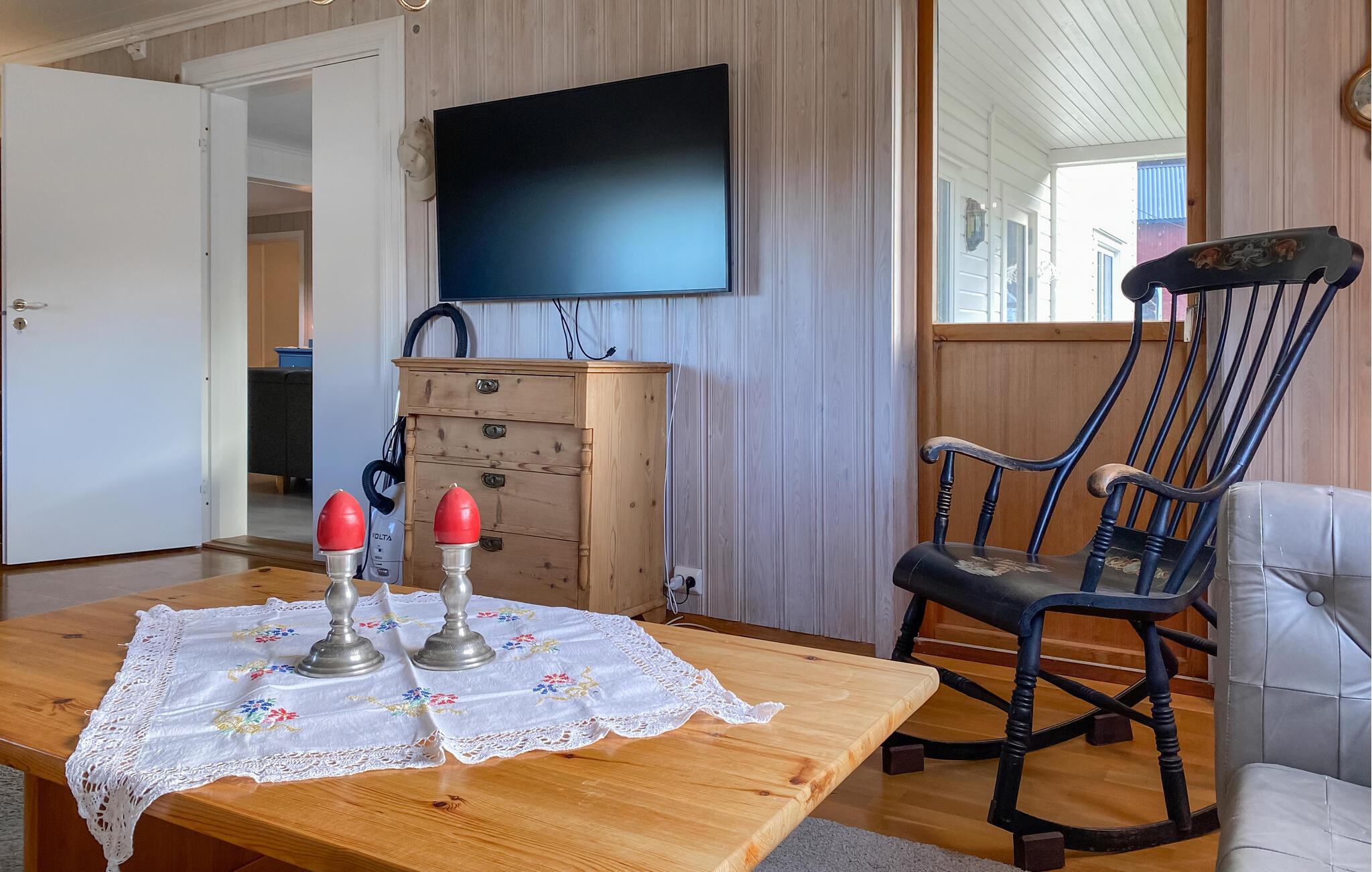 Dette koselige feriehuset med utsikt over den pittoreske fjorden ønsker deg velkommen midt i et imponerende landskap. Tilbered favorittrettene dine sammen med dine nærmeste på det moderne kjøkkenet, og nyt dem ved det innbydende spisebordet. Slapp av i den koselige stuen med et brettspill, eller len deg tilbake med en bok i en av de komfortable lenestolene.