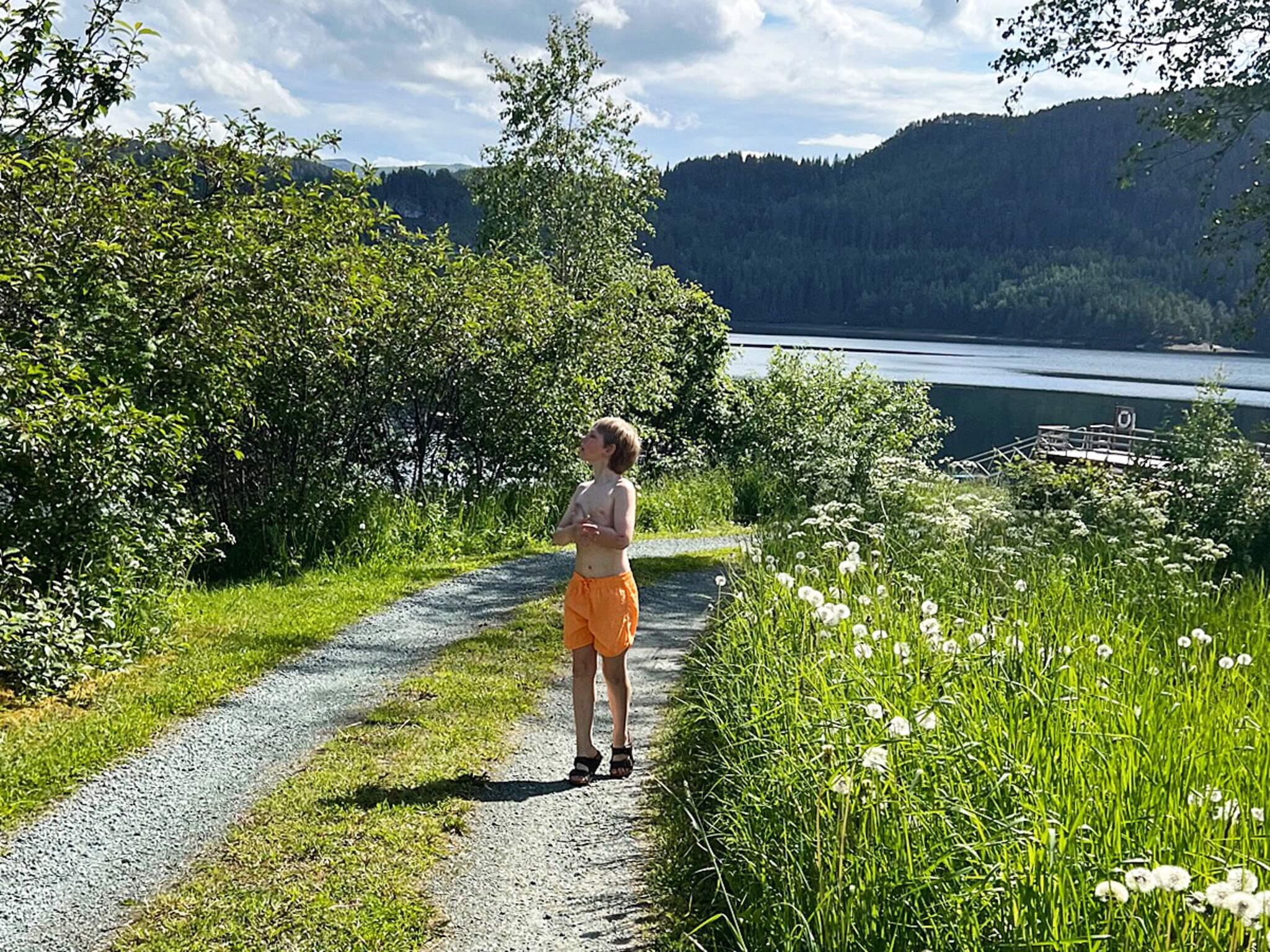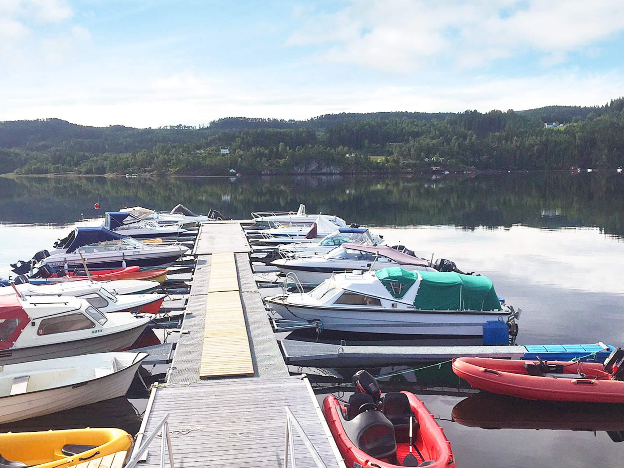Fra hytta og terrassen er flott utsikt mot fjorden 100 m nedenfor. Strandlinja er langgrunn og barnevennlig og gir fine muligheter for bading for hele familien, fra stranda eller fra brygga.