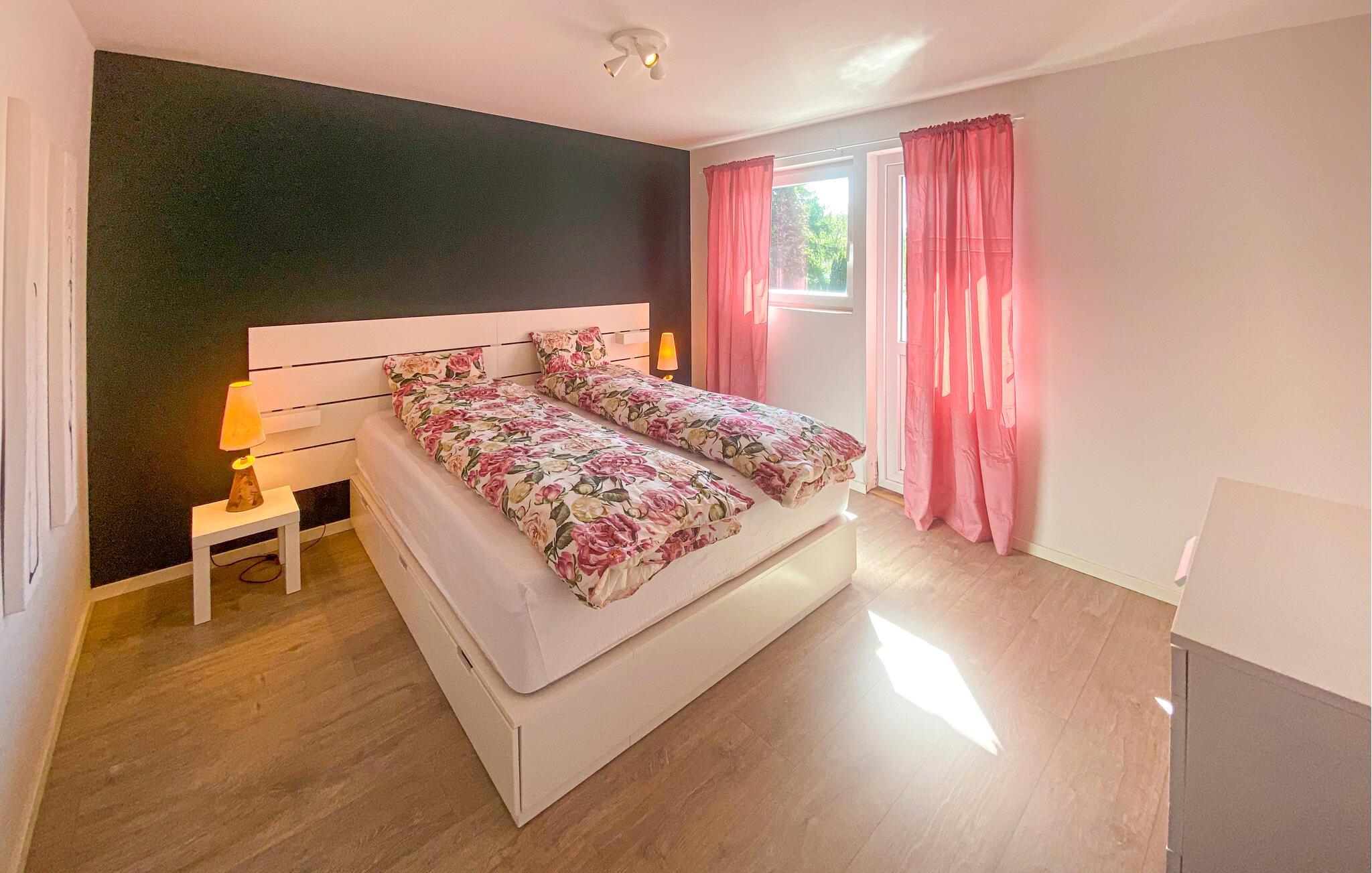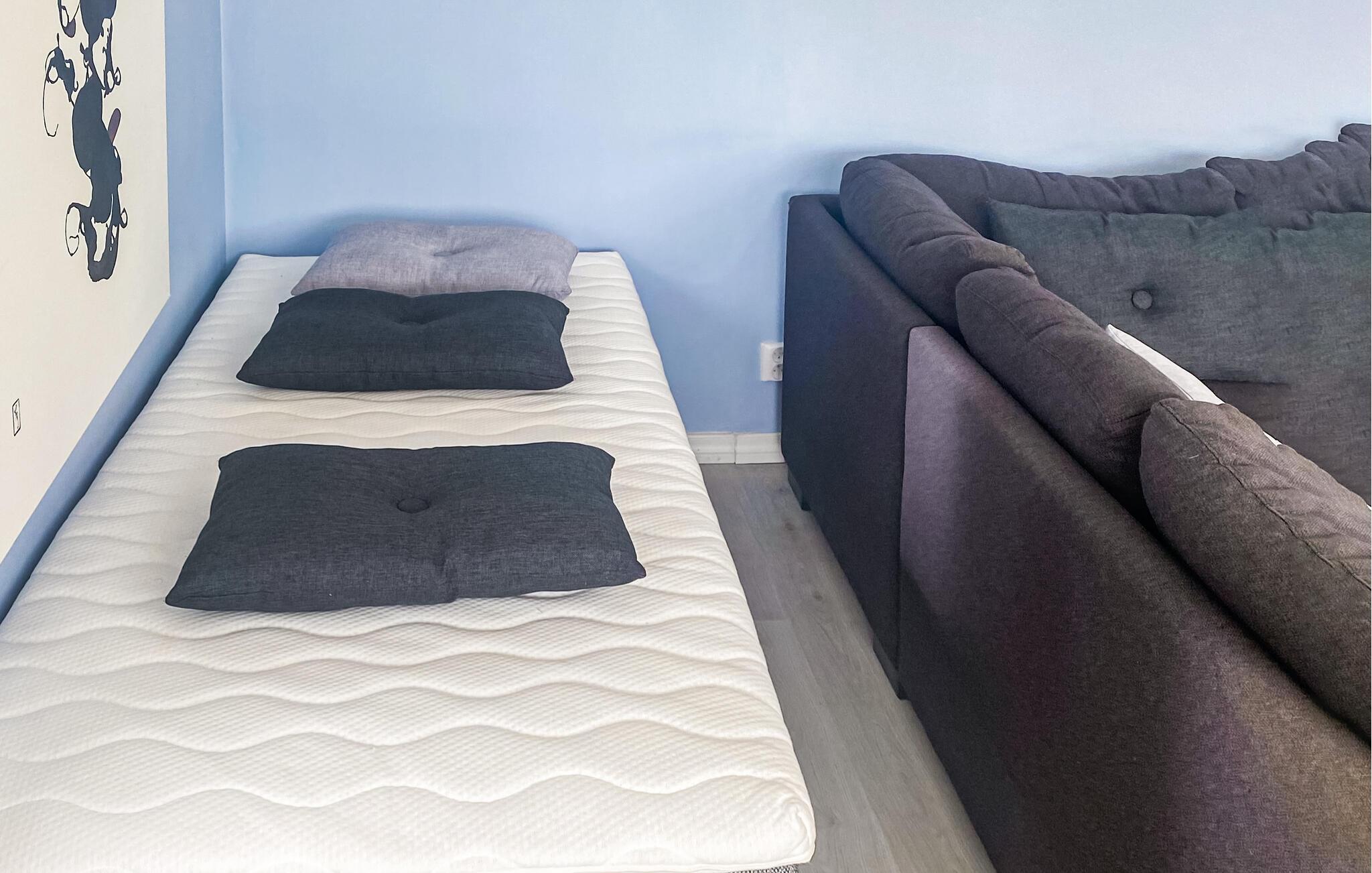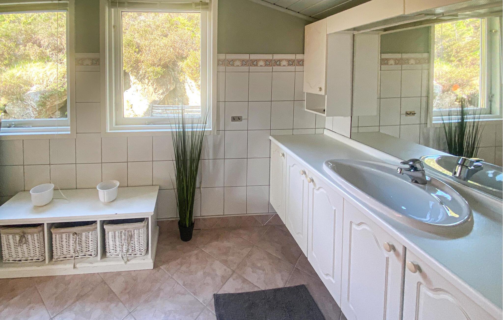 Opplev en avslappende ferie i dette velholdte feriehuset med en rolig beliggenhet i enden av en blindvei og en stor, vakkert anlagt hage. Stuen imponerer med moderne møbler, store vindusflater og en vakker utsikt over de grønne omgivelsene. Slå deg ned ved det store spisebordet med utsikt, eller tilbring avslappende kvelder foran vedovnen og se på TV i den komfortable sofaen. I det separate kjøkkenet med god oppbevaringsplass kan du enkelt tilberede feriemåltidene dine.