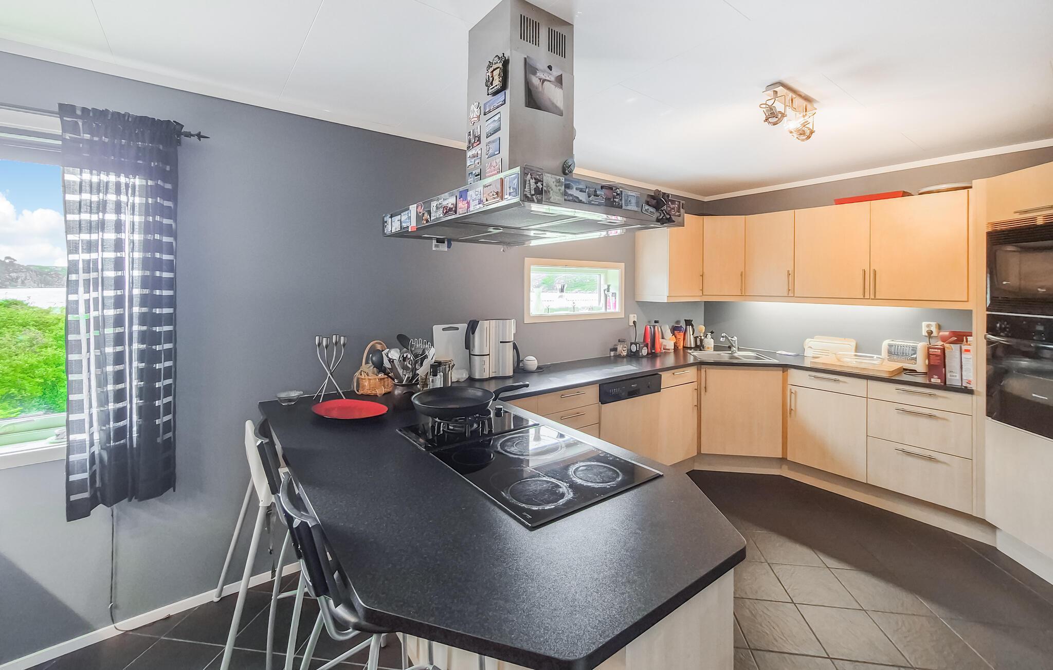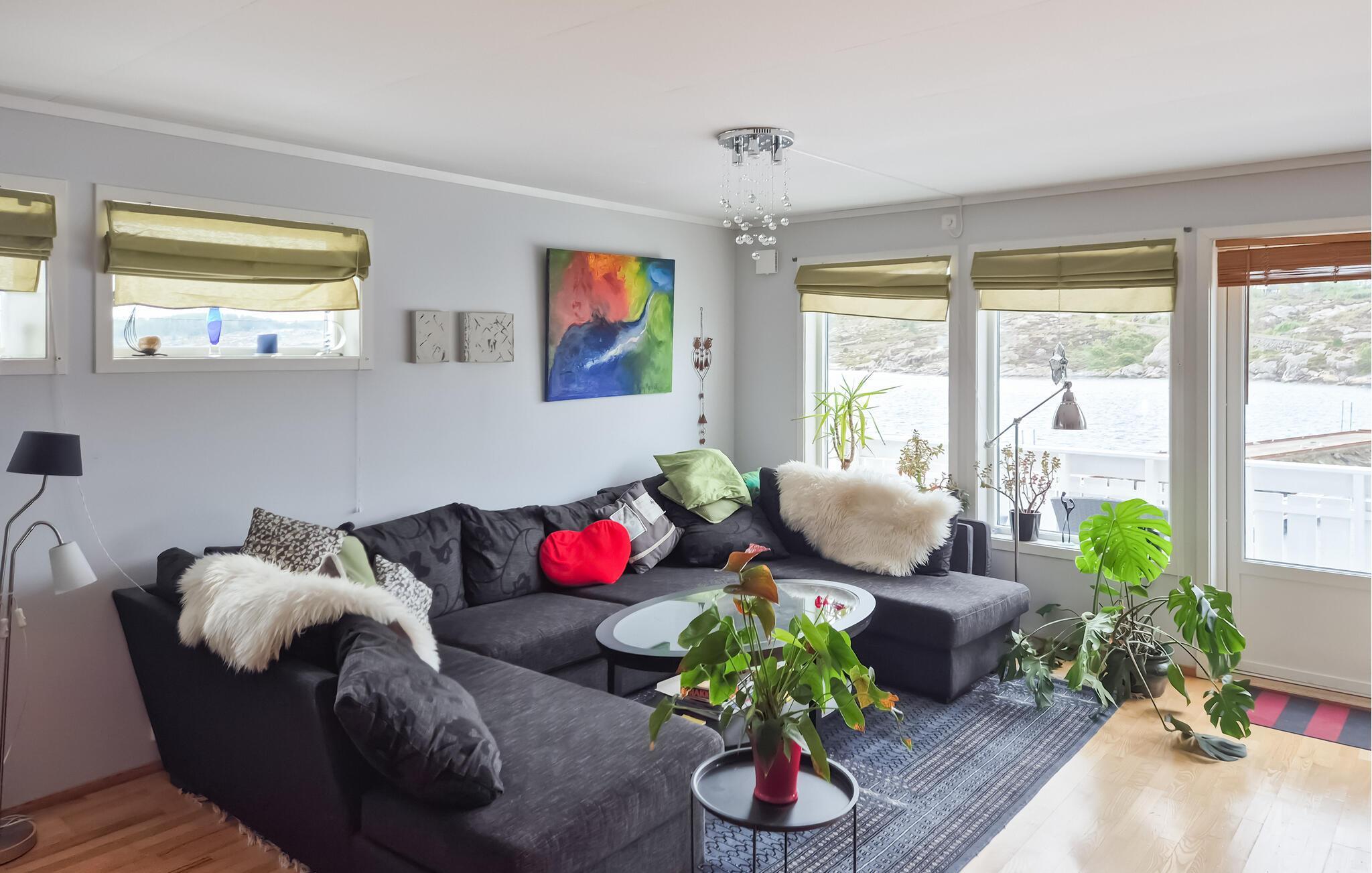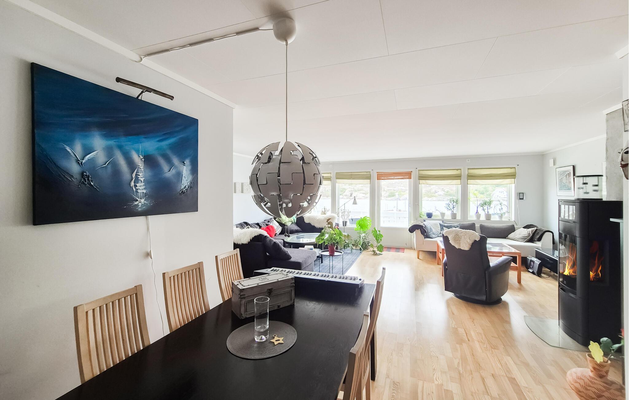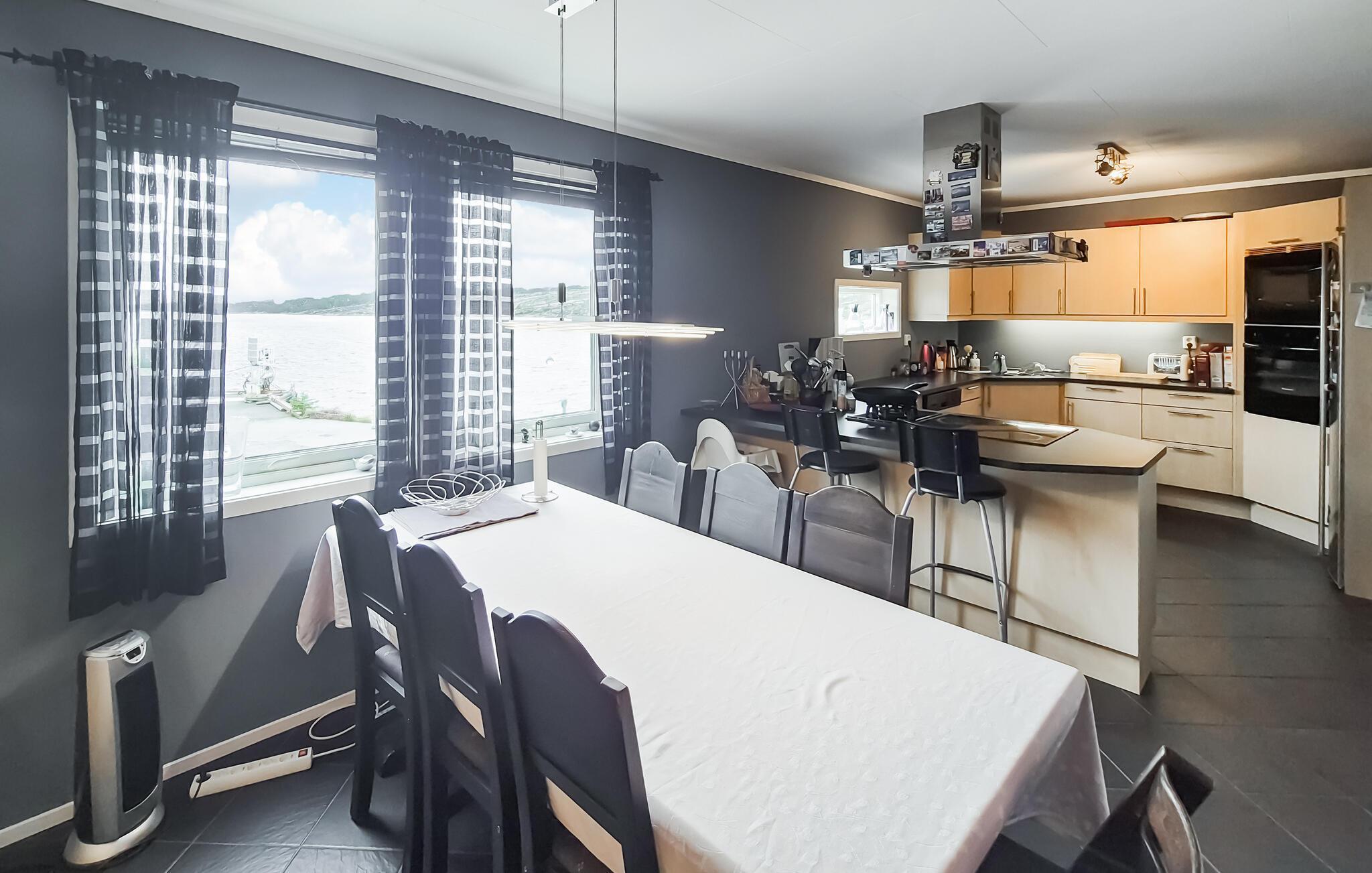 Ankom med familien og finn fred og ro. De moderne møblene skaper en koselig og innbydende atmosfære der du umiddelbart vil føle deg som hjemme. Den lyse, åpne planløsningen i rommene gir rikelig med lys og en vennlig, luftig atmosfære som er ideell for utetiden. De mange vinduene gir deg en fantastisk utsikt over vannet, og terrassen med hagemøbler er perfekt for avslapping i solen. Den private bryggen og den solide leiebåten gjør det enkelt å utforske de omkringliggende fiskeplassene.