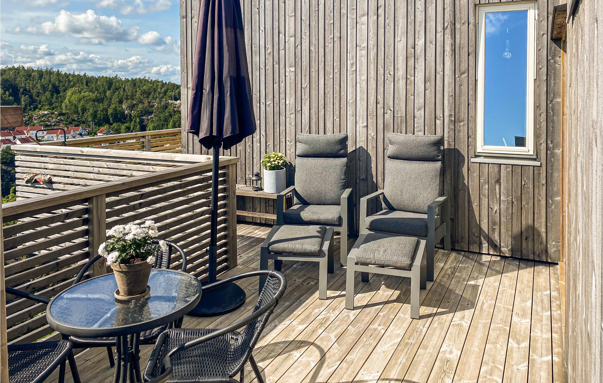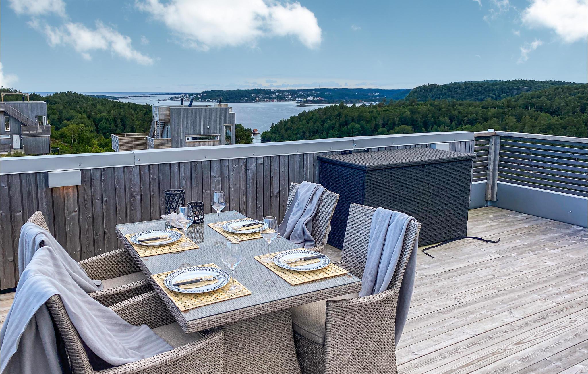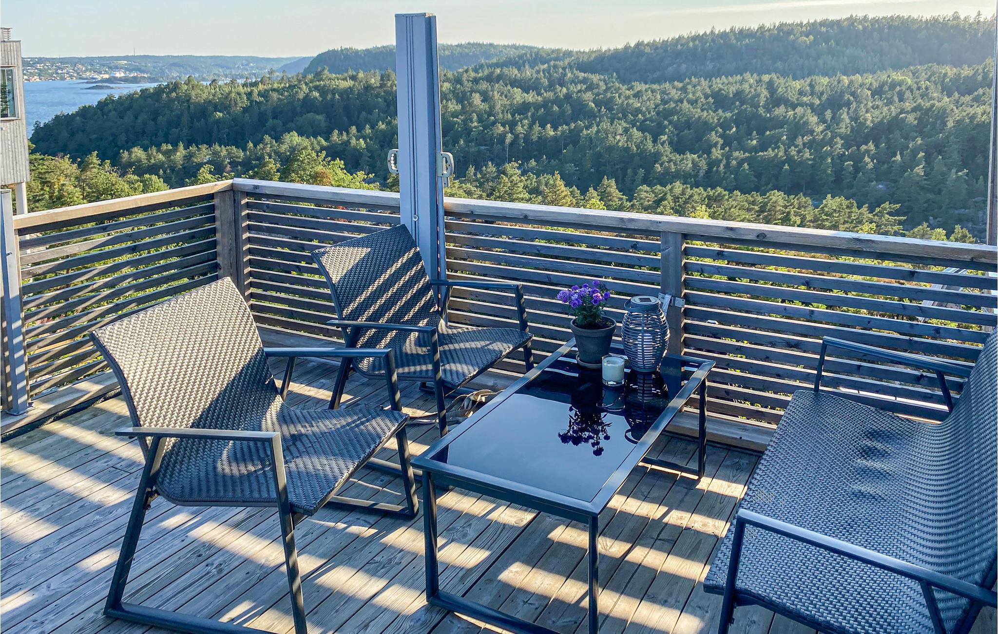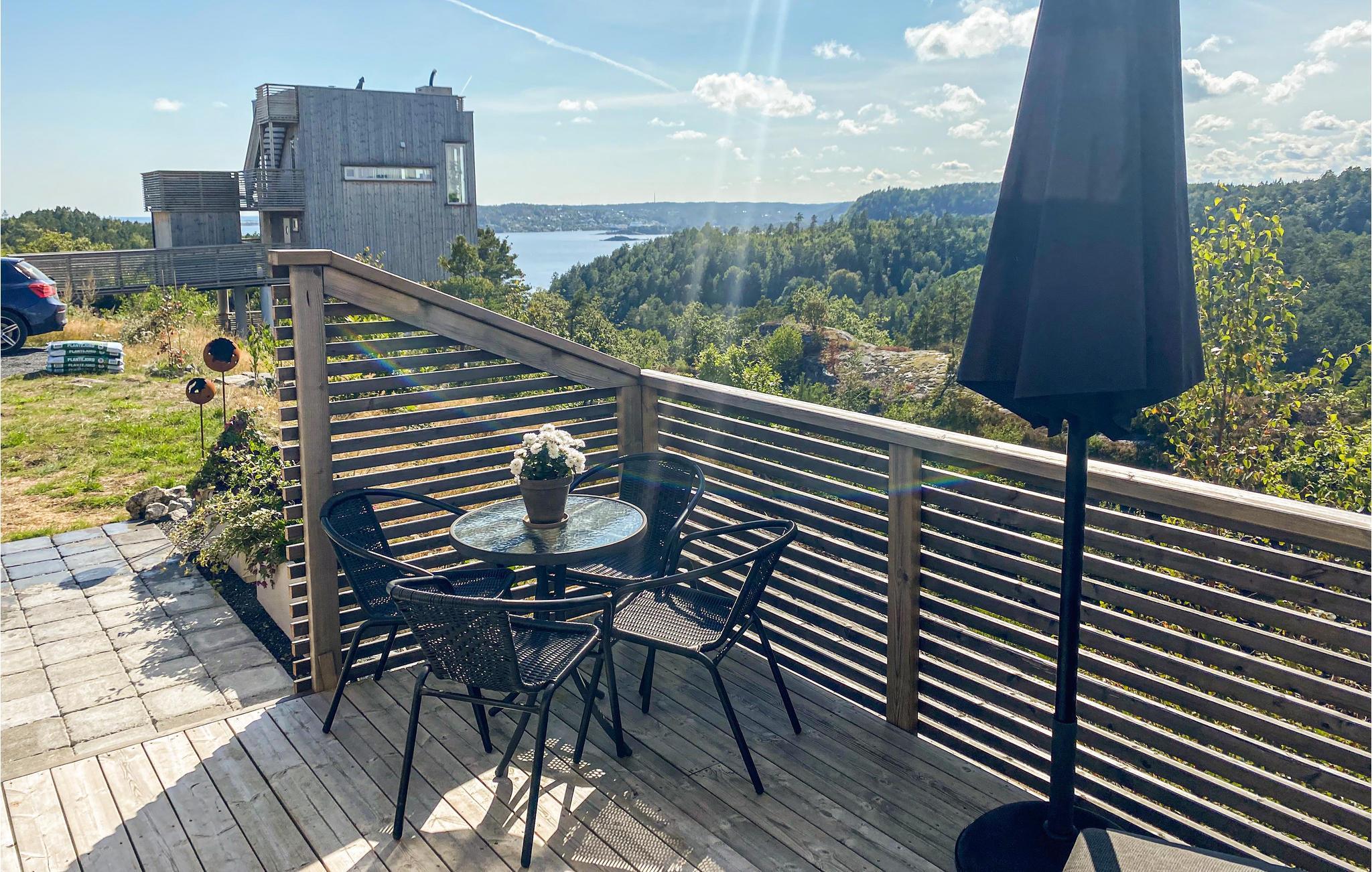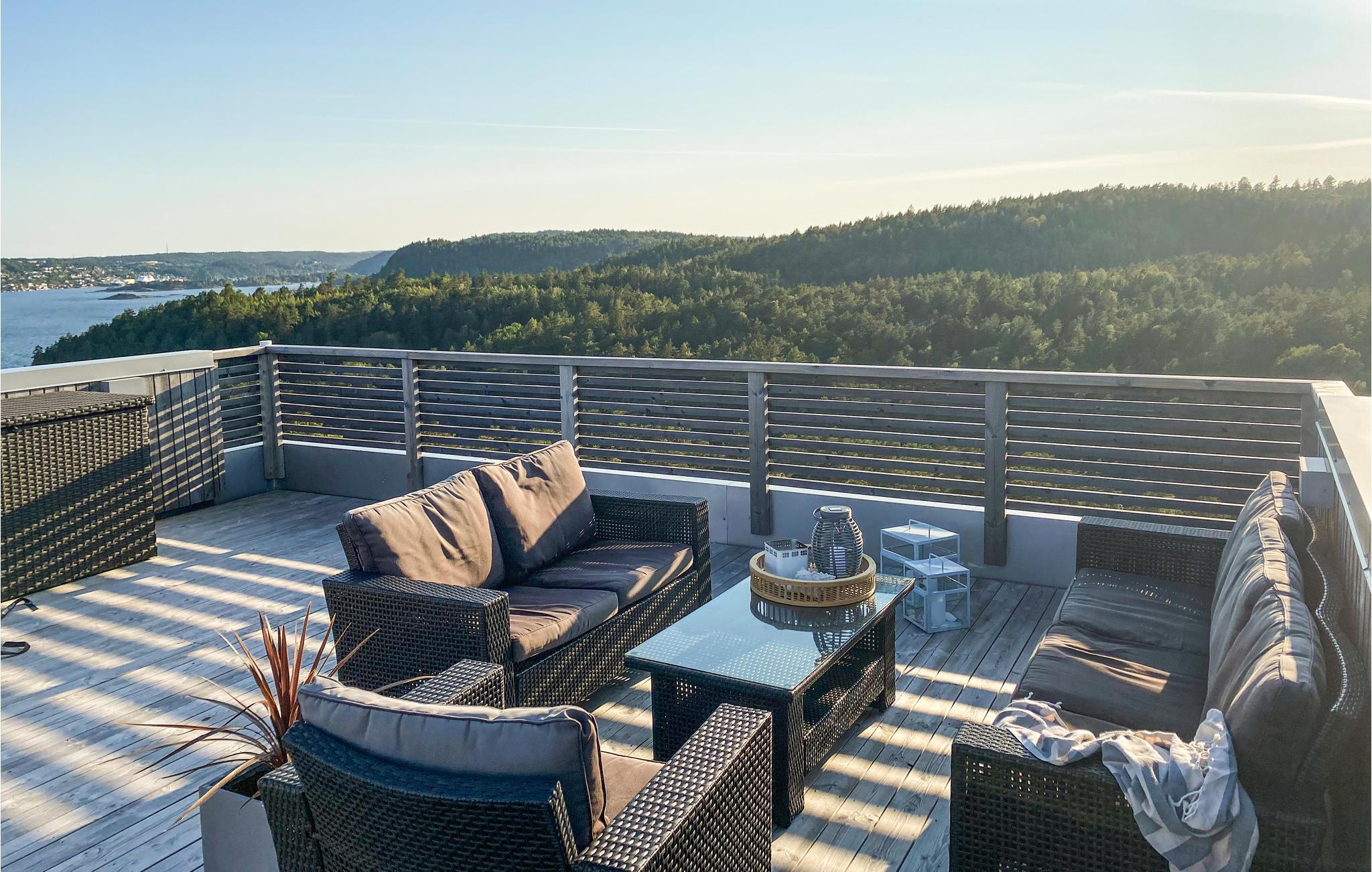 Huset har solrike terrasser, perfekt for lange dager ute. Fra takterrassen har du 360 graders panoramautsikt. Finnes det en bedre ramme for en matbit med produkter direkte fra den nærliggende gårdsbutikken? Om kvelden kan du grille eller bare slappe av og nyte utsikten.
