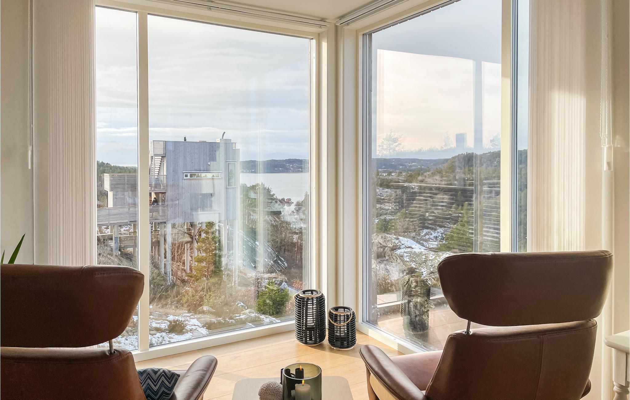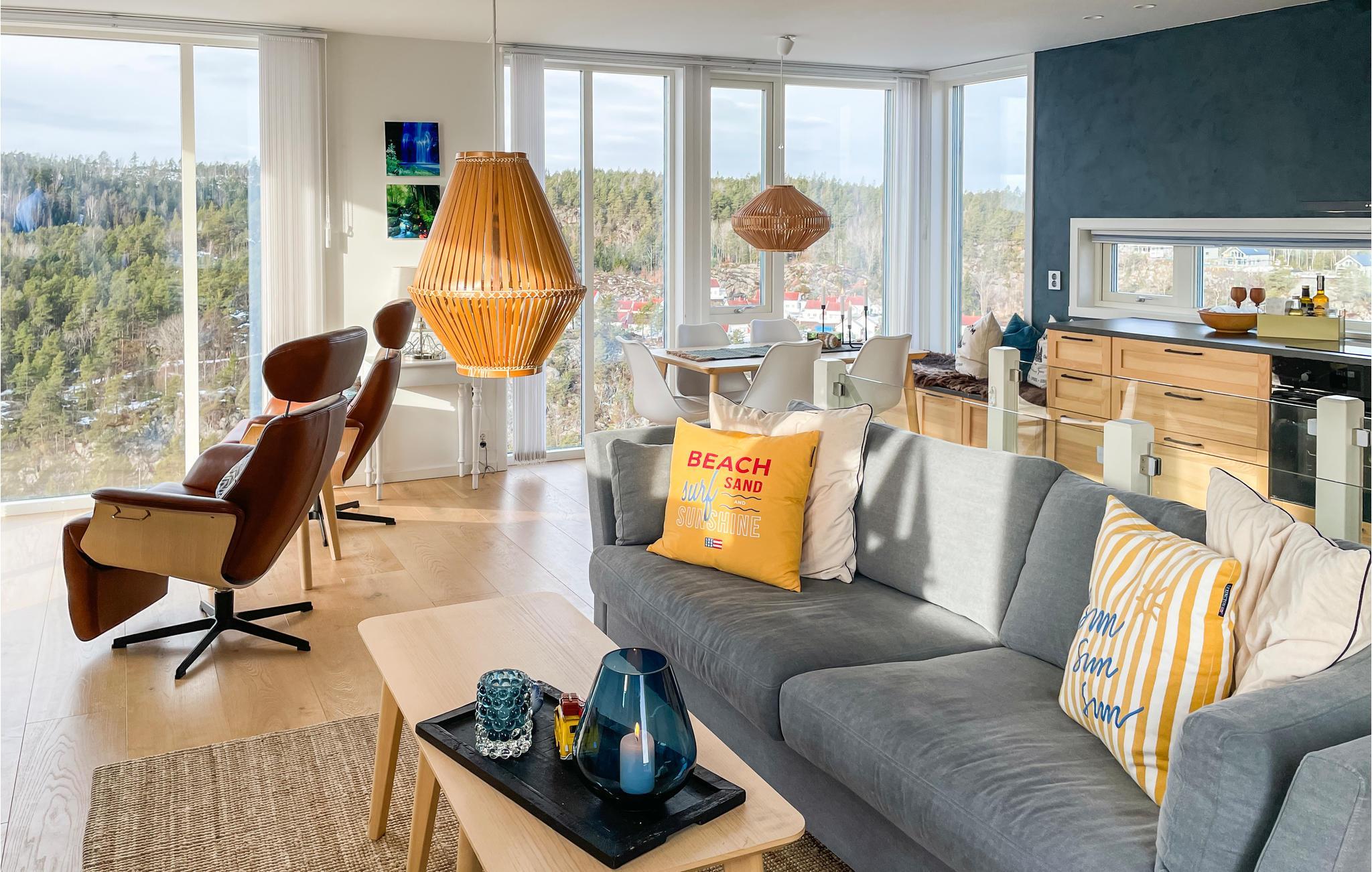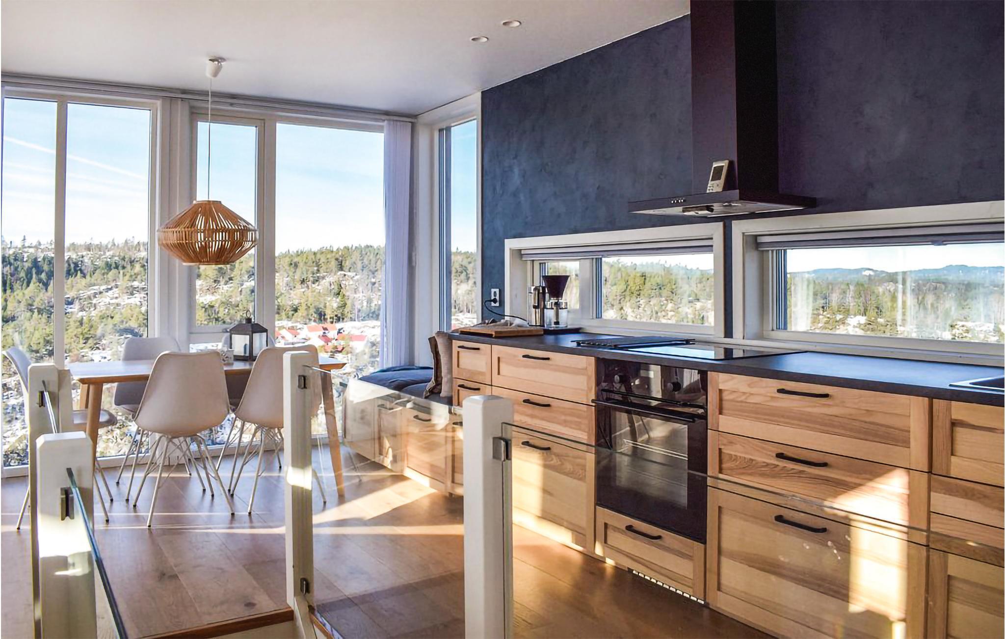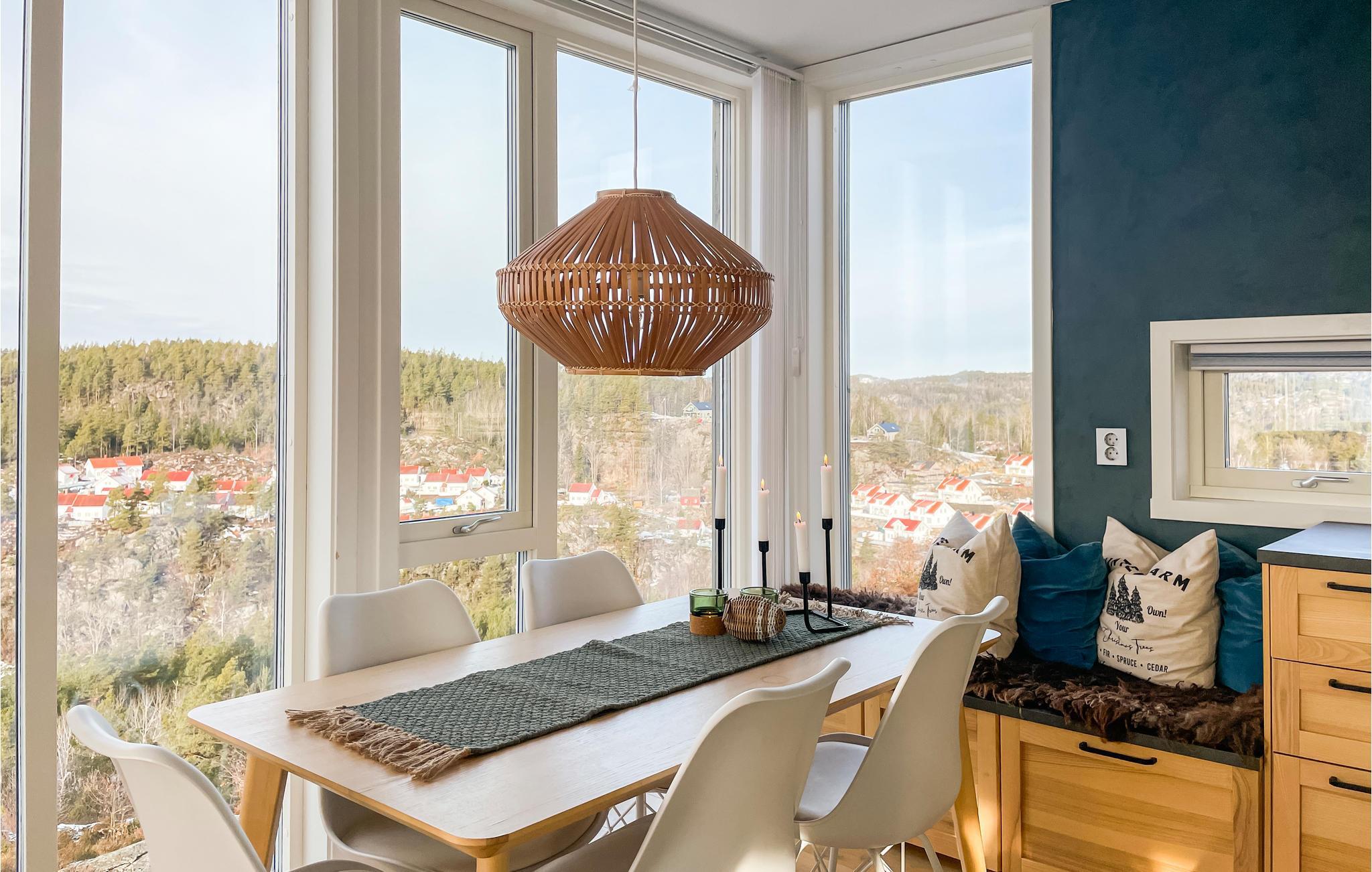 Beliggenheten til dette huset er rett og slett fantastisk. Her kan du nyte frokosten mens du beundrer soloppgangen gjennom de store vinduene. Huset har åpen kjøkkenløsning, slik at du kan delta i samtalen rundt spisebordet mens du lager mat.