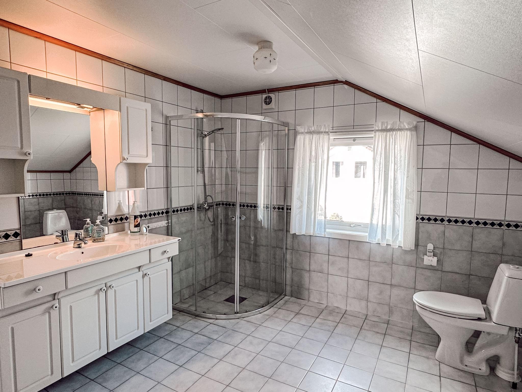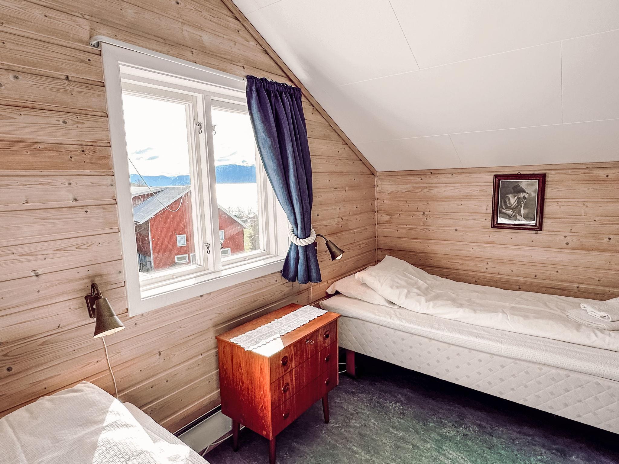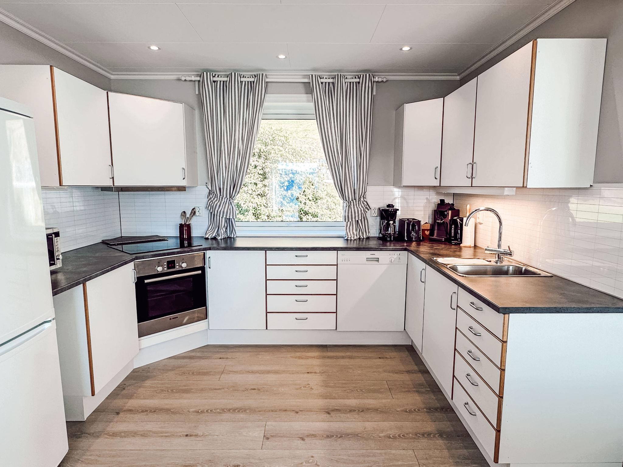 "Tantestova", 4-room house 120 m2 on 2 levels. Modern and cosy furnishings: living/dining room with Scandinavian wood stove, dining table and satellite TV. Exit to the terrace. Kitchen (4 hot plates, oven, dishwasher, toaster, kettle, microwave, freezer, electric coffee machine). Sep. WC. Upper floor: 2 rooms, each room with 1 double bed and hand-basin. 1 room with 2 beds and hand-basin. Bath/shower/WC. Electric heating, underfloor heating. Balcony. Balcony furniture, barbecue (portable). Very beautiful panoramic view of the sea, the countryside and fjord. Facilities: washing machine. Internet (WiFi, free). Please note: non-smoking house. Smoke alarm, fire extinguisher. Freezer approx. 400 l. 924531169