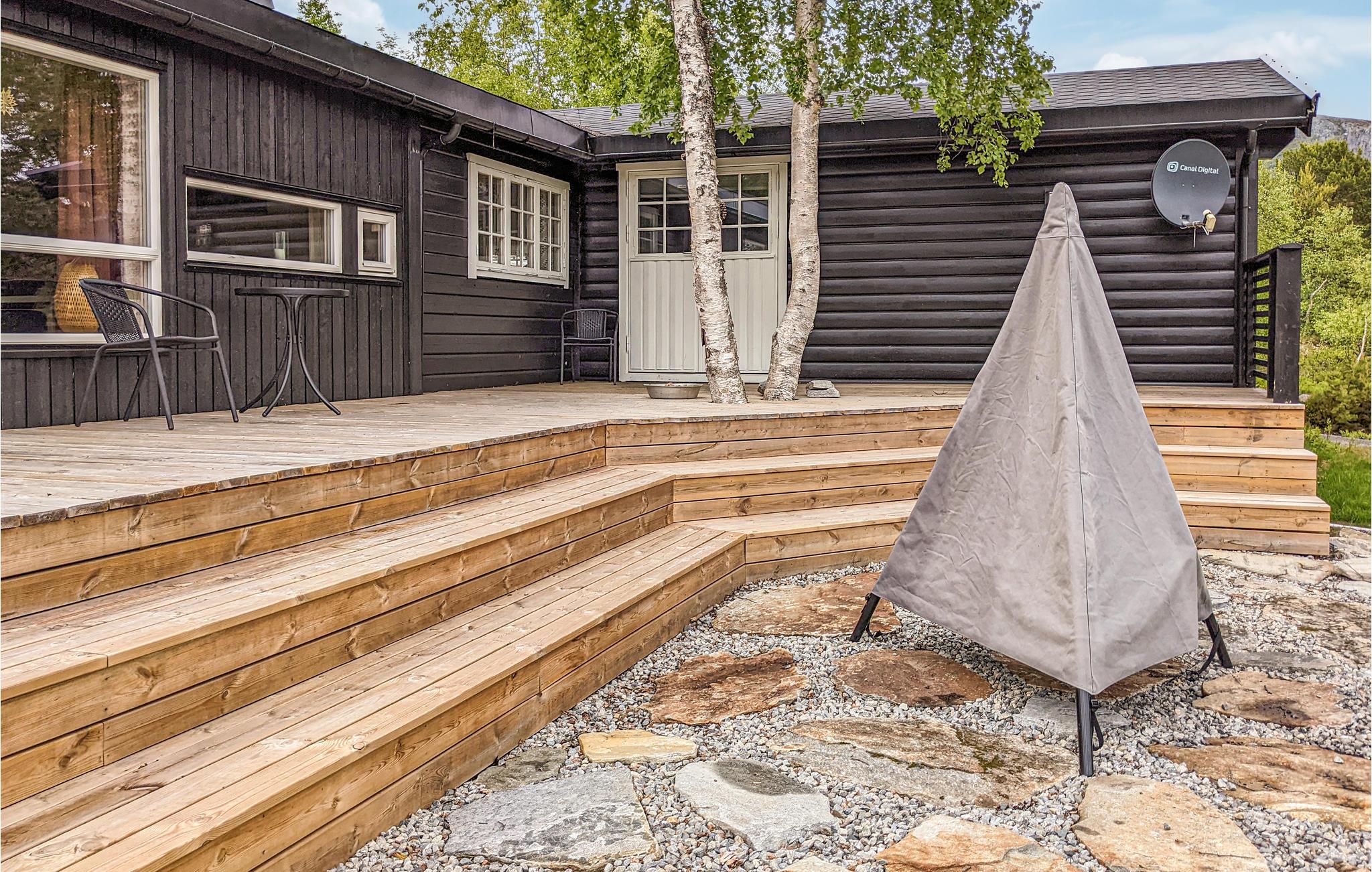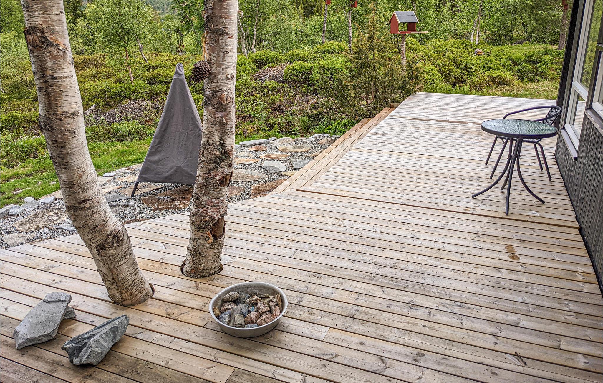 Feriehuset har en stor og vakker terrasse hvor du kan slappe av. I hagen kan du drive med morsomme aktiviteter og leke gjemsel. Her finner du feriemoro for store og små.