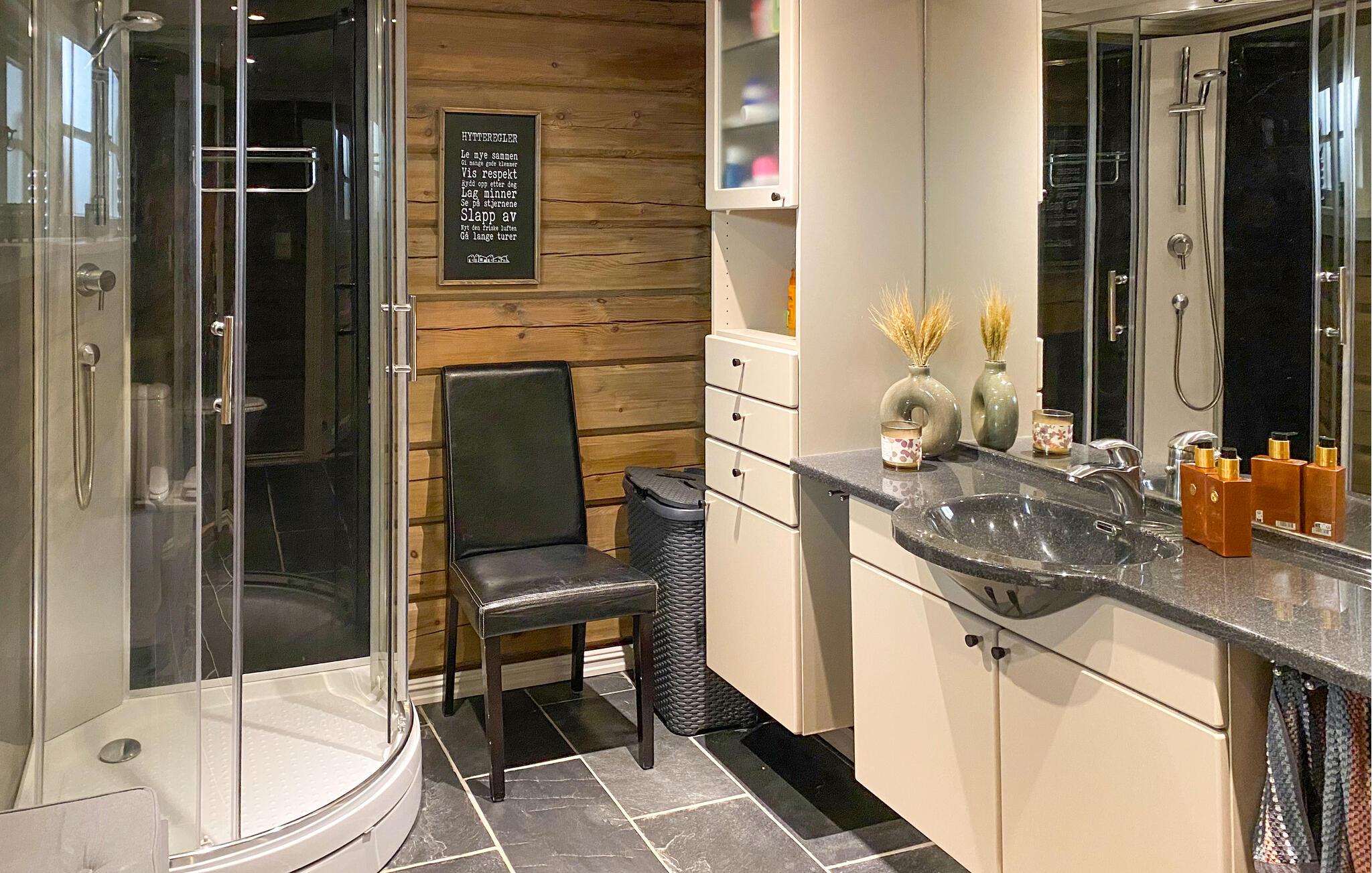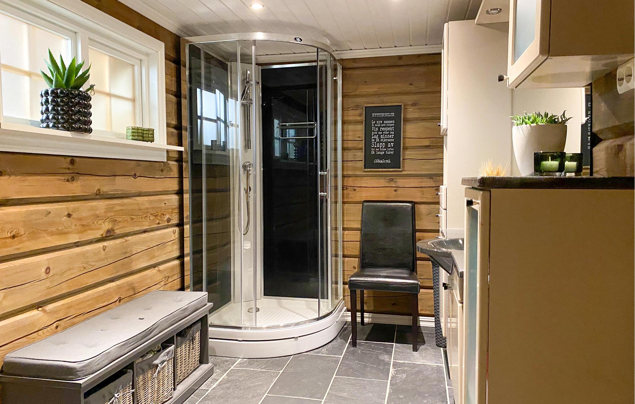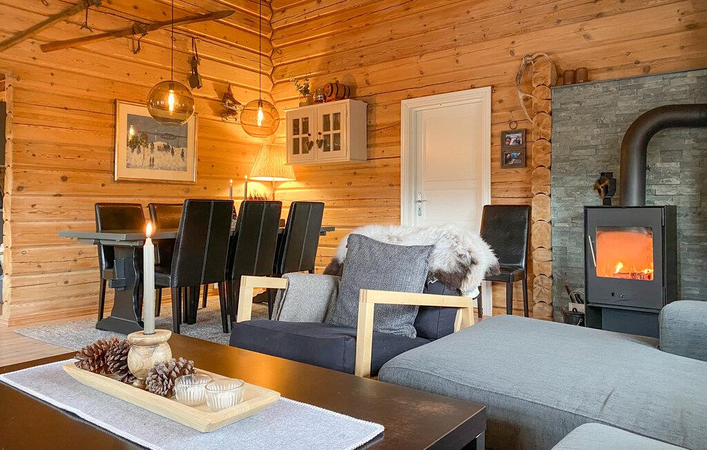 Opplev koselige timer i et hus der den smakfulle innredningen i tre og naturmaterialer skaper en harmonisk atmosfære. Stuen er lys og vennlig, med store vinduer, en komfortabel hjørnesofa og en vedovn som holder deg varm og lun på kjølige kvelder. Tilbered måltidene dine på det moderne kjøkkenet, og nyt dem ved det store spisebordet mens du ser ut gjennom vinduene på det omkringliggende fjellandskapet.