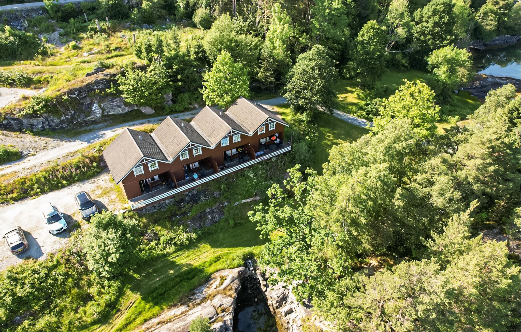 Fire flotte rorbuer (N19601-04) ligger i et flott strandområde ved Hardangerfjorden. Husene ligger vegg i vegg, men er helt lydisolerte og har hver sin store, godt avskjermede terrasse med utsikt over fjord og fjell. Her finner du alt for en variert og aktiv ferie i vakker natur. Fjorden er rik på fisk og komplett fiskeutstyr kan leies. Flere sandstrender og båthavner, turstier, naturgolf, ballbaner og et naturreservat ligger i nærheten. Flere motorbåter til leie, hvorav de fleste er utstyrt med ekkolodd. Forhåndsbestilling påkrevd! Felles: badstue, biljard og bordtennis. Mange utfluktsmuligheter.