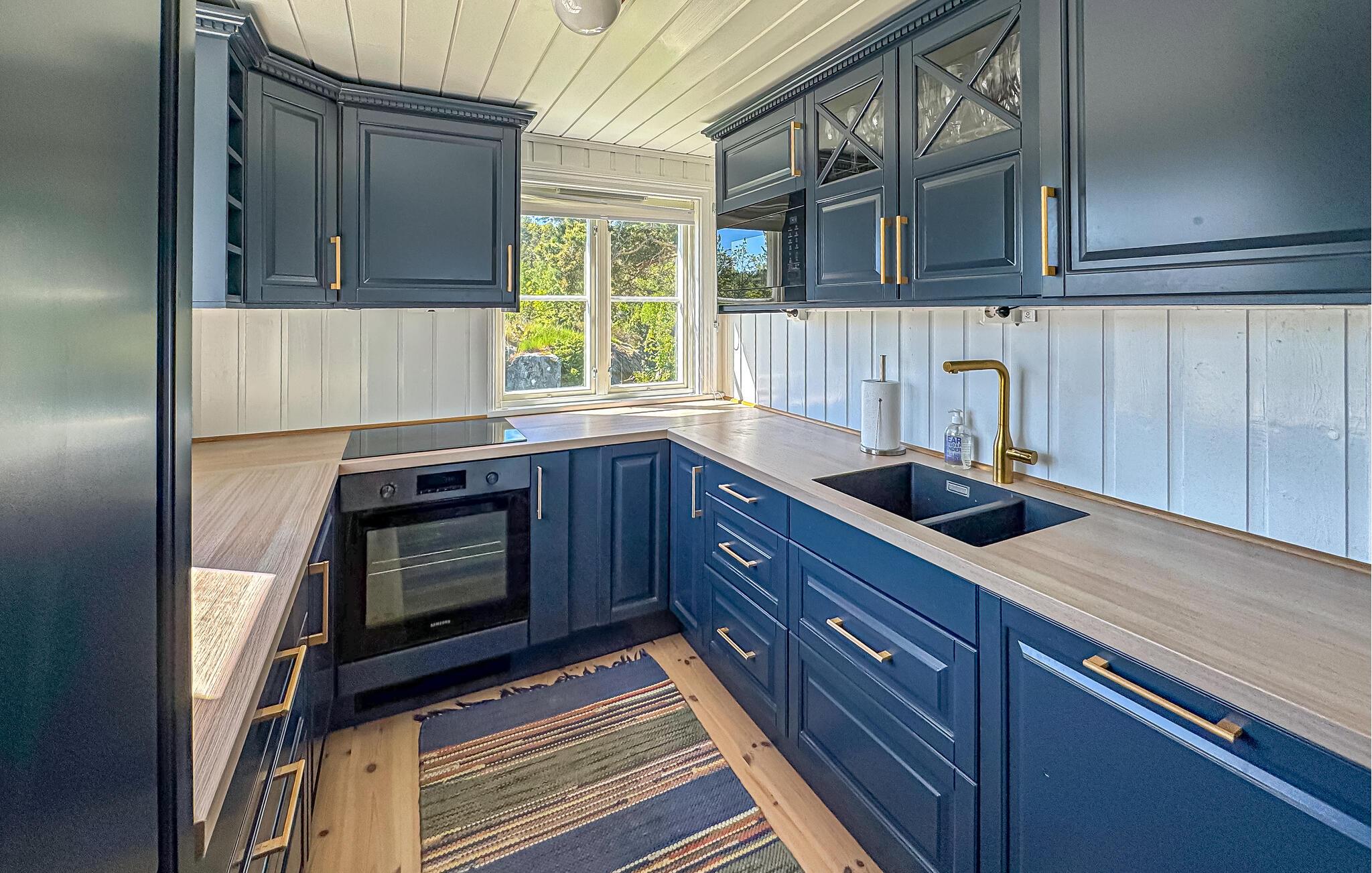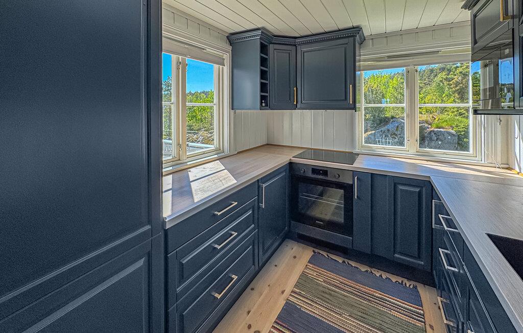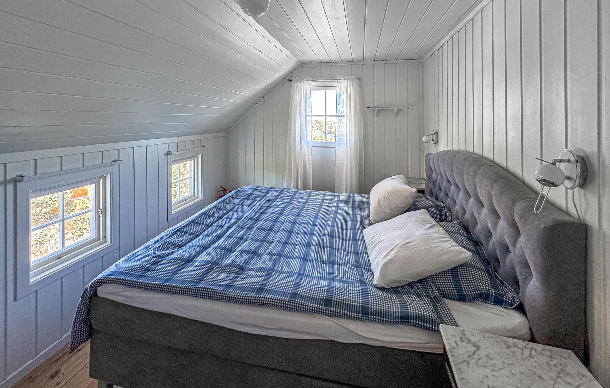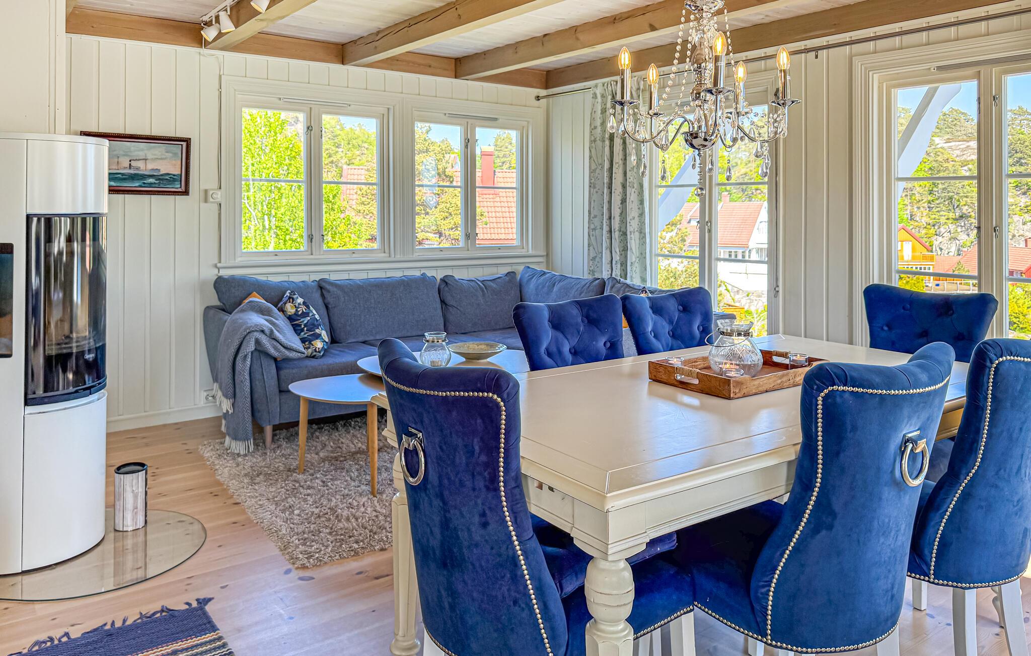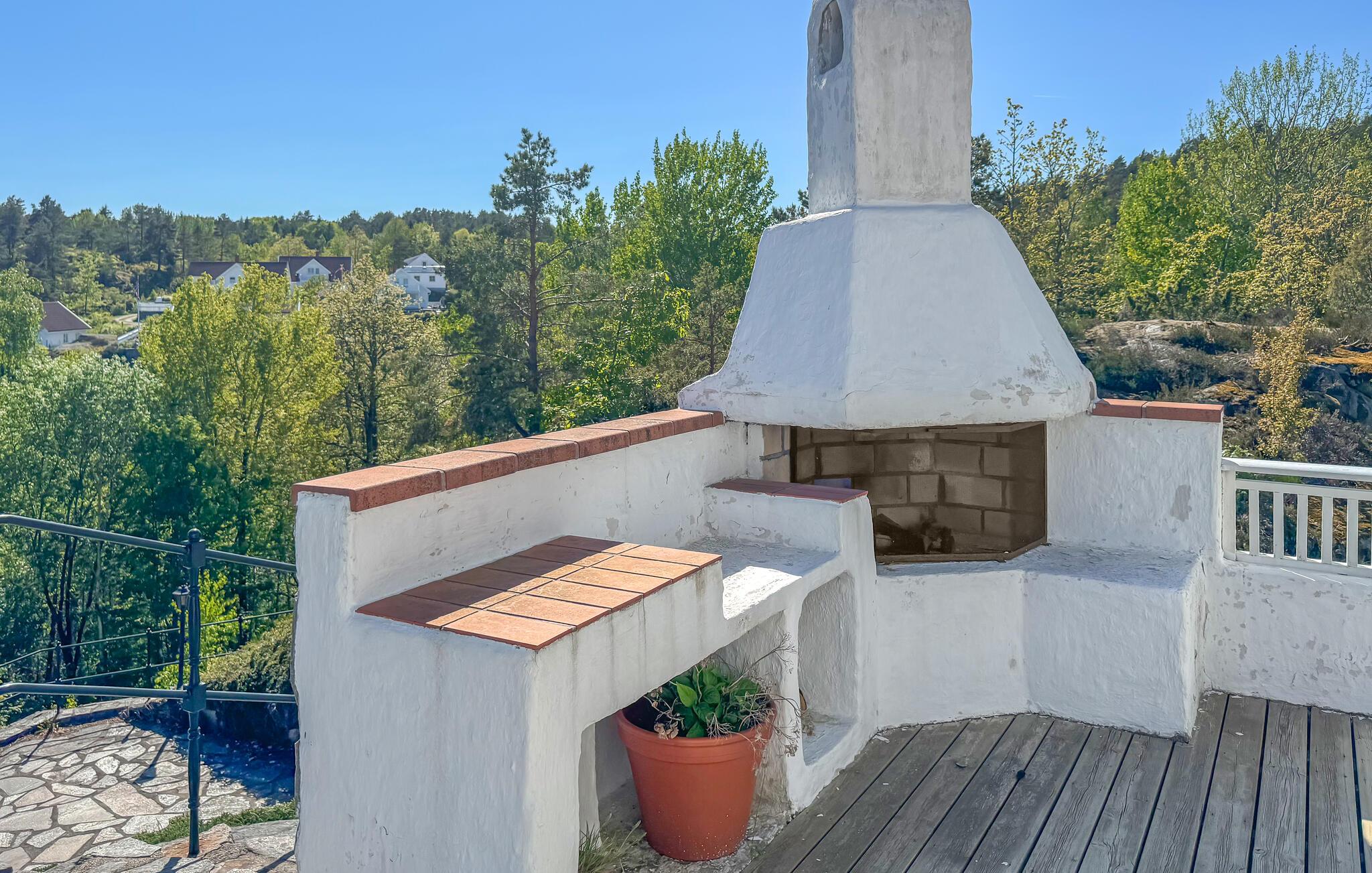 Tilbring en avslappende ferie i dette lyse og smakfullt innredede feriehuset som ligger i en åsside med vidstrakt utsikt over vannet. Den høye beliggenheten gir deg ikke bare fred og ro, men også en imponerende utsikt over det typiske norske kystlandskapet. Nyt avslappende stunder i den romslige stuen med hjørnesofa og vedovn i stilfulle omgivelser med mye naturlig lys. Lag mat sammen på det elegante kjøkkenet med vakker utsikt, eller nyt måltidene i den innbydende spisestuen med komfortable polstrede stoler og lysekrone. Små retreats med lesestoler og gulv-til-tak-vinduer innbyr også til opphold.