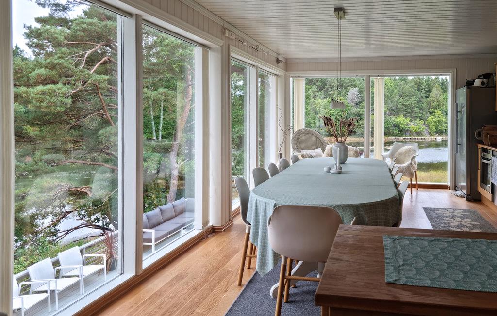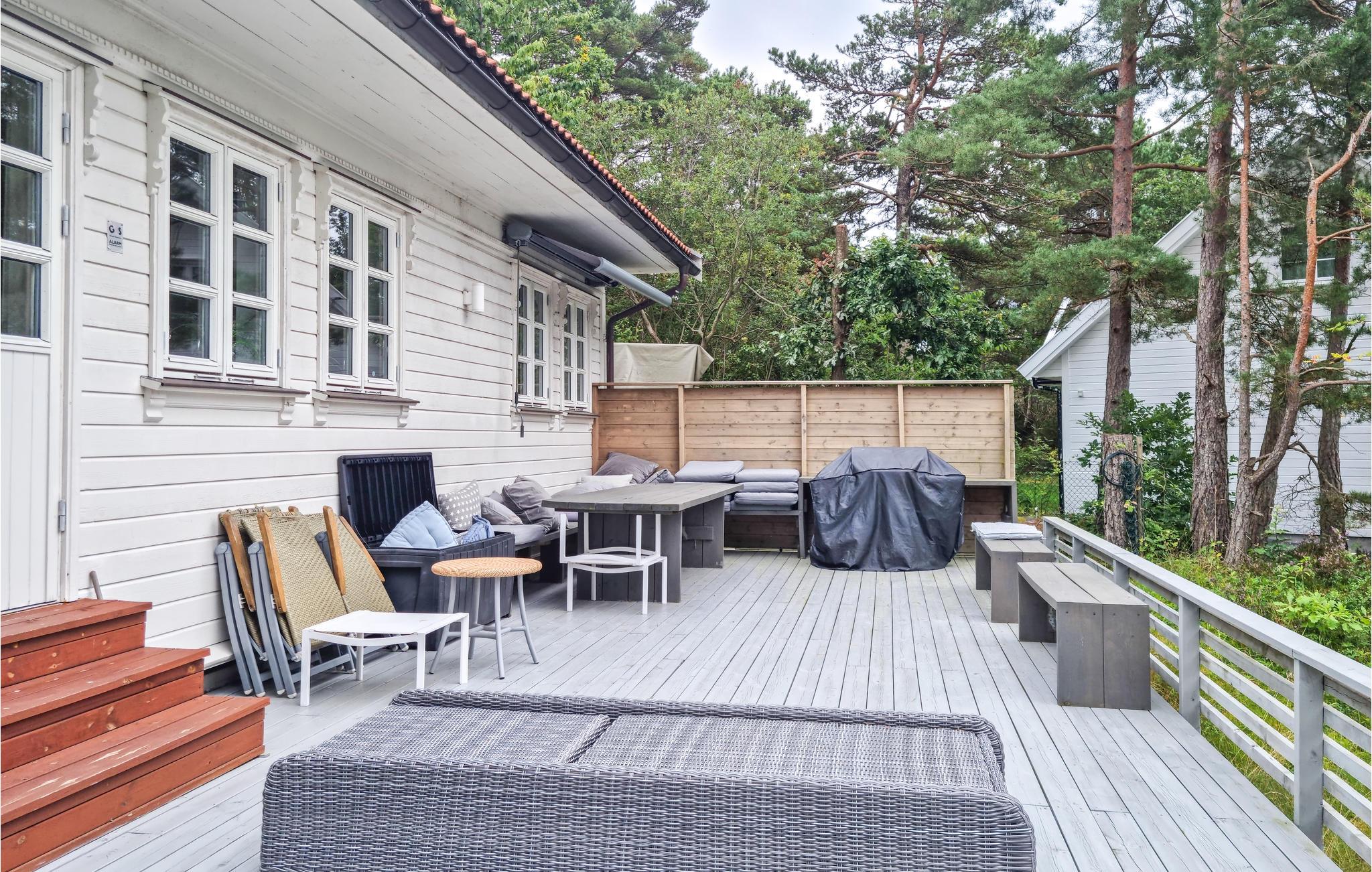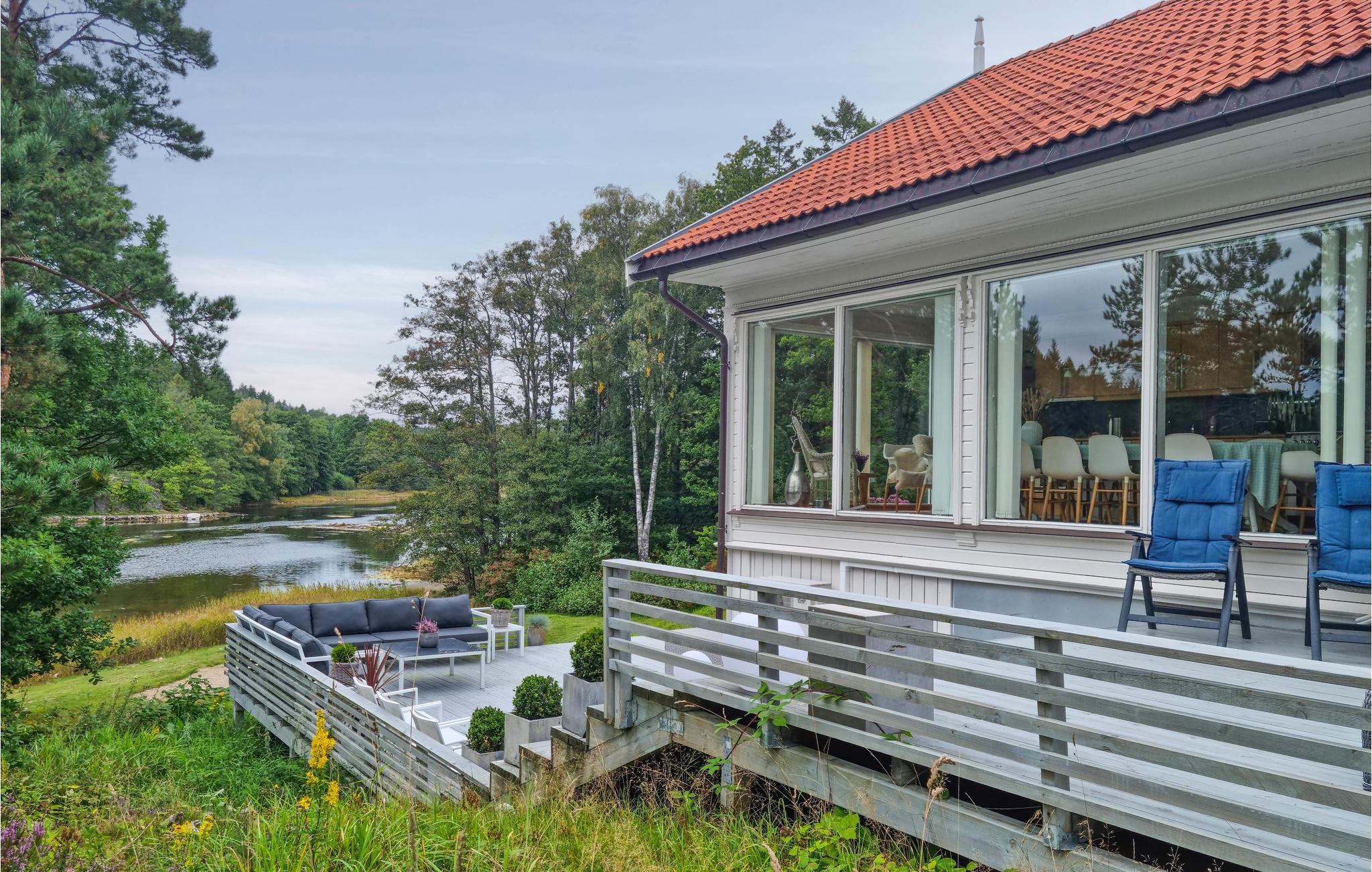 Reis med storfamilien eller flere vennefamilier til dette flotte feriehuset, som ønsker dere velkommen med svært god innredning og gjennomgående kvalitet. Bruk den store stuen som en sentral møteplass for familien og nyt panoramautsikten over terrassen og skjærgårdsnaturen. Mens de voksne setter seg godt til rette her om kvelden, kan de yngre arrangere filmkveld i 1. etasje. Sommerdager og -kvelder tilbringes utendørs av både store og små som nyter den solrike og barnevennlige eiendommen. Den store terrassen kombinerer kos og hygge med den vakre fjordnaturen.
