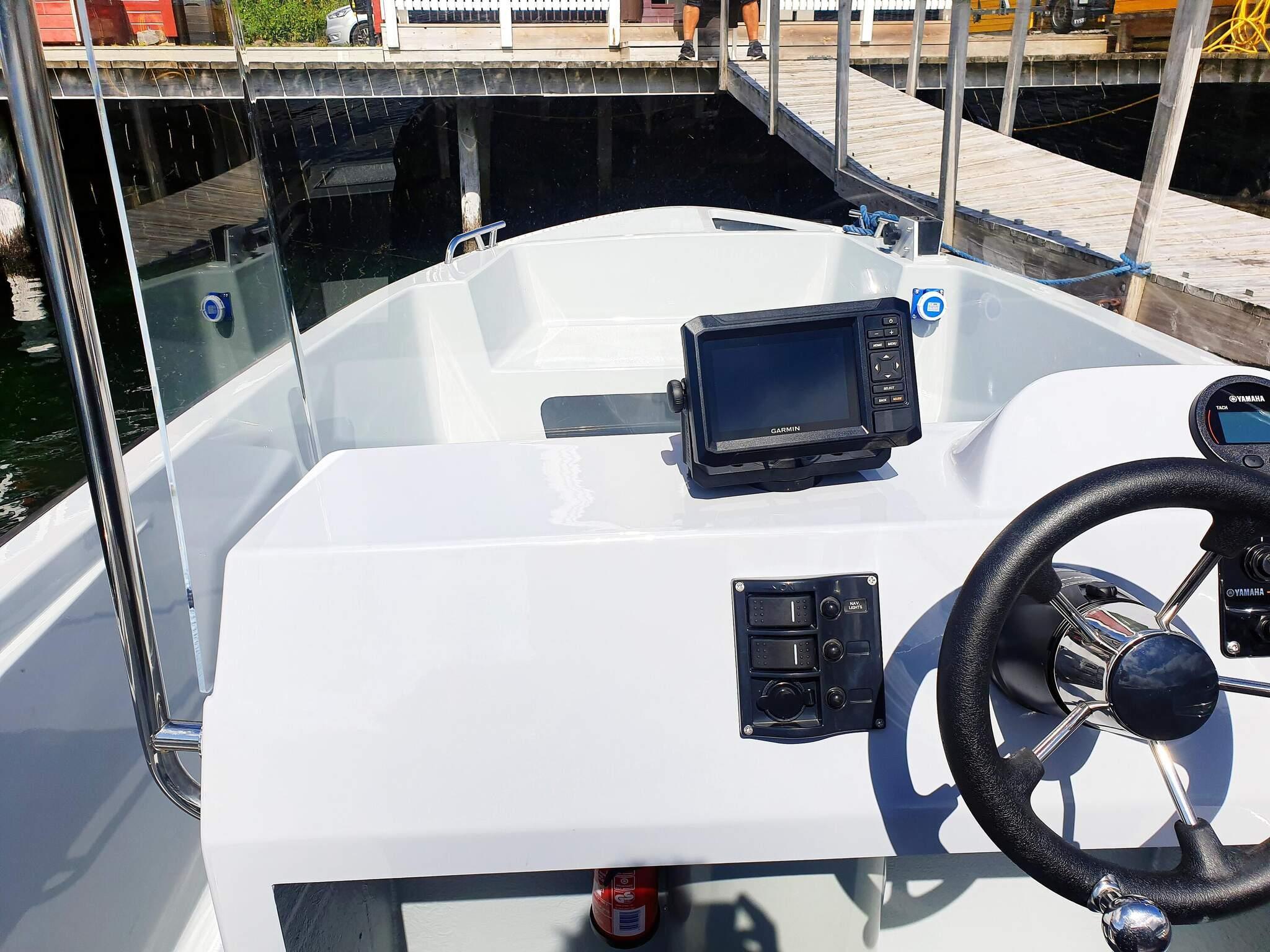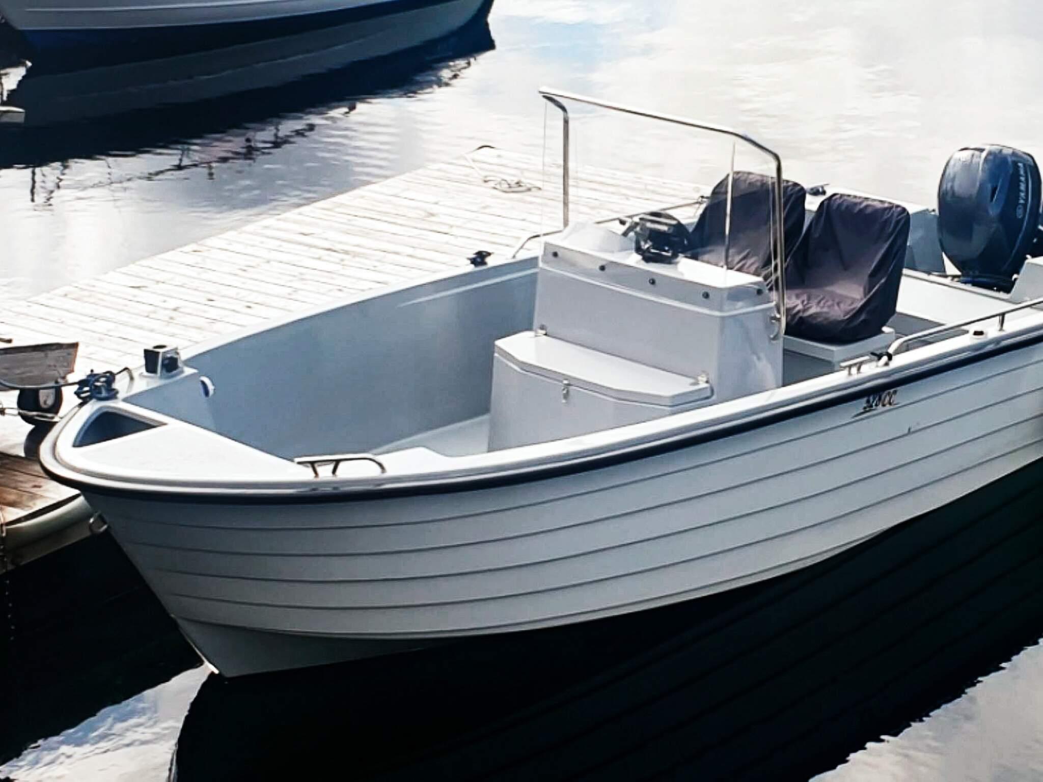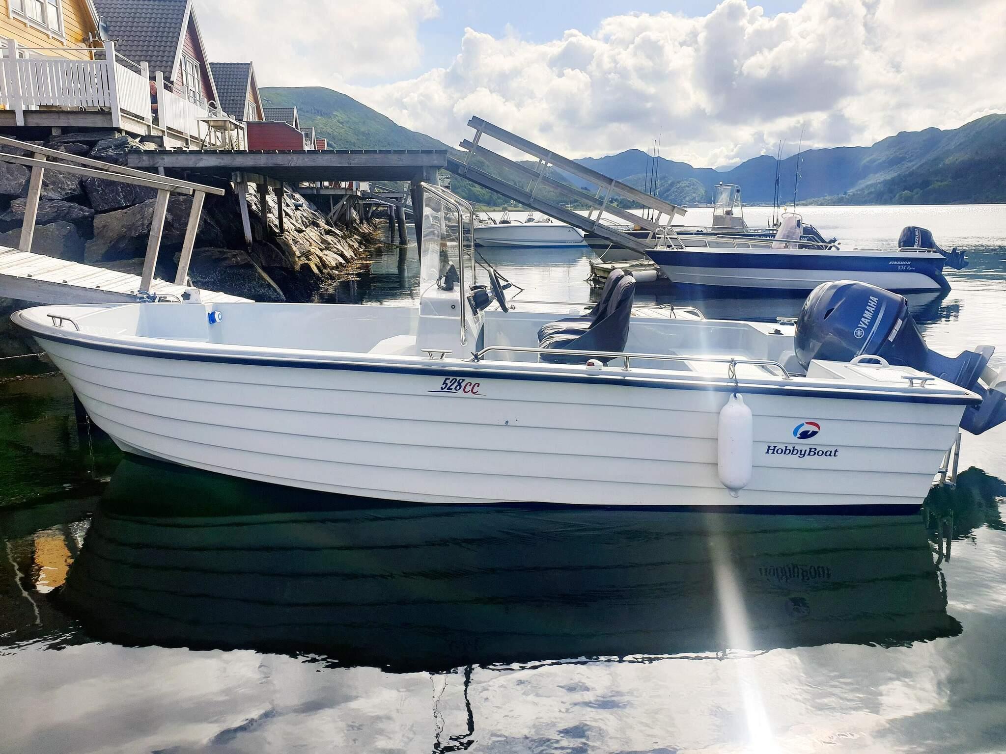 Ved flytebryggen utenfor sjøhuset er det til leie en 2023-modell 18 fots HobbyBoat 528CC med 70 HK Yamaha motor, styrekonsoll og Garmin 52 ekkolodd, gps og kartplotter og 6 stangholdere.