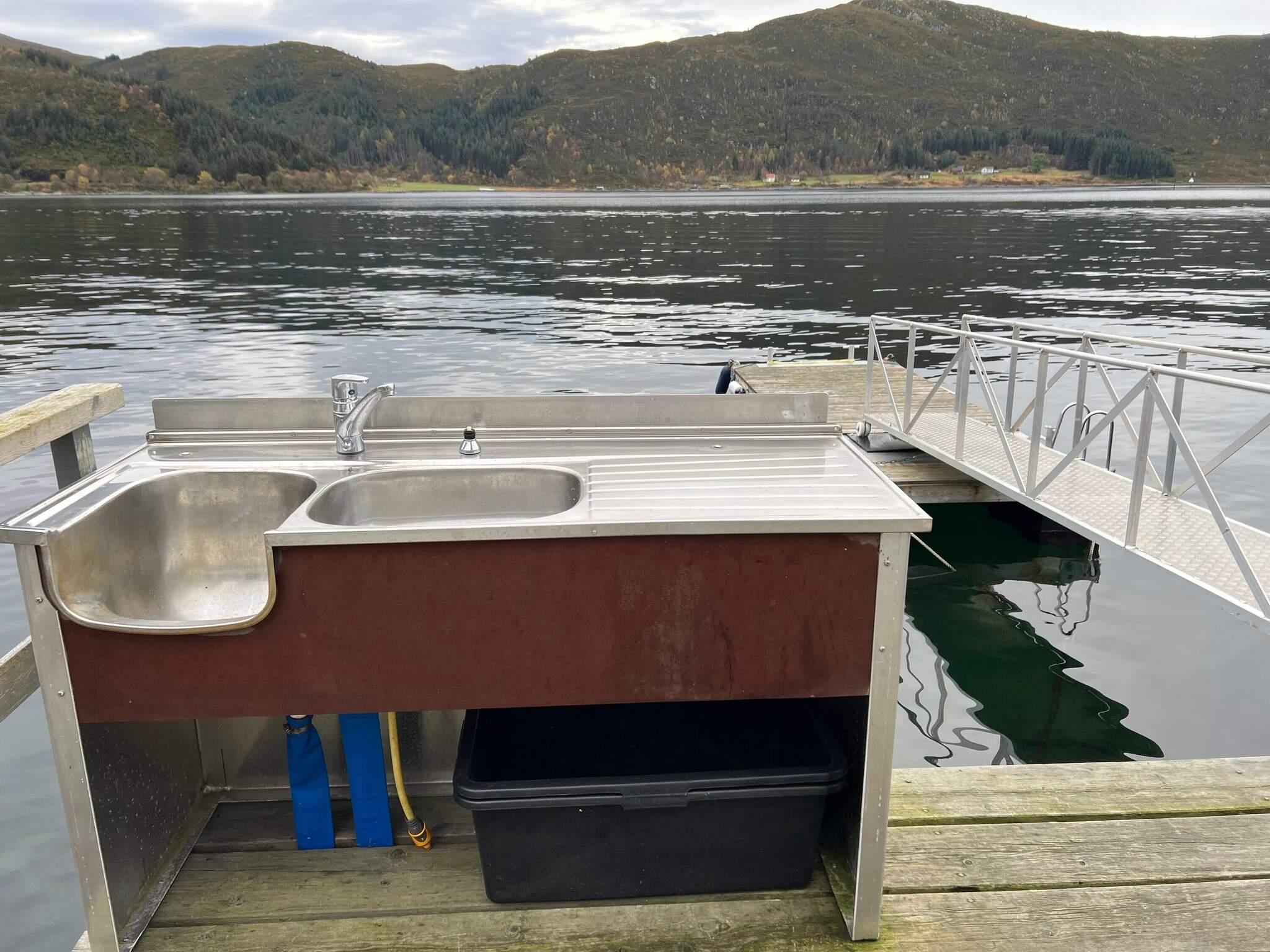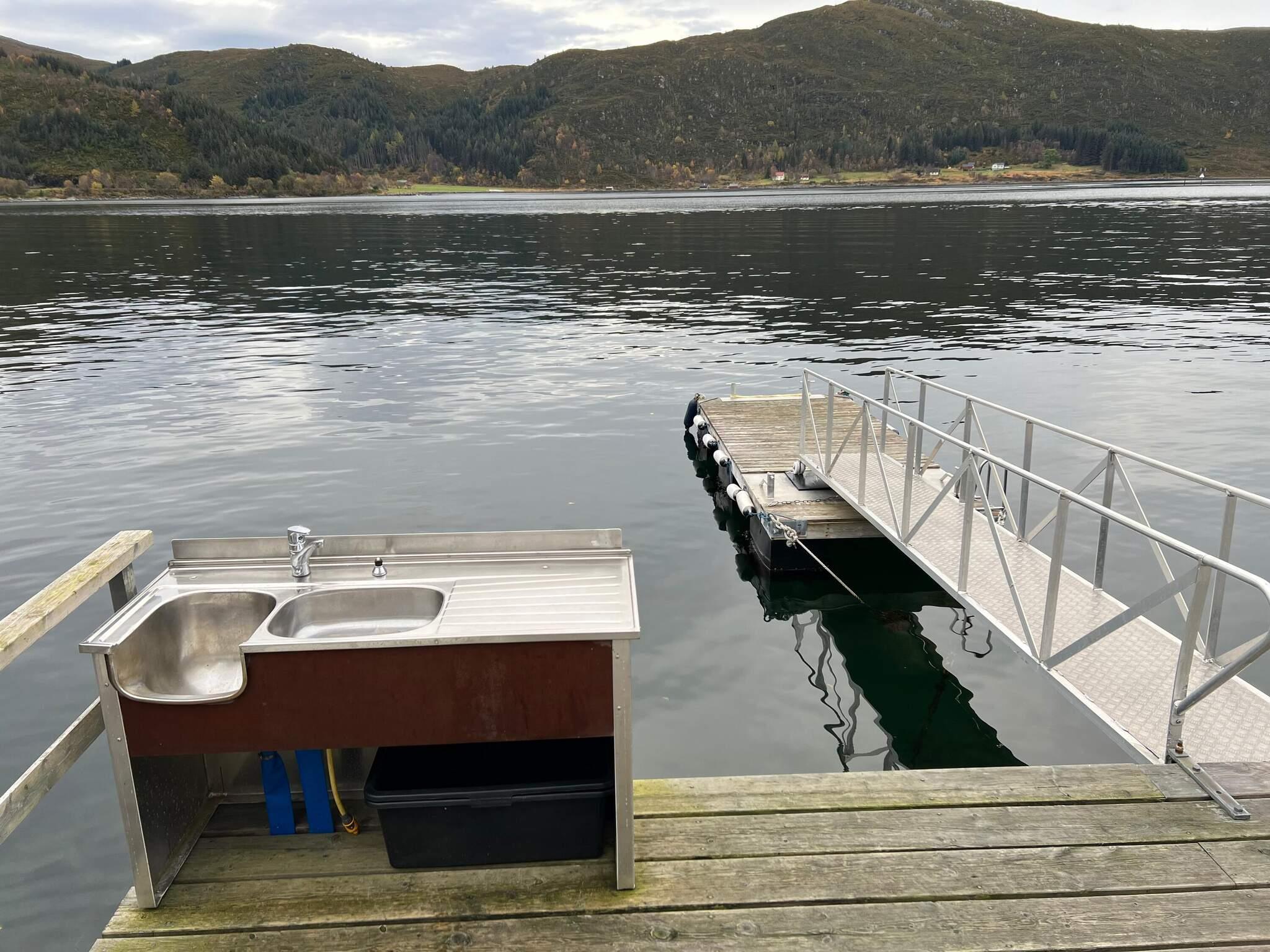 Overdekket fileteringsplass med vann og lys ved feriehuset. 10 meter til flytebryggen der leiebåten ligger: 1x 17 fots Pioner Multi, 70 HK Yamaha, kartplotter/GPS/ekkolodd og 6 stangholdere.