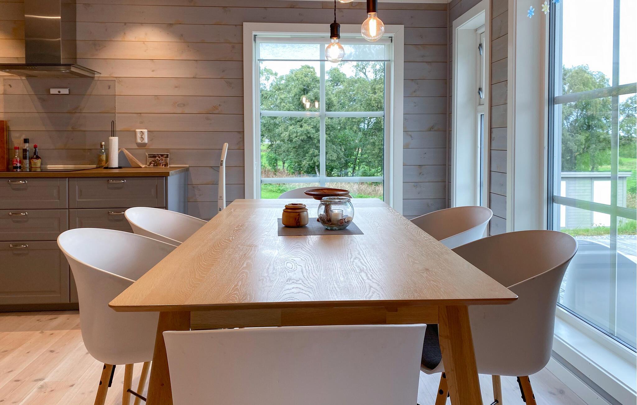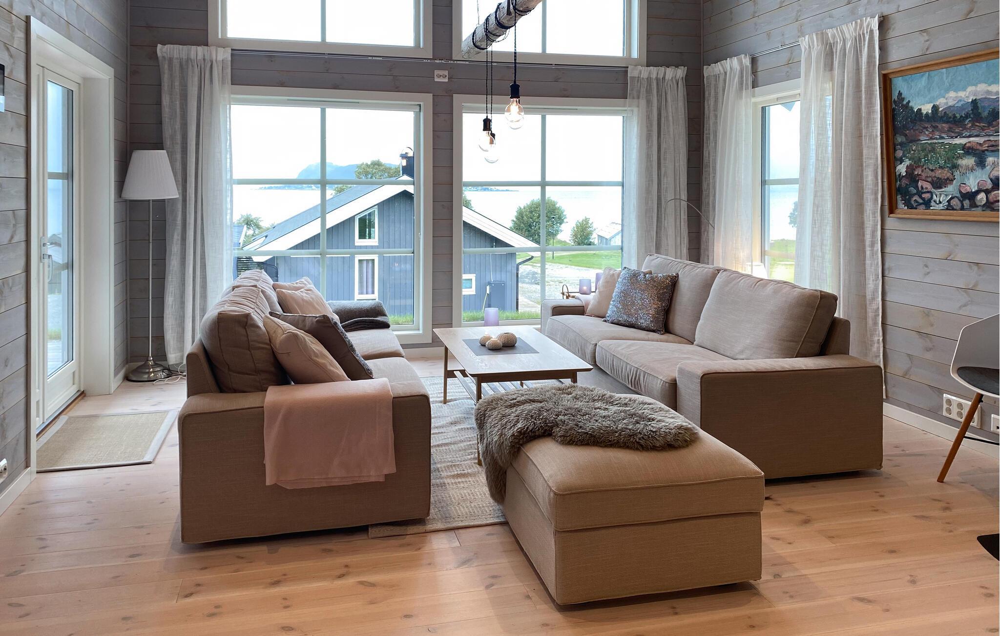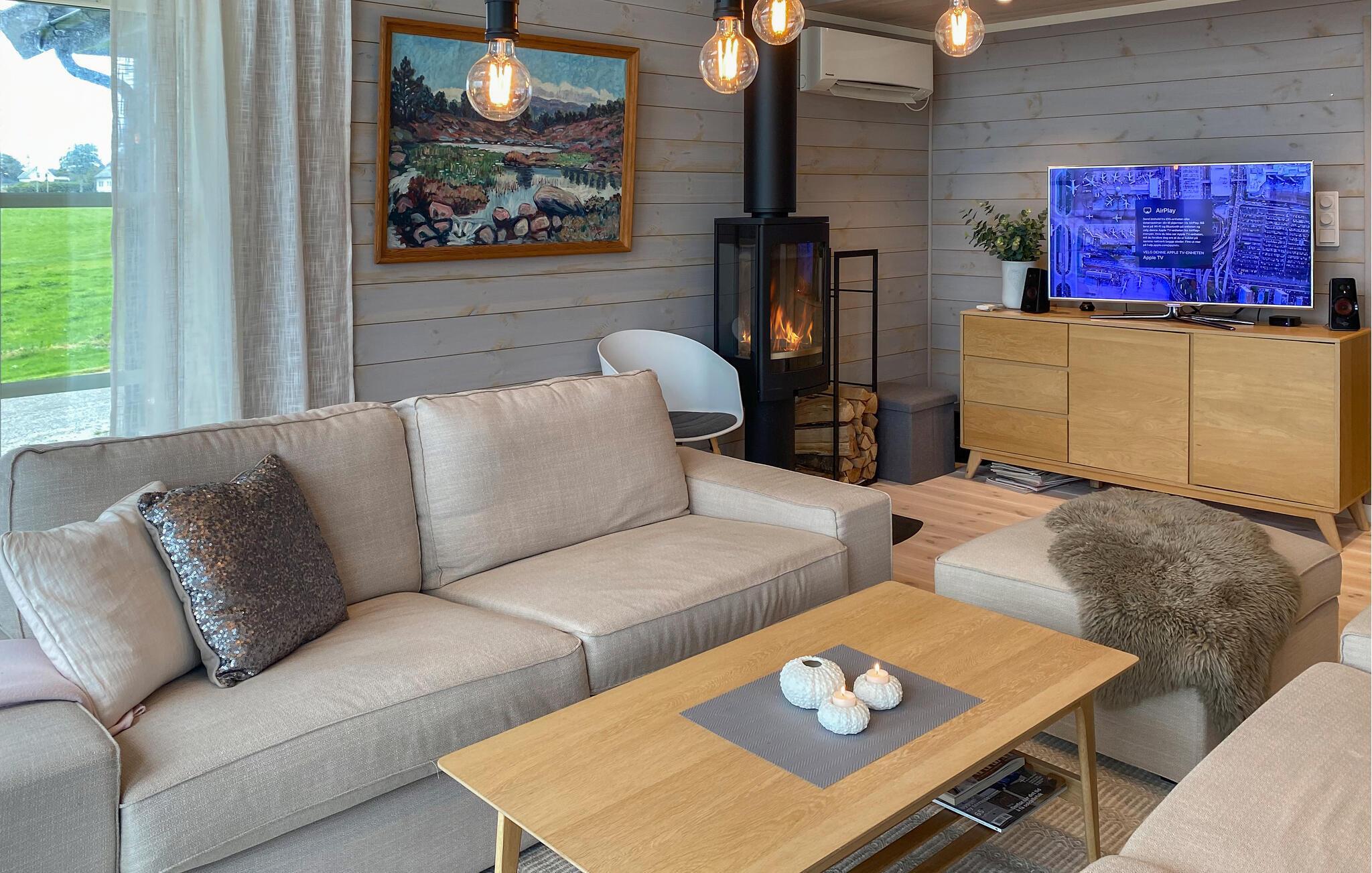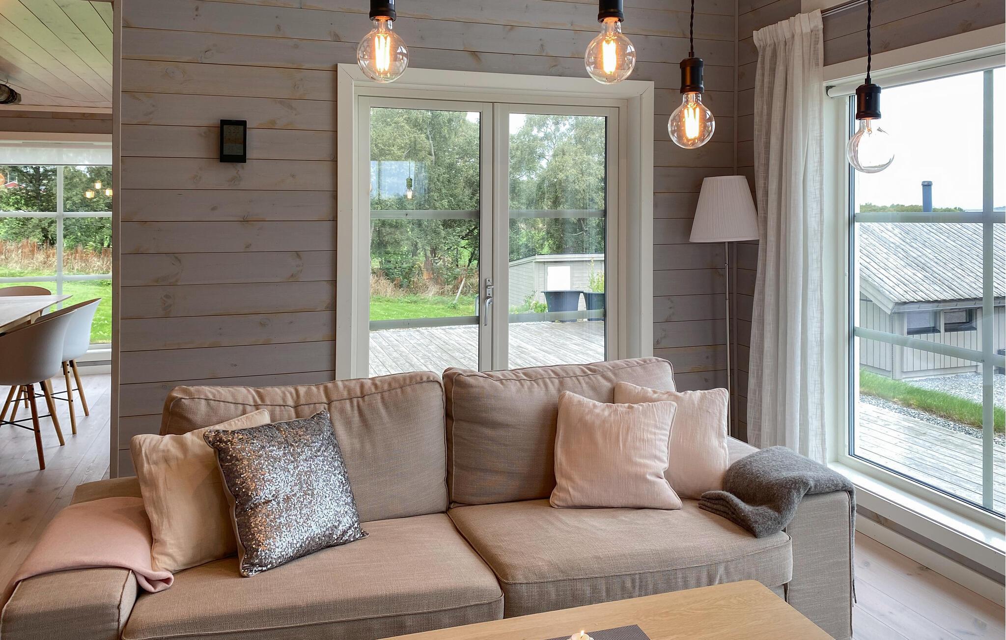 Opplev ren avslapning i dette stilfullt innredede feriehuset i Hildre. Den store vindusfronten slipper inn rikelig med lys og gir deg en fantastisk utsikt over vannet. Nyt komforten i de moderne møblene og tilbring koselige timer i den åpne planløsningen. På den romslige terrassen kan dere nyte måltider sammen utendørs og kjenne den friske sjøluften - et ideelt sted for å slappe av og nyte naturen til fulle.