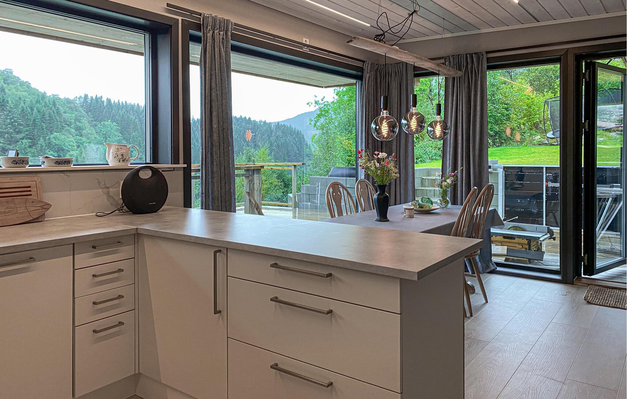Velkommen til dette idylliske feriehuset i nærheten av Hyllestad, hvor en skjermet tomt og fantastisk utsikt venter på deg. Den hyggelige innredningen kombinerer skandinavisk eleganse med hygge og skaper en avslappet atmosfære. De åpne oppholdsrommene er lyse og innbydende, og er ideelle for sosialt samvær med familie eller venner. Nyt de moderne fasilitetene mens du setter deg i båten i båthuset rett nedenfor huset og utforsker de vakre omgivelsene. Du kan også slappe av på den romslige terrassen og la blikket vandre over landskapet.