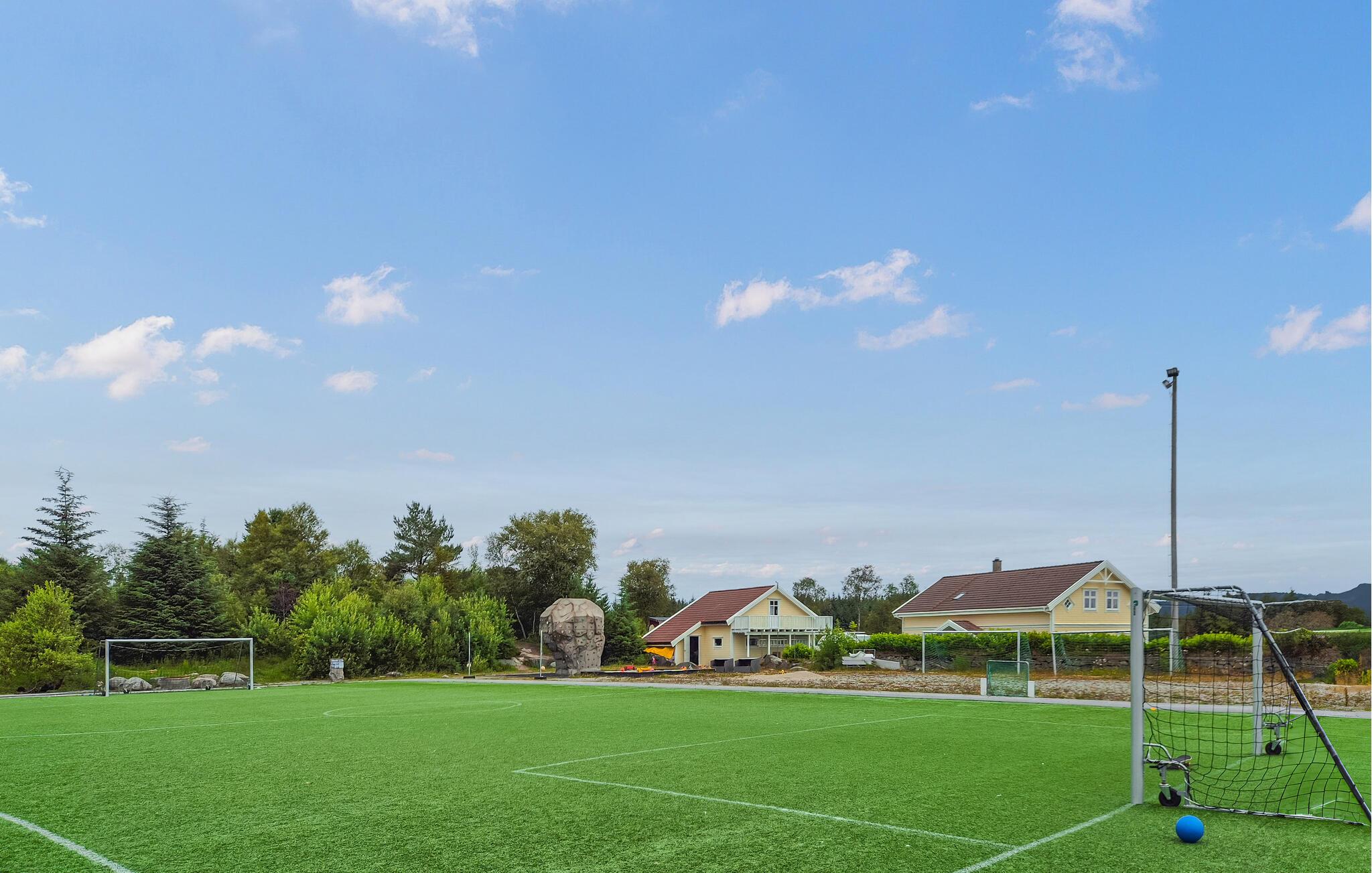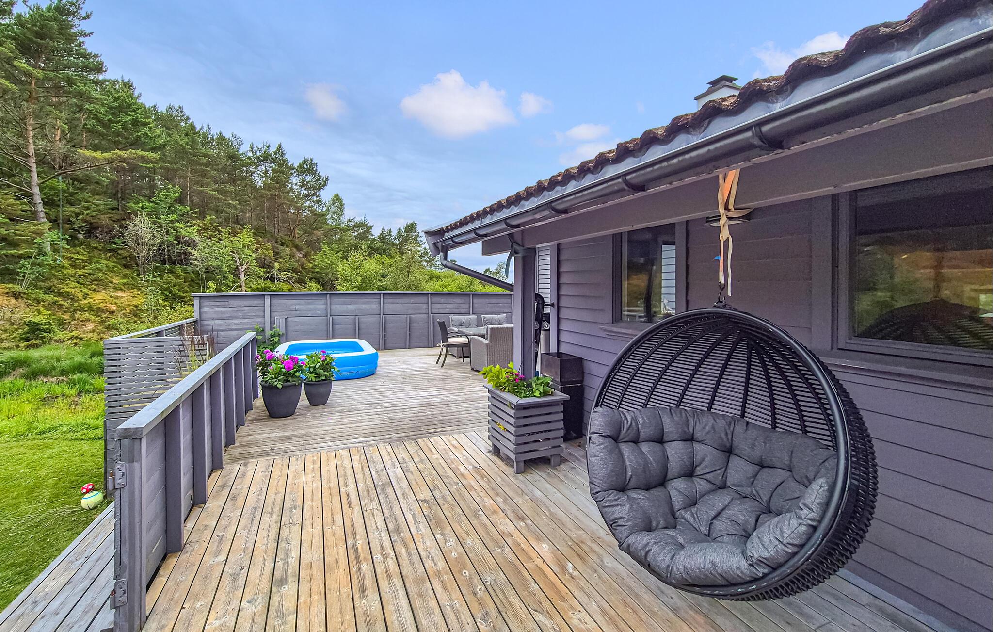 Huset er ideelt for familier med barn. Det har en stor hage med trampoline, klatrevegg og sklie, slik at de yngste kan leke og løpe rundt så mye de vil. Tenn bålpannen eller grillen om kvelden, og avrund dagen med et koselig måltid i det fri og et glass vin.