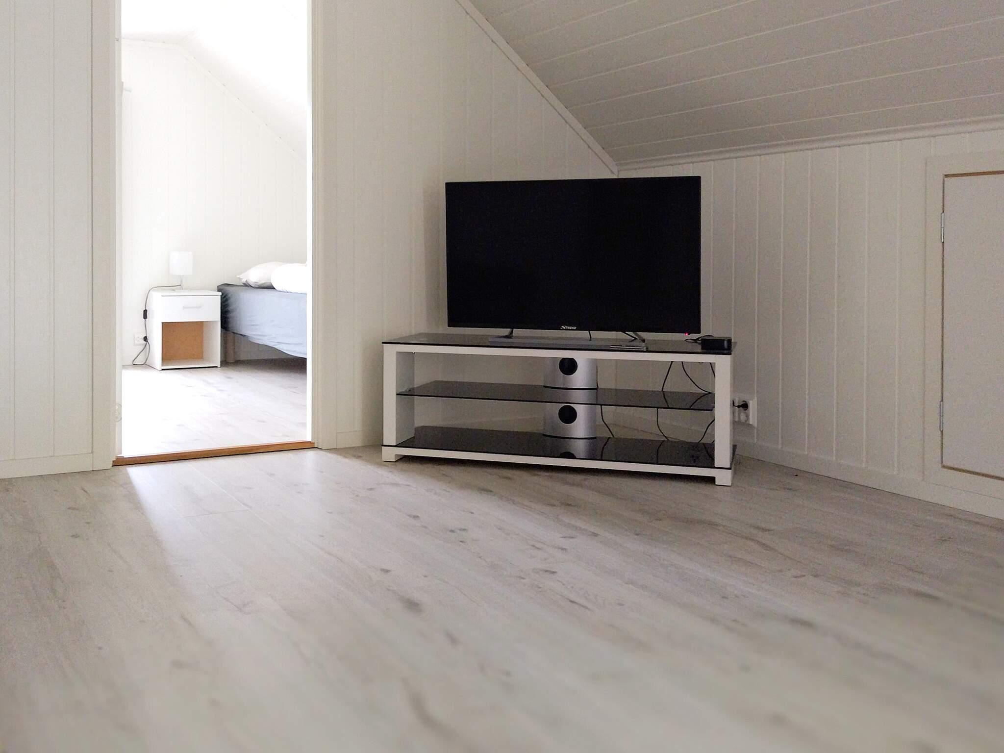 Hytta er smakfullt innredet og har loftstue med TV i tillegg til TV i stuen nede. 4 soverom, 2 nede og 2 oppe. Det er 2 enkeltsenger på hvert rom som kan settes sammen til dobbeltsenger. I stuen er det store vinduer vendt mot sjøsiden, noe som gjør rommet lyst og trivelig og gir en følelse av nærkontakt med naturen. Gratis internett/wifi med stor kapasitet og TV med norske og internasjonale kanaler, deriblant flere tyske.