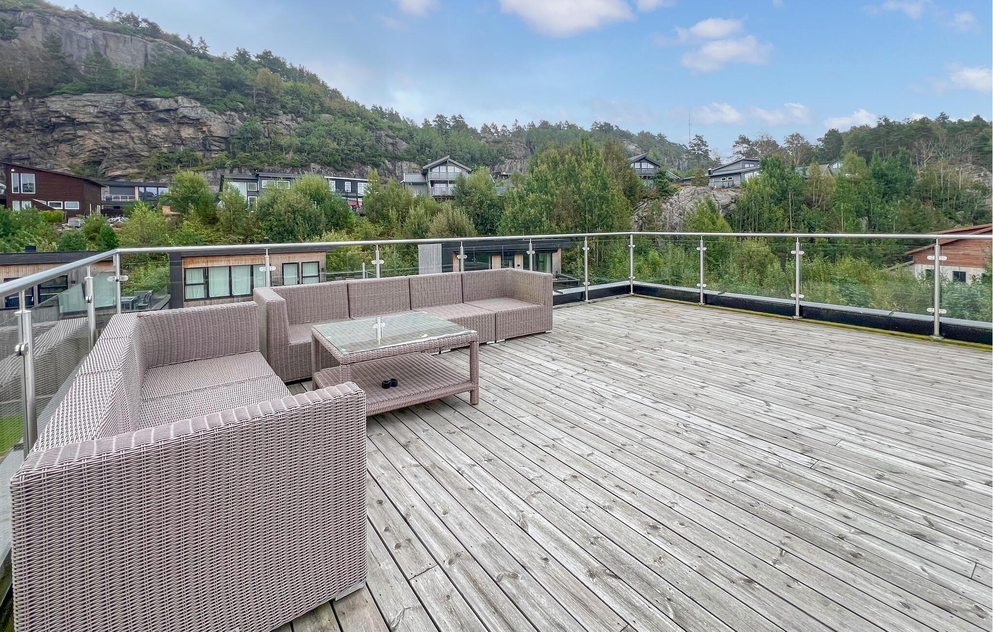 Gå ut på takterrassen ved første solstråle og beundre det fantastiske fjellandskapet som åpner seg foran deg. Spis frokost med dette spesielle bakteppet som omgir deg med fred og trygghet. Len deg tilbake og fordyp deg i ferielesning. Og når kvelden nærmer seg slutten, kan du runde av dagen med et glass vin i godt selskap.