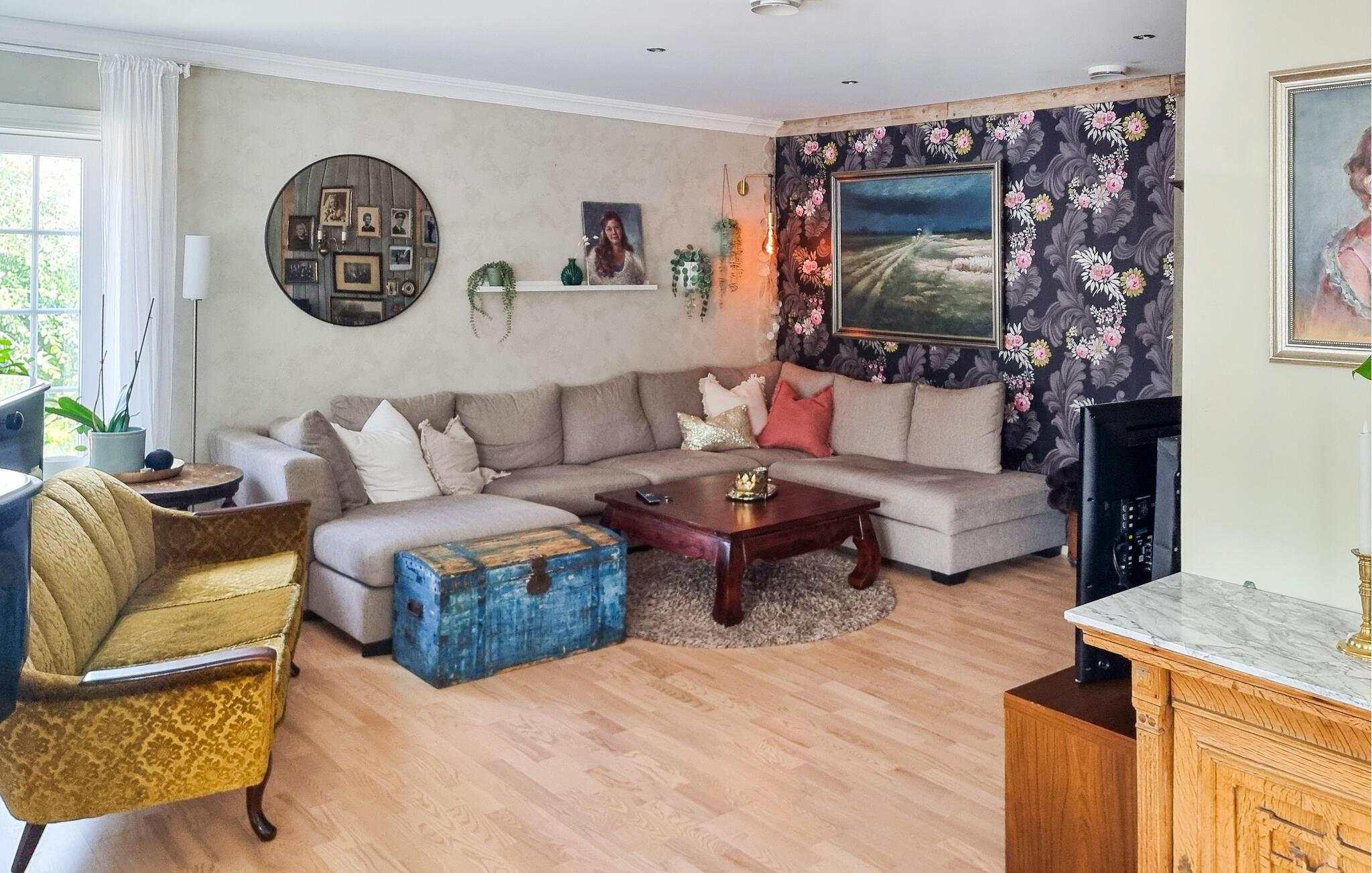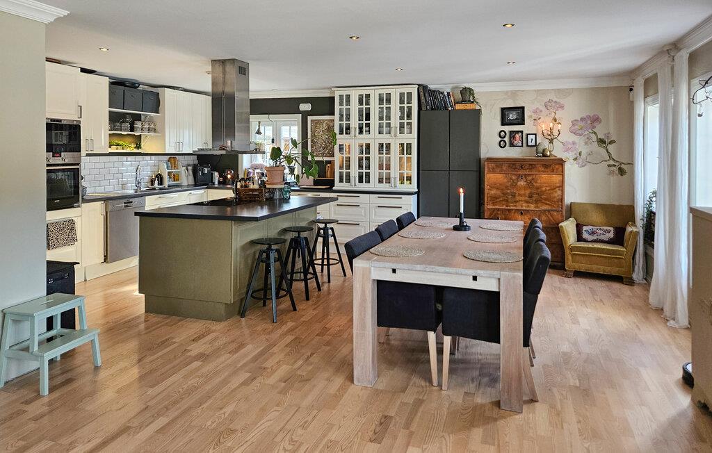 Nyt den romantiske og hjemmekoselige stilen i feriehuset, som skaper en helt spesiell stemning og en koselig atmosfære. Server den første koppen kaffe om morgenen ved kjøkkenbenken på det romslige kjøkkenet, og tilbered frokosten sammen med hele familien. Her kan dere også lage mat gjennom hele dagen, akkurat som hjemme. Mange komfortable sitteplasser sørger for at du finner ditt helt eget private sted å slappe av i dette feriehuset. Det er en koselig atmosfære overalt. Lag musikk sammen, eller møt opp til avslappede familiekvelder ved den knitrende vedovnen. Boblebadet og utendørsbassenget byr også på ren avslapning.