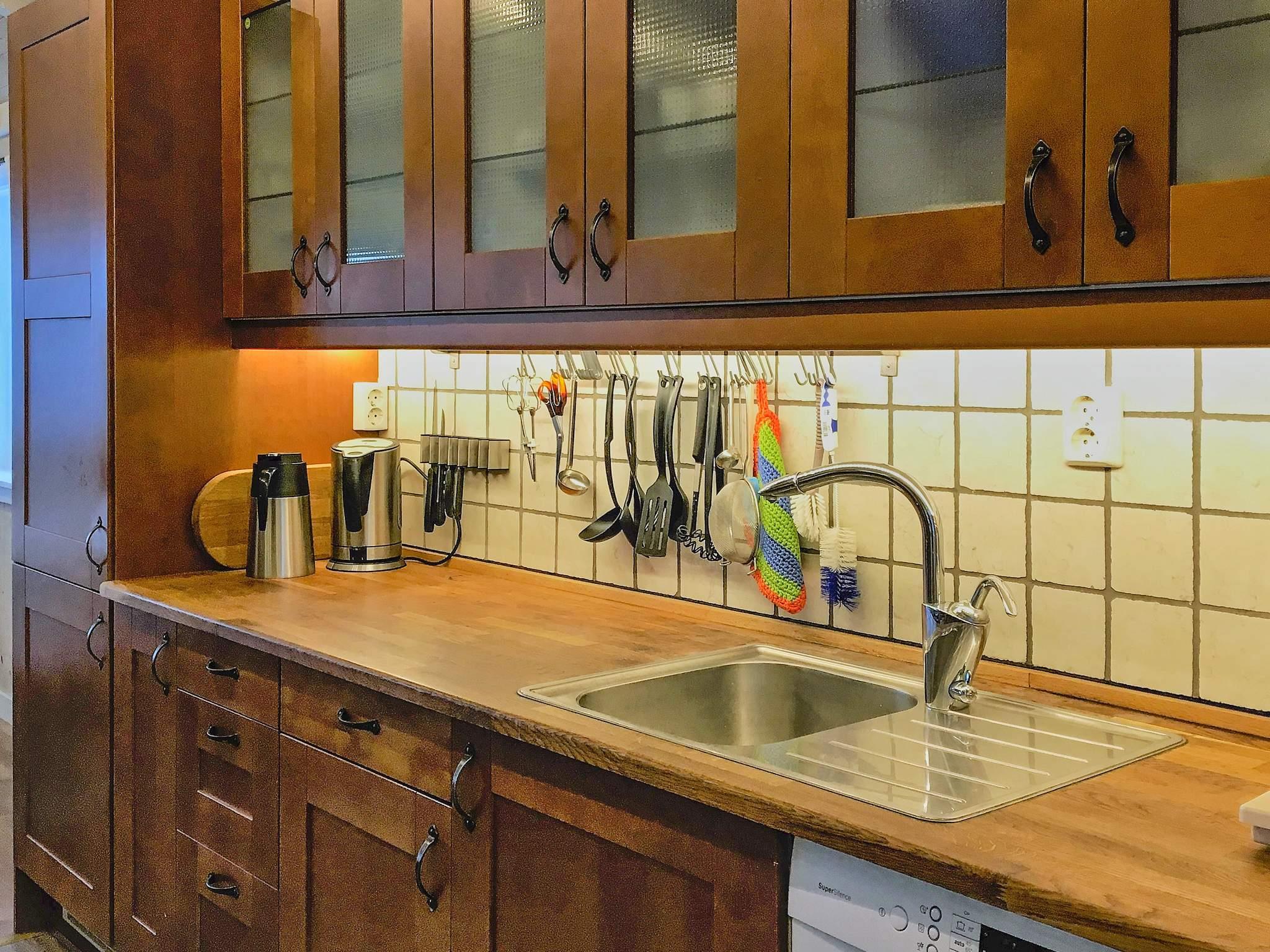 Kjøkkenavd.: høy stol, El-komfyr, kjøleskap, fryser 200 - 249 l, mikro, kjøkkenvifte, oppvaskmask., vaskemask., kaffetrakter