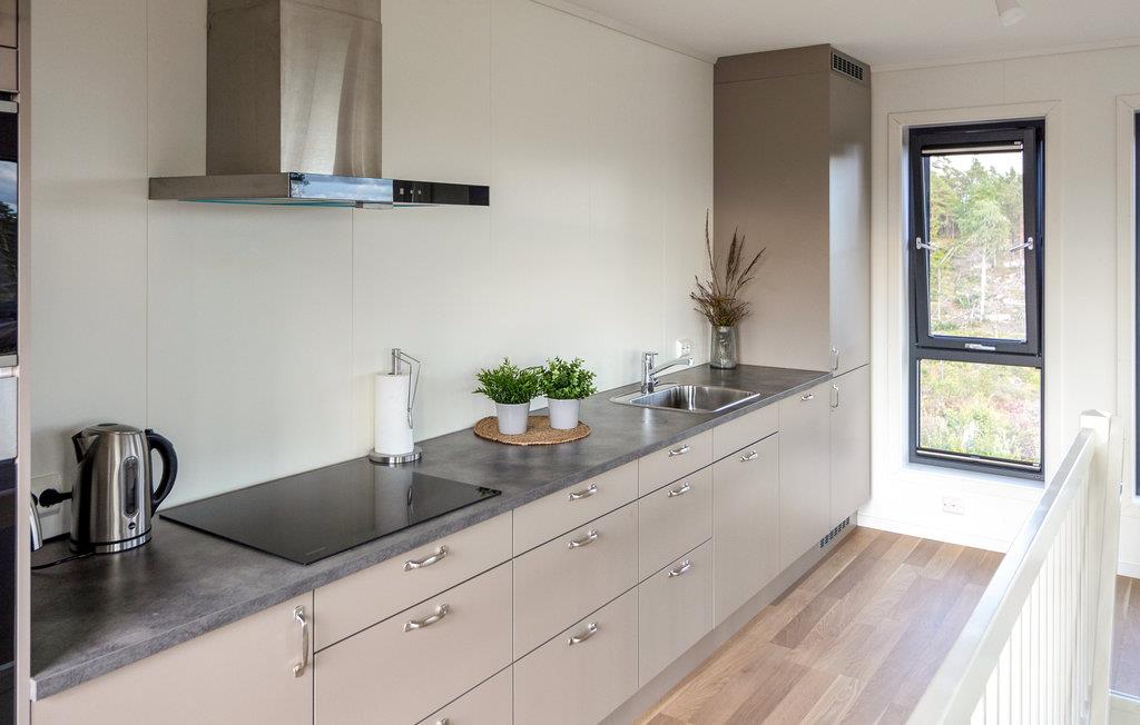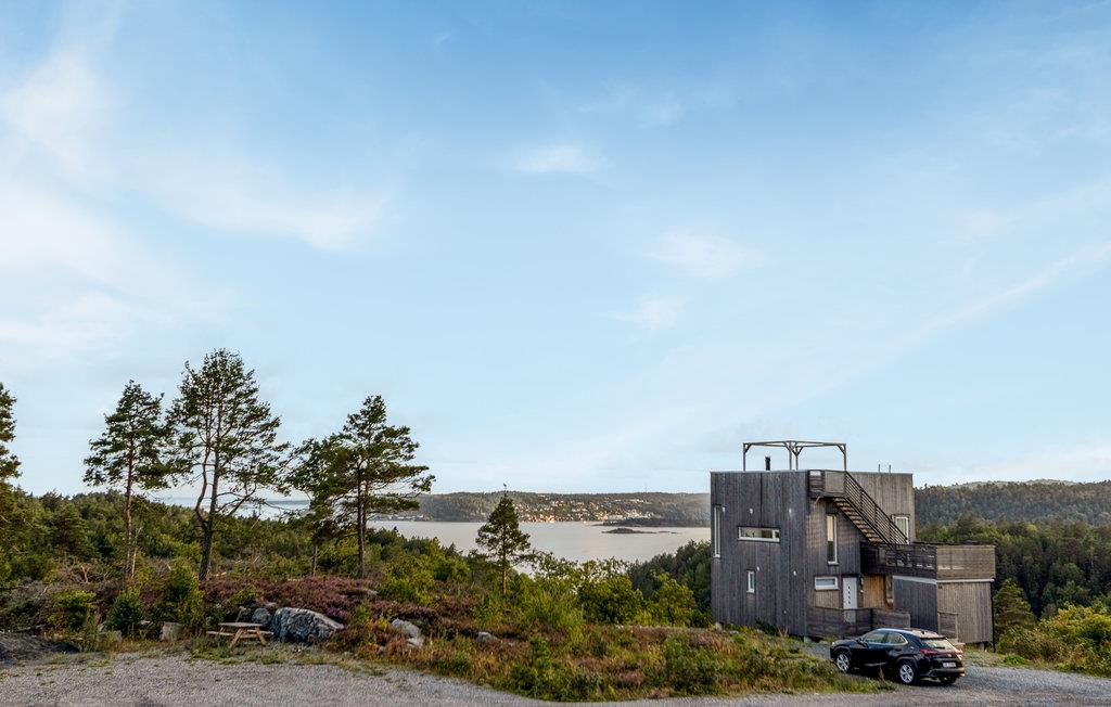 Vakkert, moderne hus nær fjorden på Sørlandet.