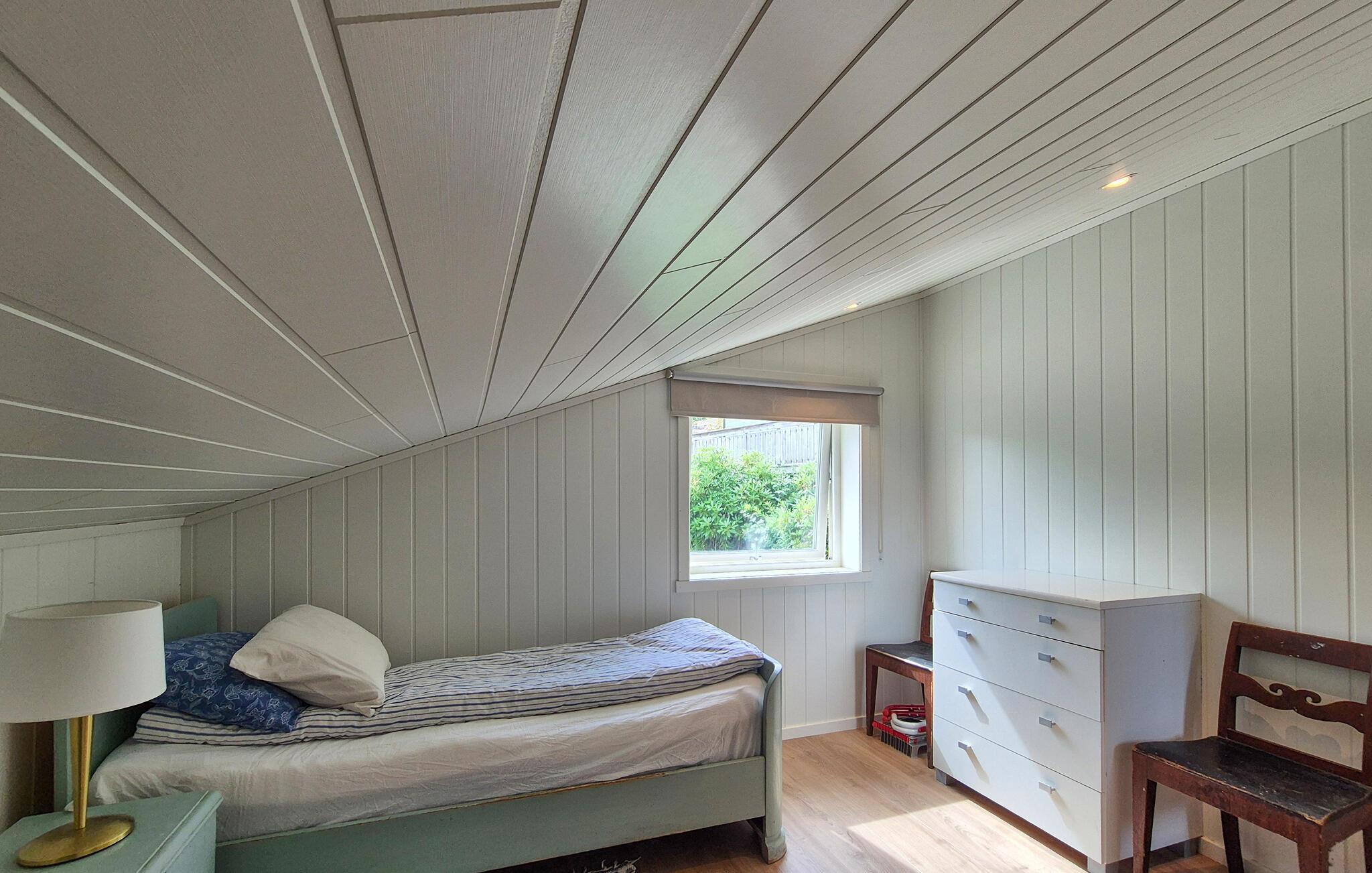 Med en fortryllende utsikt over havet og en koselig atmosfære, ønsker dette smakfullt innredede huset deg velkommen. Her kan du komme deg bort fra alt i fredelige omgivelser og slappe av sammen med dine nærmeste. Lag deilige retter på det vakre kjøkkenet med åpen kjøkkenløsning, og nyt måltidene og morsomme spillkvelder ved det innbydende spisebordet. I den koselige stuen kan du slappe av, la blikket vandre over vannet og fordype deg i en god bok i lesestolen.
