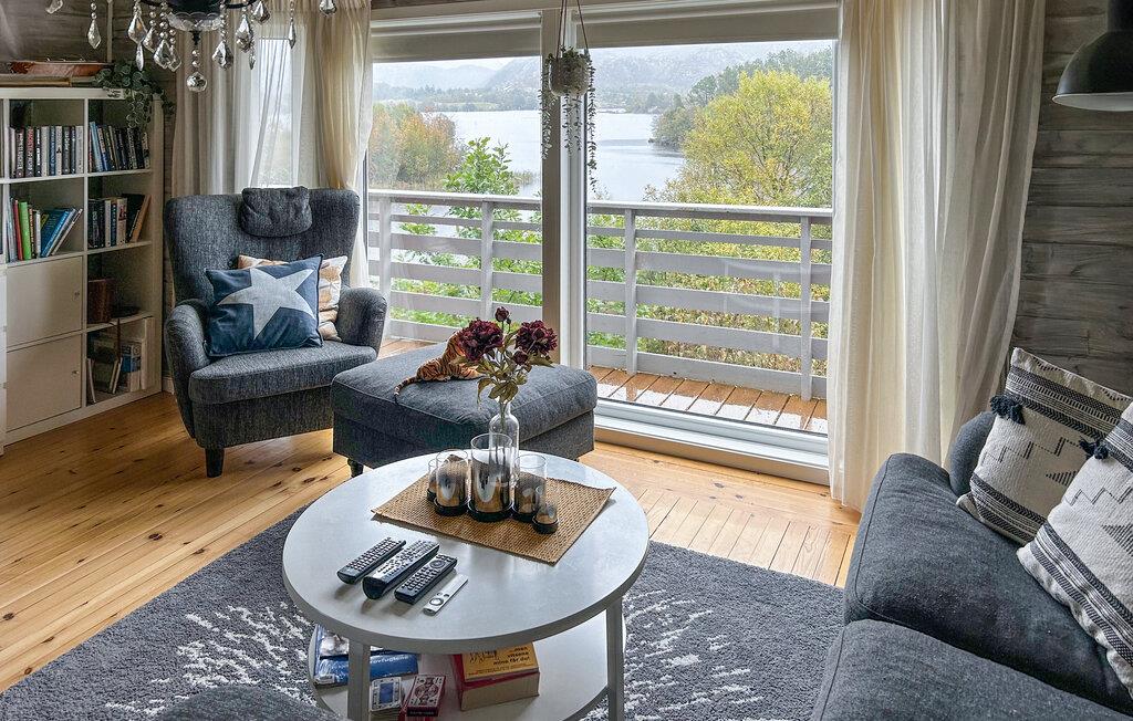 Den koselige trehytta rett ved Storavatnet byr på en varm og innbydende atmosfære. Den koselige vedovnen, vinduene som går fra gulv til tak og de komfortable møblene skaper en harmonisk atmosfære. Nyt avslappende kvelder i den komfortable sofaen og lenestolene mens du ser på film eller spiller brettspill.