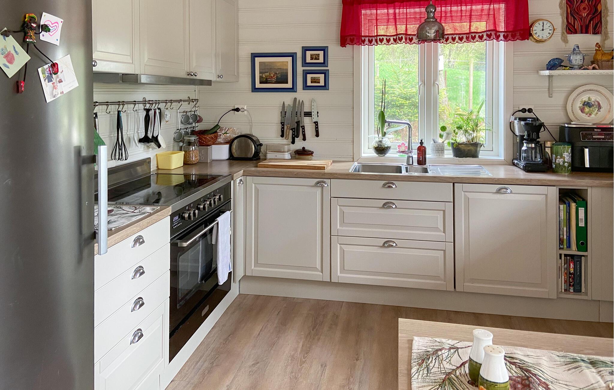 Dette koselige feriehuset er det perfekte stedet å legge den hektiske hverdagen bak seg og nyte den hjemmekoselige atmosfæren til det fulle. Trehuset byr på en koselig atmosfære i to etasjer, som kompletteres av vedovnen, vinduene som går fra gulv til tak og den attraktive møbleringen. Mens du setter deg godt til rette i sofaene og lenestolene om kvelden, kan barna slå seg ned i underholdningsområdet i andre etasje for å se film eller spille spill.