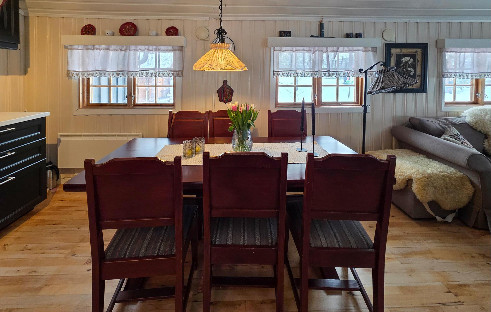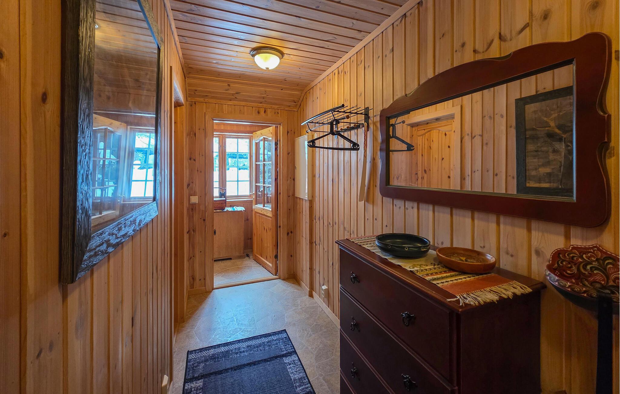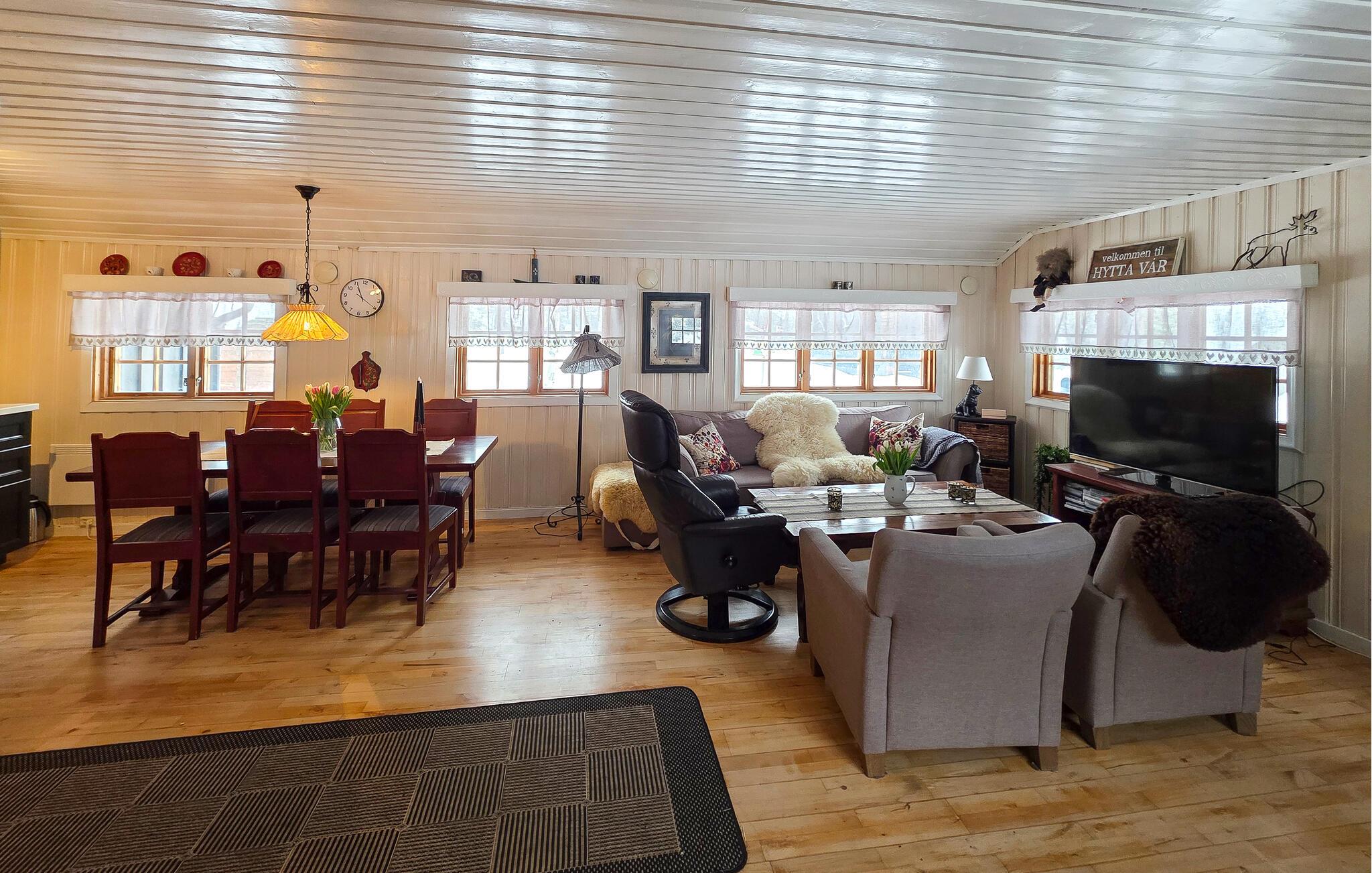 Stig inn og kjenn på den varme, autentiske atmosfæren i denne hytta nær Sundsbarmvatnet. Den åpne stueavdelingen er innredet med komfortable sofaer og rustikke tremøbler. Kos deg ved vedovnen og lytt til knitringen fra peisen. Slå deg ned ved spisebordet og nyt måltidene sammen. Det funksjonelle kjøkkenet har alt du trenger for å tilberede måltidene dine. Etter en aktiv dag kan du nyte den beroligende varmen i badstuen med trepanel og slappe av i musklene.